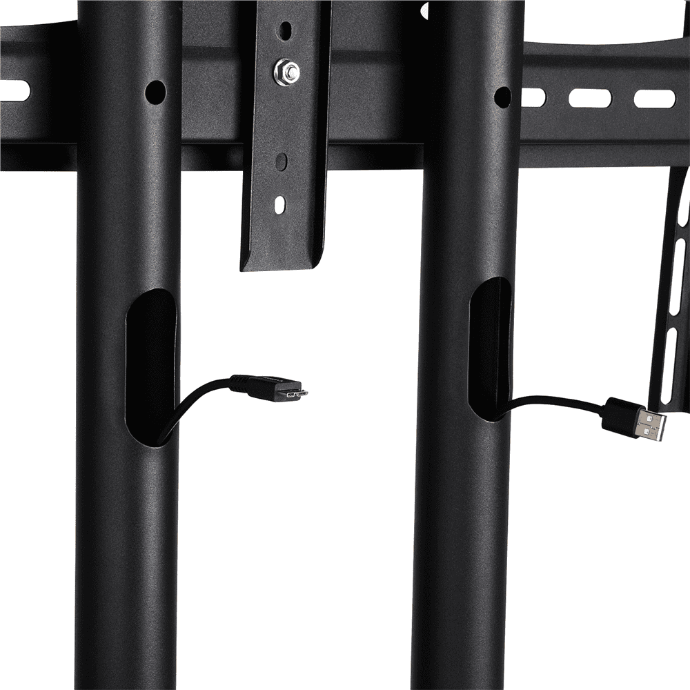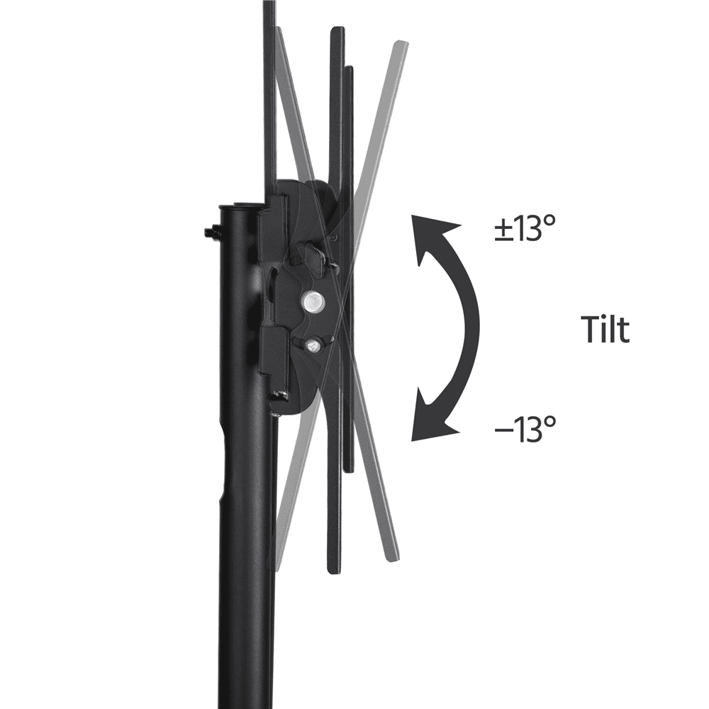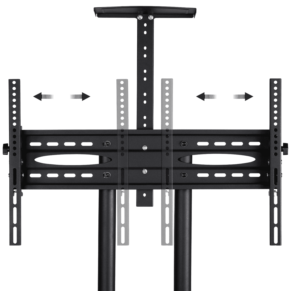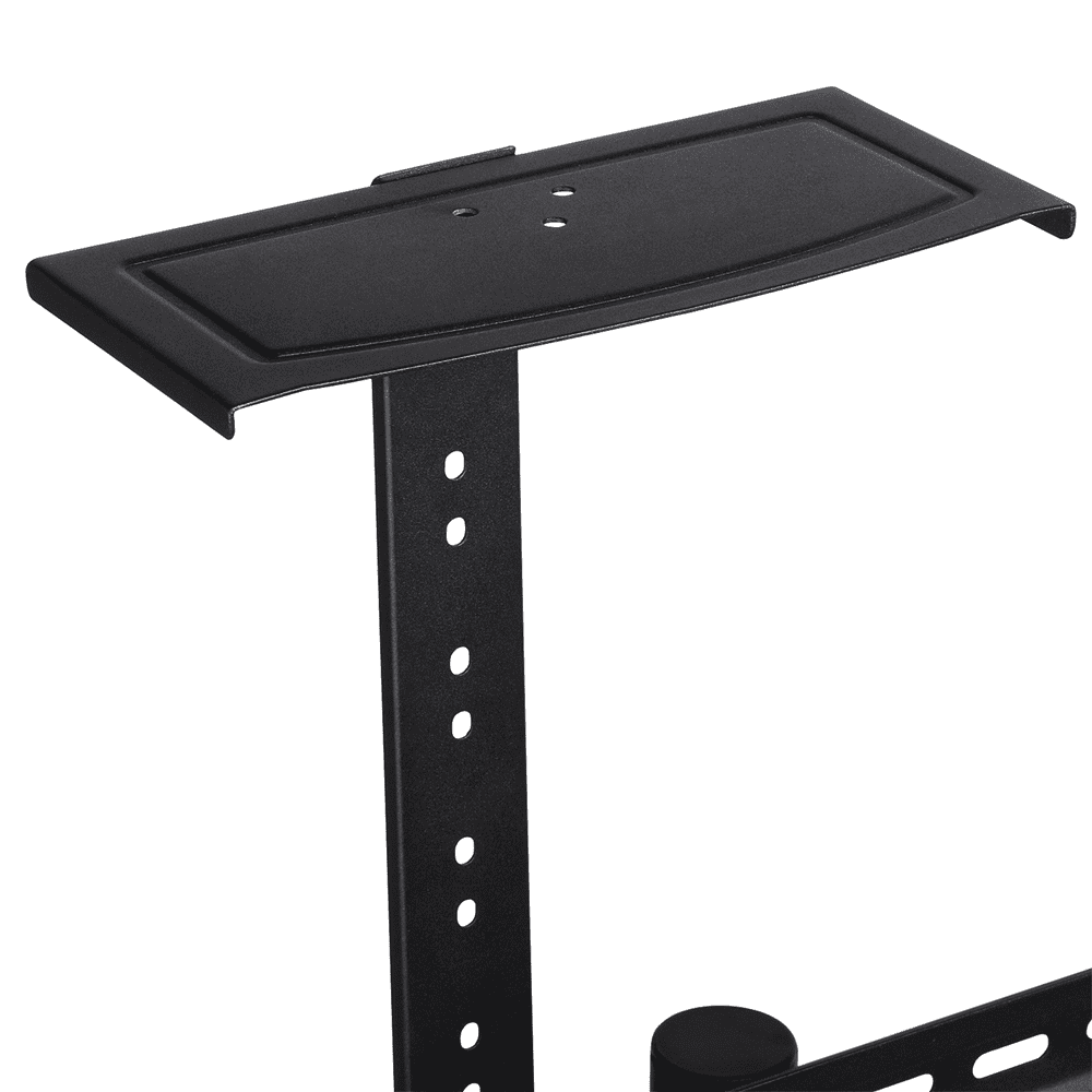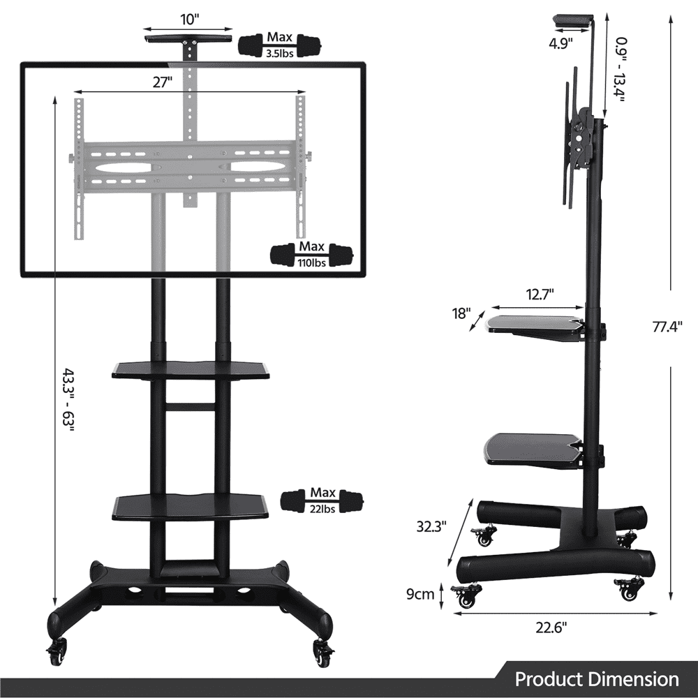 Color: Black Material: Steel G.W.: 38.1 lb Suitable TV size: 32″-75″ Overall dimension: 32.3 x 22.6 x 77.4”(L x W x H) Angle adjustment of hanging holders: ±13° Height adjustment range of hanging board: 43.1-63” Base size: 32.3-25 x 22.7 x 3.2” (L x W x H) Lower shelves size(ea.): 18 x 12.7 x 0.7” (L x W x T) Top shelf size: 10 x 4.9 x 0.8” (L x W x T) Hanging board size: 27 x 6.1 x 0.9” (L x W x T) Hanging holder size(ea.) : 16.5 x 1.3 x 2.1” (L x W x T) VESA standards: from 100(w)mm x 100(h)mm to 600(w)mm x 400(h)mm Assembly Required Residential Use
