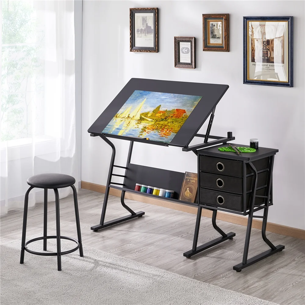 The drawing table features CARB-Certified Phase 2 MDF countertop with PVC coating and a powder-coated steel base, providing sufficient stability for your daily use. The foam-padded stool is covered with PU leather and supported by metal legs, which can hold up to 265 lb. The table tilt Angle is adjustable and can be raised from 0 to 40 degrees for different purposes, and this drafting table is also perfect for a spacious writing/computer desk. This art desk with storage can also be used as a spacious writing desk or computer desk when the top is flat, making it perfect for art, drawing and creative tasks in the office, studio or at home. The side top and 3 drawers add basic storage to the art table.