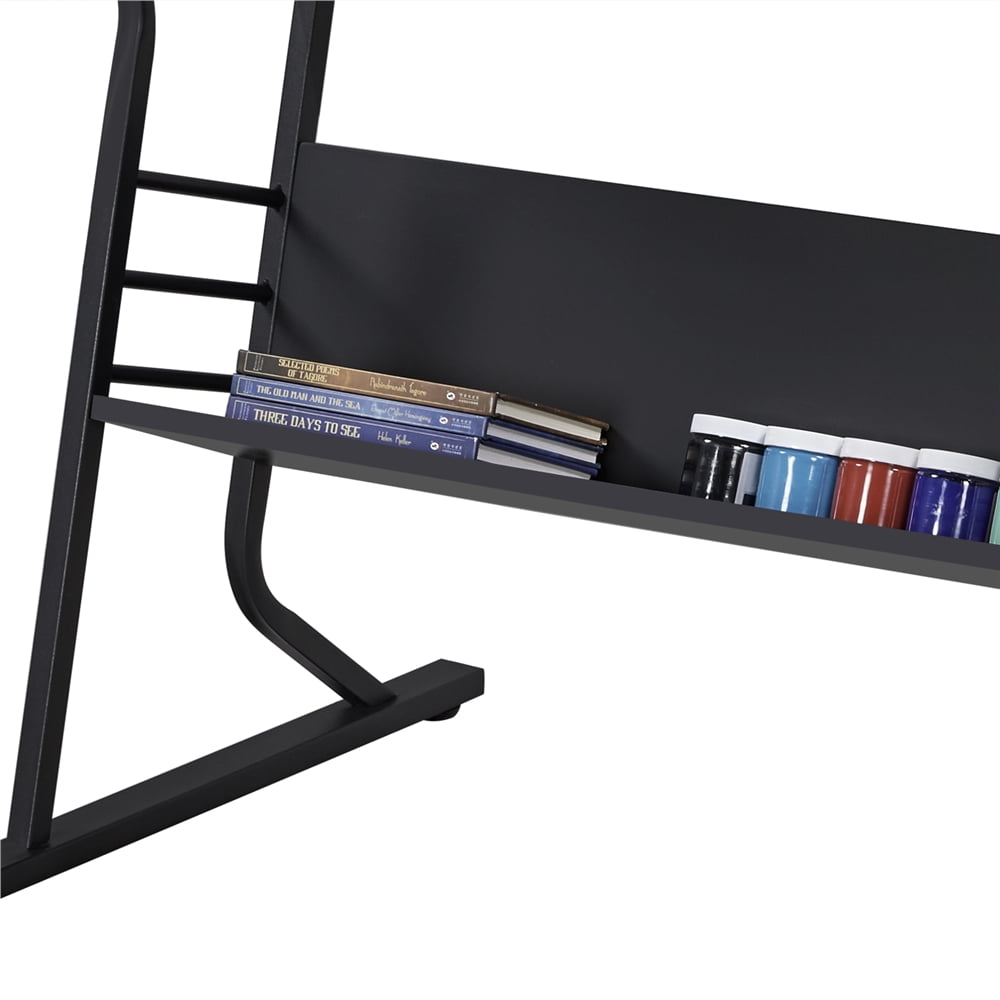 More Than One Way Usage: This art desk with storage can also work as a spacious writing table or computer table when the tabletop is flat,an ideal piece for art, drafting, and creative tasks in the office, studio, or at home. A comfortable foam-padded stool is provided for your convenience. Extra L-shaped Open Shelf: The lower open shelf features a slightly-tilted high back that helps stack and hold paper rolls, books, paint bottles. Protective Levelers: 6 protective foot pads help prevent leaving scratches on the hard floor and the screw-in installation can adjust and level the table to the floor. Easy to Clean: No more worries about spilled paint/ coffee or pen marks, the water-resistant PVC-coated countertop and powder-coated steel stand can be easily cleaned with a damp cloth and mild cleaners. Specifications: Colour: Black; Material: Powder-coated Steel, PVC-coated MDF, PU Leather, Foam, Non-woven Fabric; Tabletop Tilt Angle: 0-40 degrees; Overall Dimensions: 50.5″ L × 23.6″ W × (29.7-43.7)″ H; Stool: 16.3″ L × 16.3″ W × 21″ H; Maximum Weight Capacity: Tabletop: 158.7 lb; Stool: 265 lb.