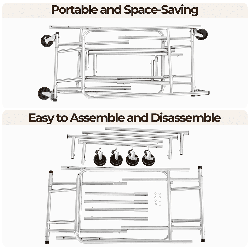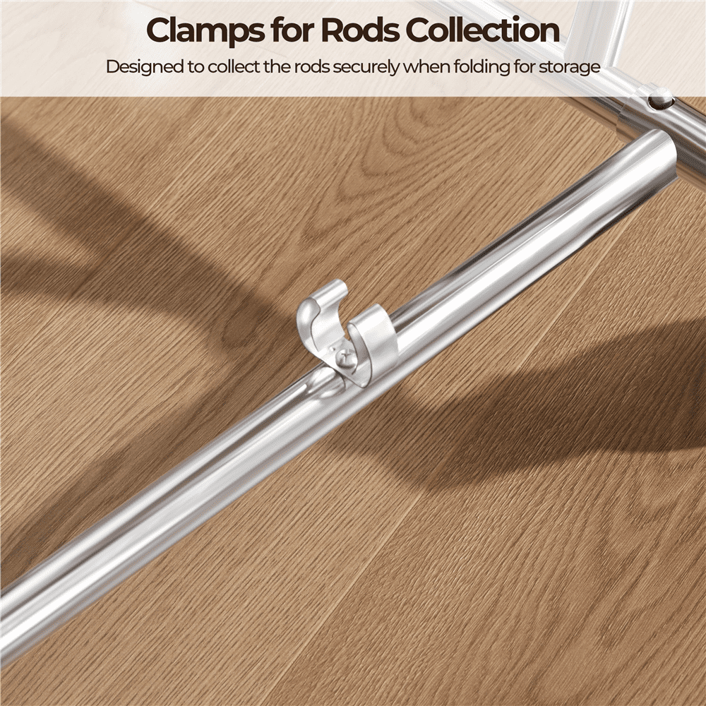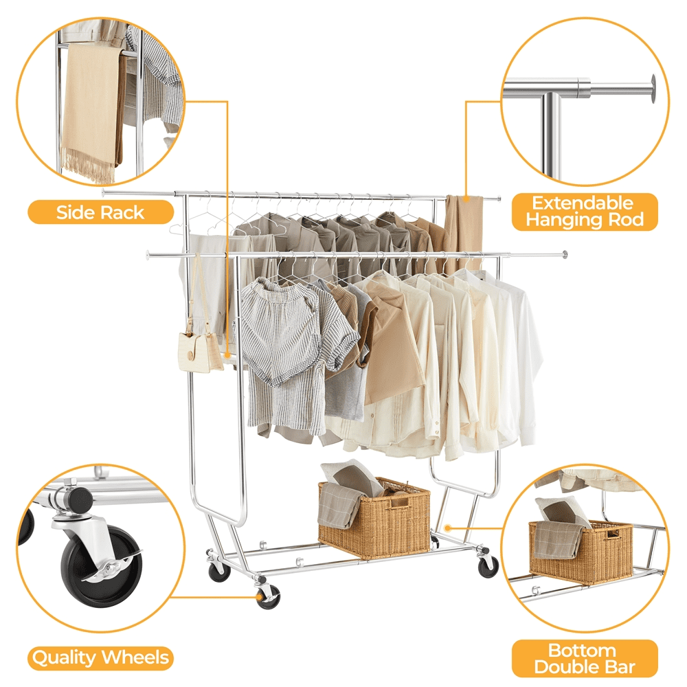 Renwick Adjustable Garment Rack, Metal, Silver: Adjustable Height and Length: The 2 upper hanging rails with 2 pull-out rods at both ends extend from 50.8-74.4 inches for more clothes. The 4 vertical support posts rise from 54.7-64.6 inches for long dresses or coat. Sturdy Clothes Rack: Heavy duty metal frame holds up to 220 lb; chrome finish makes it not easy to rust. Additional Storage Space: 2 Upper hanging rails for hanging more clothes; extra pull-out rods to hang your accessories like umbrellas, and hangers; the bottom bars for extra storage. Easy to Move Around: 4 Smooth rolling wheels make it easy to move from one place to another. Material: Iron & Zinc Alloy Overall Weight Capacity: 154 lb (dynamic), 220 lb (static) Assembled Dimension (Approx.): (50.8-74.4) x 21.9 x (54.7-64.6)” (LxWxH) Wheel Diameter (Approx.): 4” Tube Diameter: 2.5 cm/ 1” G.W.: 23.1 Lb