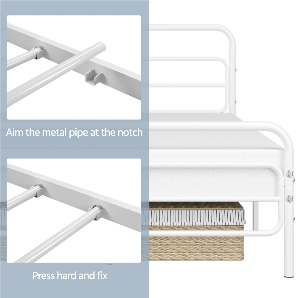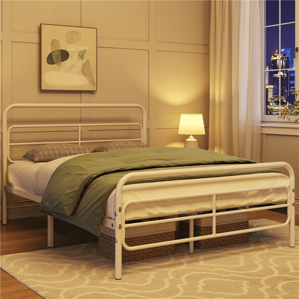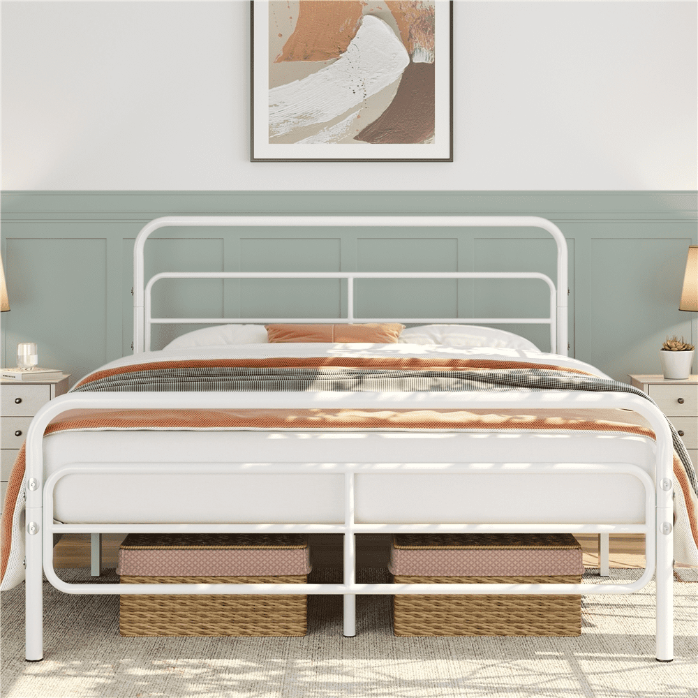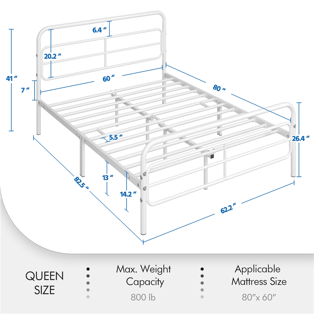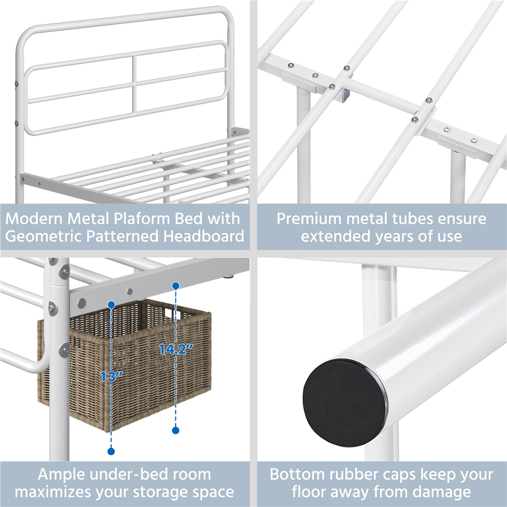 Renwick Modern Geometric Patterned Metal Bed, Queen,White: Material: Iron Color: White Overall Dimensions: 82.5”L × 62.5”W × 41”H Applicable Mattress Size: 80”L × 60”W Maximum Weight Capacity: 800 lb Slat Spacing: 5.3-5.5” Distance between Headboard and Bedstead: 7” Ground Clearance: 13” Item Weight: 50.7 lb Shipping Weight: 56.5 lb 13” Under-the-Bed Storage High Headboard & Footboard Residential Use Assembly required