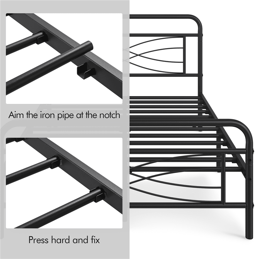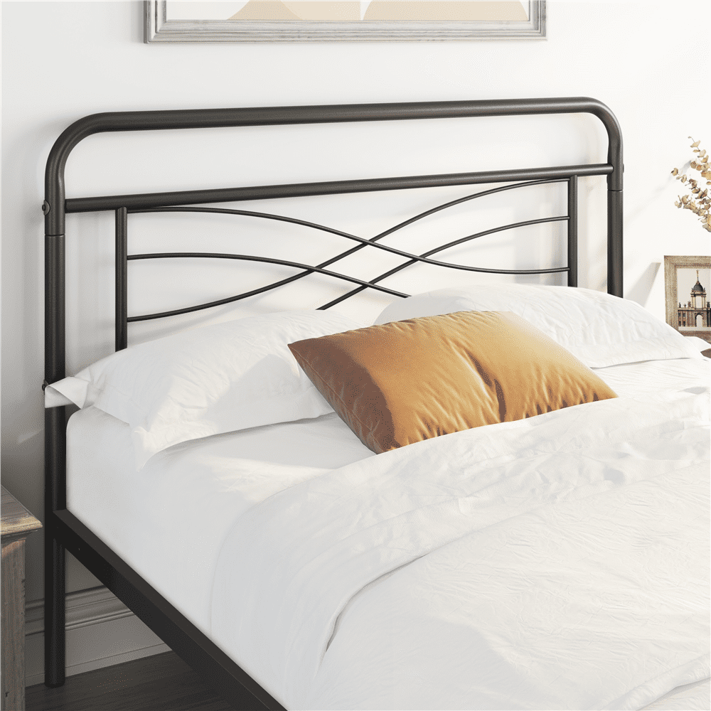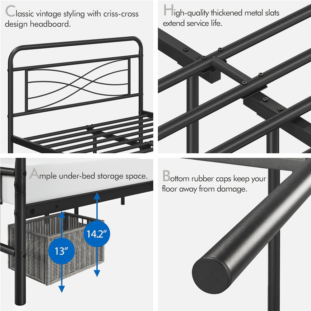 With an antique design, this metal bed embraces curved lines, with stylish criss-cross design and sleek metallic finish that seamlessly blends with any home decor style. Constructed of a solid and durable metal frame, this bed frame features multiple strong support legs that provide optimal stability for any type of latex, memory foam or spring mattress without a box spring. Added details for your safety and comfort include powder-coated finish and non-slip foot caps all. The platform bed frame creates sufficient under-the-bed storage space for your luggage, shoes, bags and much more, keeping your bedroom tidy and clutter-free. An excellent choice for apartments, condos, studios, dorms, and all types of bedrooms.