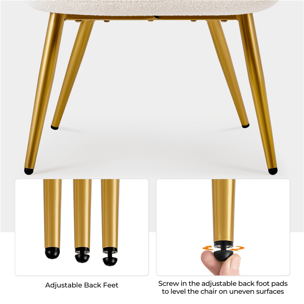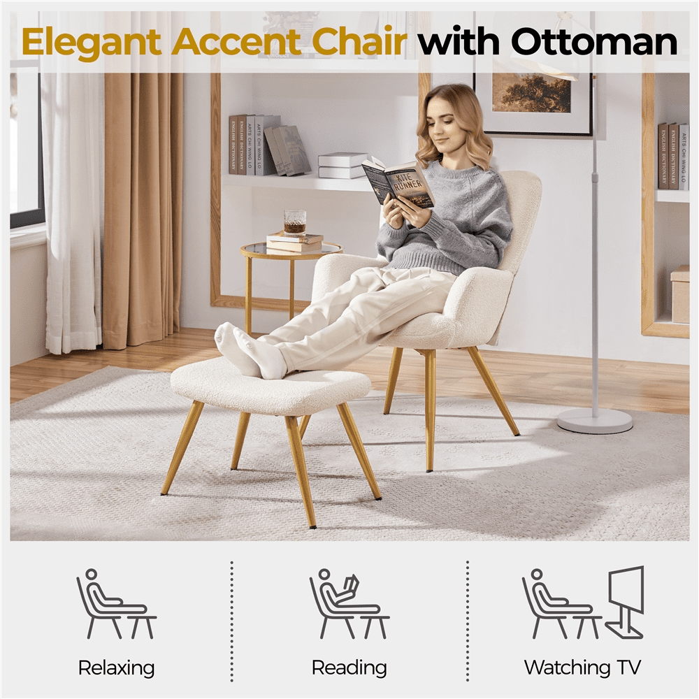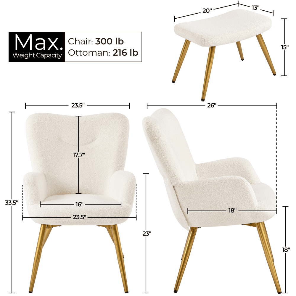 Renwick Boucle Accent Chair and Ottoman Set with Golden Metal Legs, Ivory: Color: Ivory Materials: Polyester Boucle Fabric, Foam, Metal, Plywood Assembled Dimensions: Chair: 23.5″W × 26″D × 33.5″H Ottoman: 20″W × 13″D × 15″H Seat Width: 16″ Seat Depth: 18″ Seat Height: 18″ Armrest to the Ground: 23″ Maximum Weight Capacity: Chair: 300 lb Ottoman: 216 lb Item Weight: Chair: 19.8 lb Ottoman: 7.9 lb Shipping Weight (per box): 32.6 lb Solidly Constructed Space-Efficient Addition