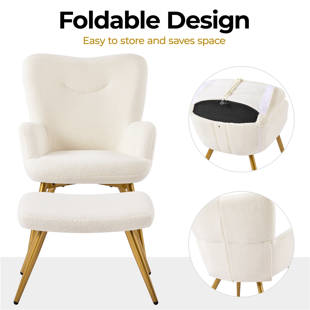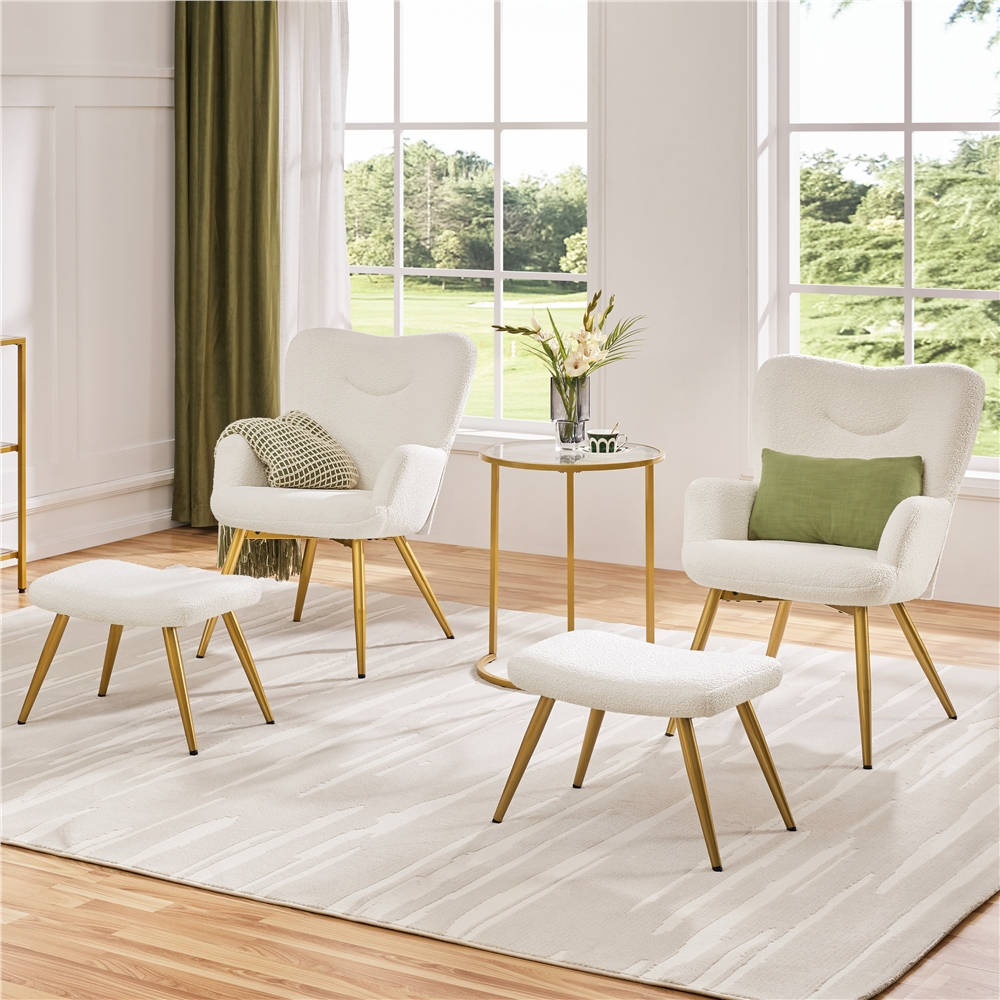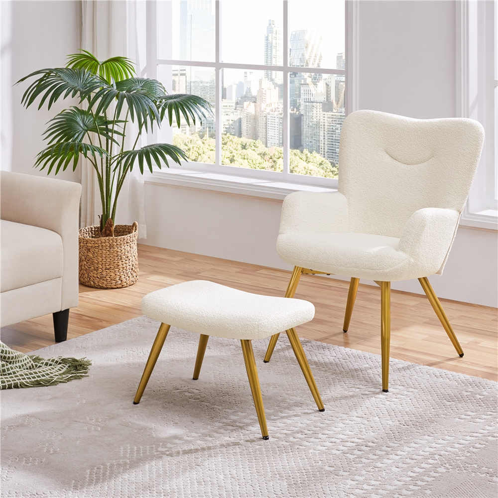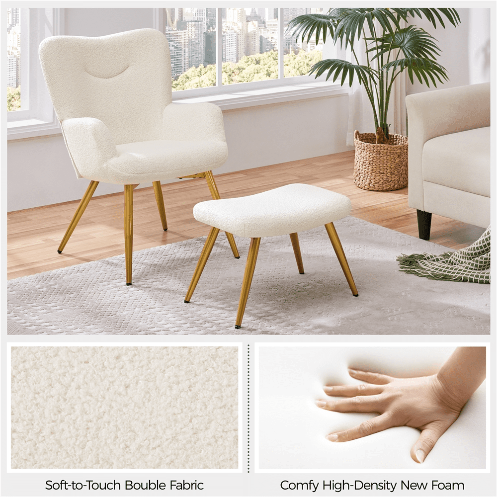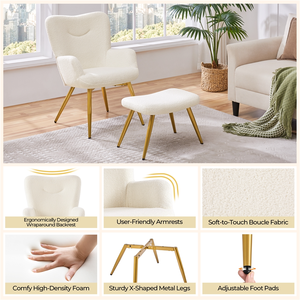 Renwick Boucle Accent Chair and Ottoman Set with Golden Metal Legs, Ivory