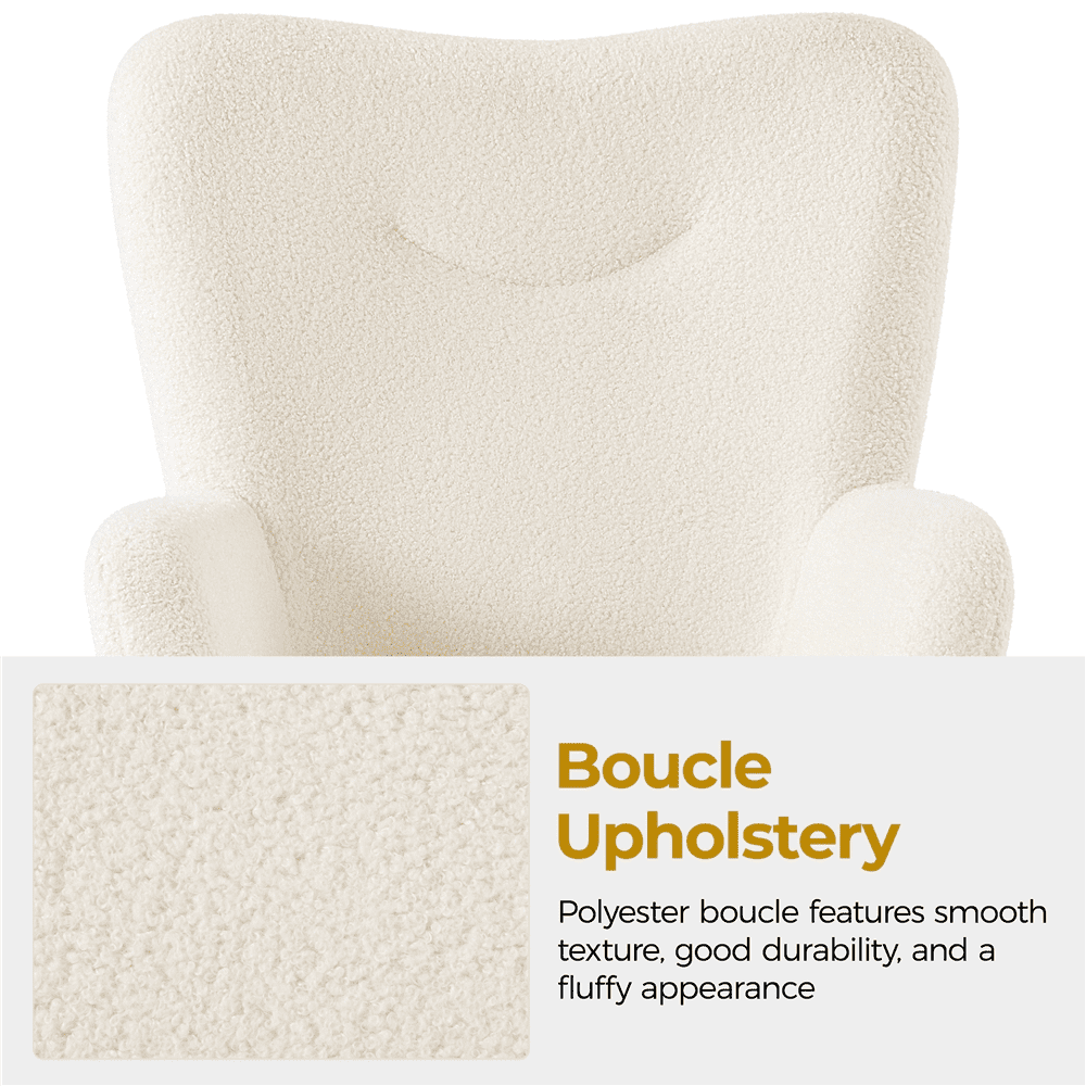 This small accent armchair set is crafted of premium polyester fabric, solid metal legs and resilient foam fill. The accent chair has a retro backrest, smiling mouth tufting, and gold-tone tapered legs, giving your space a contemporary look and a splash of color. An ottoman accompanies this accent chair, providing a comfortable lounging experience and a place to rest your feet. The chair set is covered in boucle fabric upholstery made of polyester, which adds texture and elegance to your home.