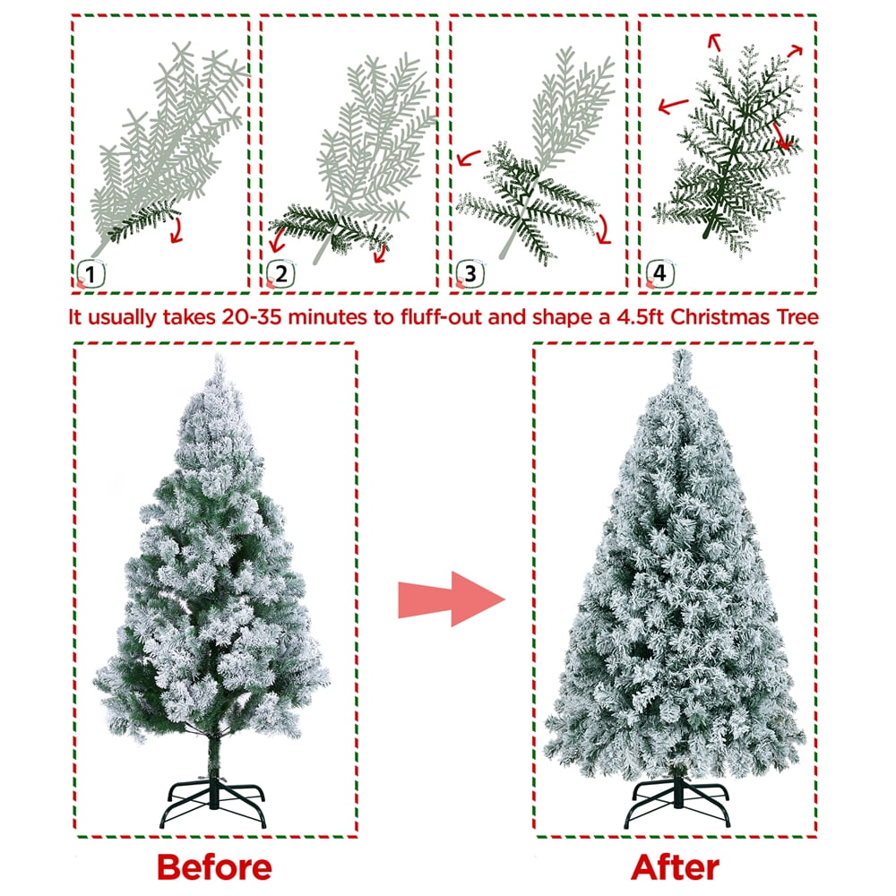 Easyfashion 4. 5 Ft Snow Frosted Christmas Tree Warm Lights, Green. Our frosted artificial Christmas tree comes with premium quality materials, for both fire-resistant and nice durability. PVC branches and tips are covered with white flocking snow, making it classic and traditional. A hinged system is easy to assemble with pre-fixed lights and branch position. A foldable stand can be placed and stored with less space taken.
