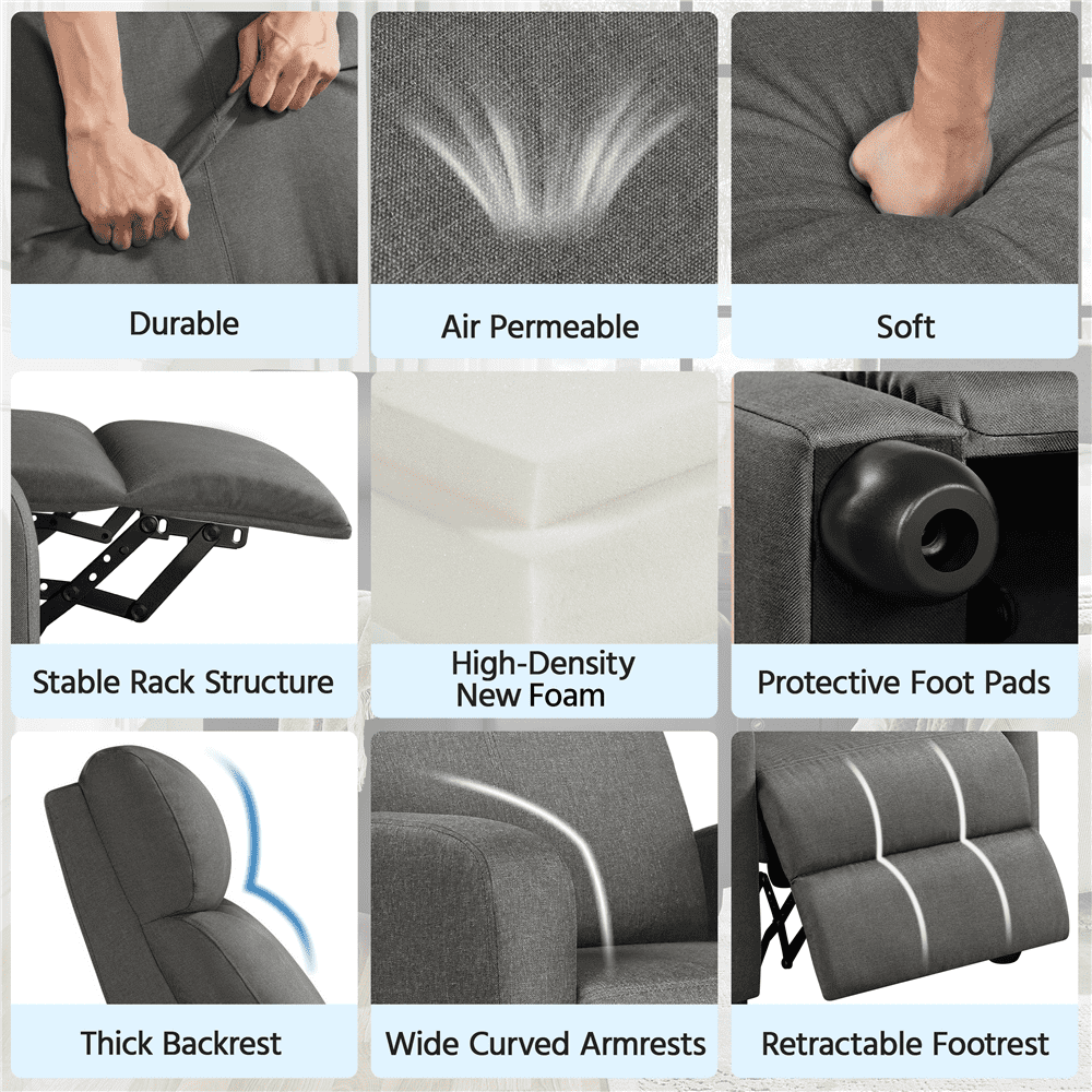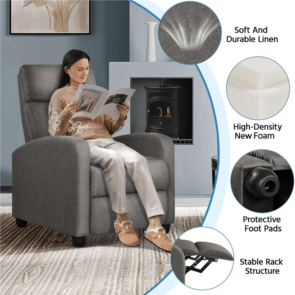 The upholstered reclining sofa features a soft-cushioned seat supported by pocket springs, extra thick foam, and a rayon fiber filled backrest and footrest. Covered with strong yet soft linen fabric, the excellent texture gives you the ultimate sitting experience. You can enjoy your favorite seating positions on this adjustable reclining chair. If you prefer sitting up straight or with your legs up or lying flat, you can simply push at the backrest to adjust. The footrest instantly pops up and stops at any angle between 0 and 90 degrees. This fabric reclining chair works for the living room, office, and bedroom. It is a perfect spot to spend leisure time watching games, movies, TV dramas and music. This single recliner chair sits on four sturdy feet equipped with non-marking pads, which protects both the sofa and the floor.