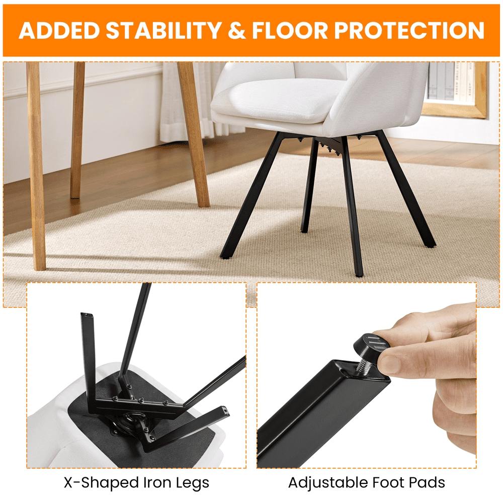 Featuring a high-density foam-padded cushion, it ensures a plush and soft seating experience. Supported by cross-structured iron legs with adjustable foot pads, this cute vanity chair is both stable and sturdy, holding up to 300lb. Additionally, the 360° swivel function adds both practicality and an element of fun. Ideal for living rooms, bedrooms, vanity rooms, and home offices.