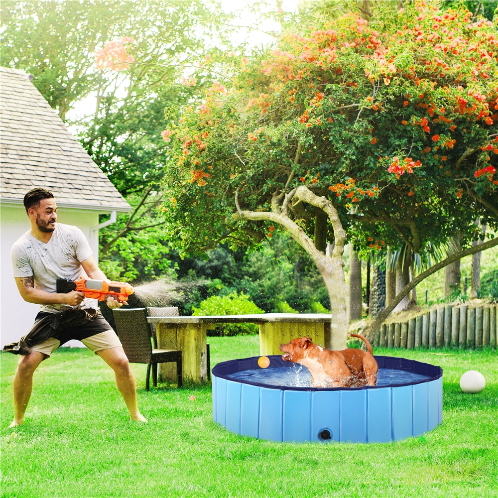 This foldable pet swimming pool will give your pets coolness and joy. Made of strong durable materials, this dog swimming pool provides your dog with a safe and cozy place to play. For convenience, the pool has a drain hole for easy drainage. It is easy to fold and unfold. It is great that your cute dogs will have a good time with his/her toys in the cool water. Also, your dog will have fun together in this foldable pool.