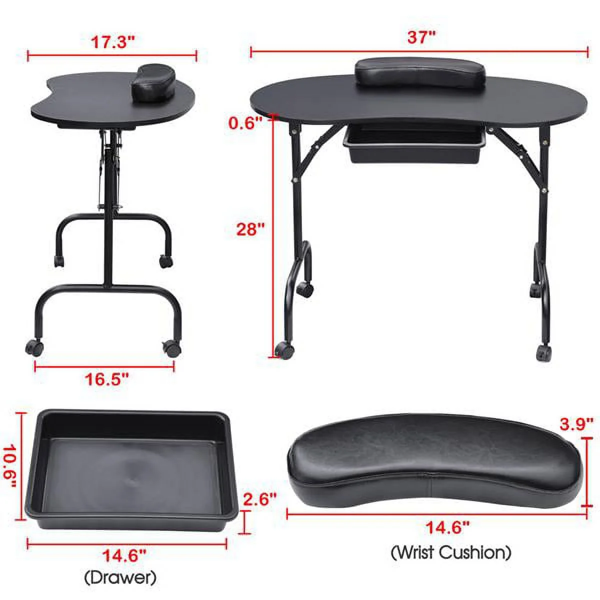 Renwick Folding Manicure Table Nail Beautician Desk Workstation,Black: Material: Iron & Plastic & MDF G.W.: 25.3 Lb Size: 37 x 17.5 x 28” (L x W x H) Drawer: Approx. 14.6 x 10.6 x 2.6”(L&W&D) Thickness of MDF Board: 0.7” Table Top: Approx. 37 x 17.3” (Max. L & W) Assembly Required Residential Use