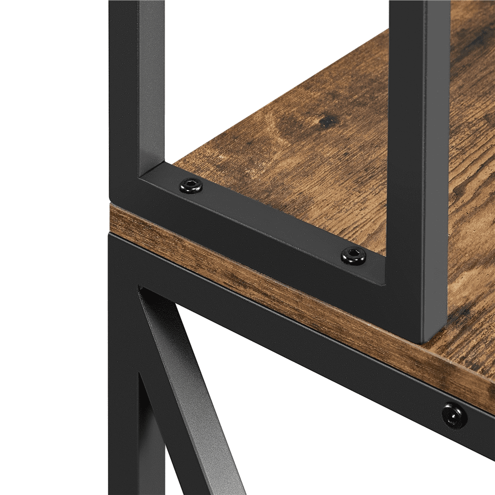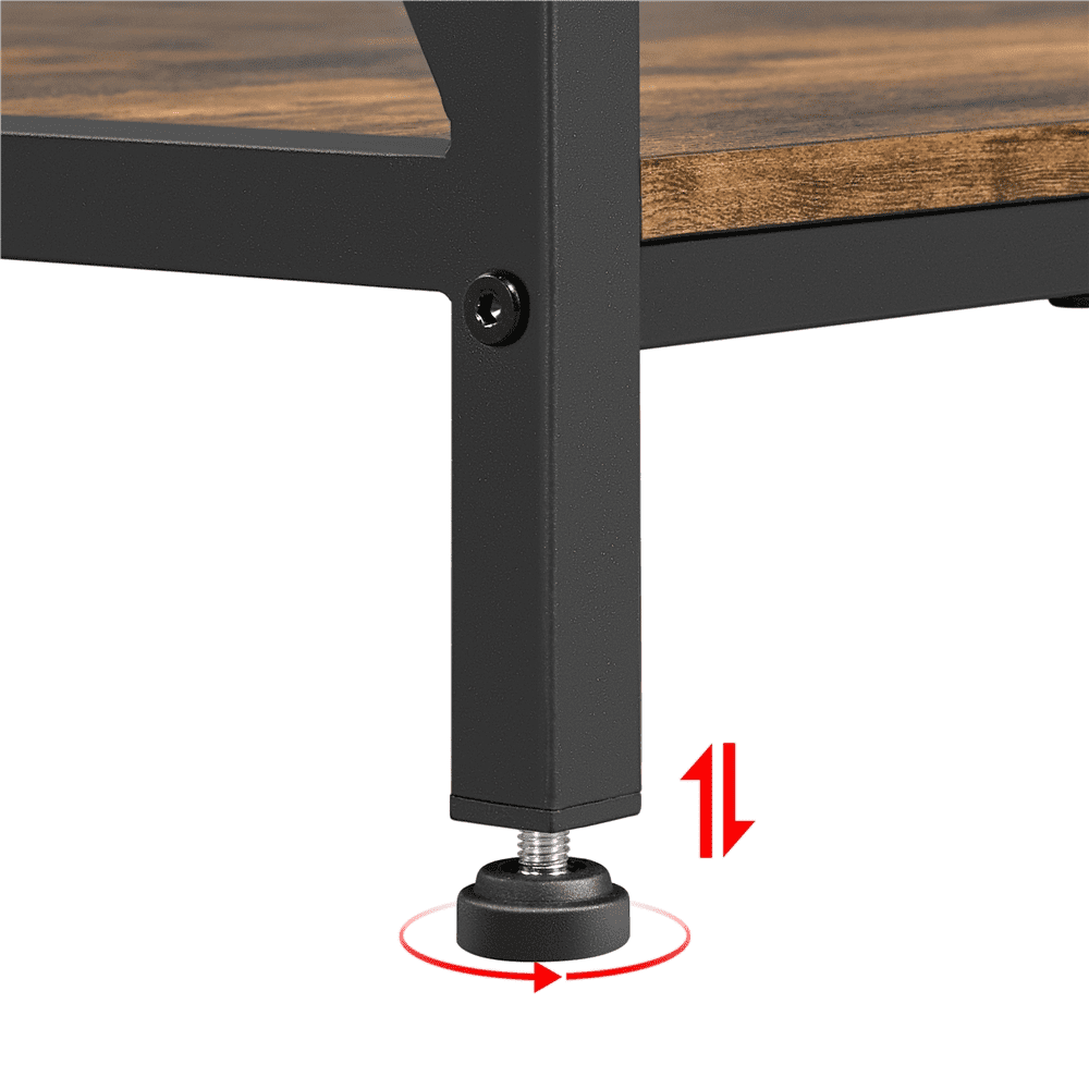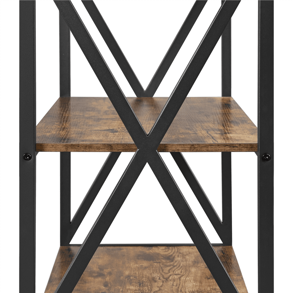 X-design metal frame: The X-shaped sides round out the design of the rack and enhance strength and stability Adjustable screw-in feet: Four protective feet help prevent leaving scratches on the hard floor and the screw-in installation can adjust and level the rack to the floor With anti-tip strap: You will get extra anti-tip straps and some hardware to attach the rack to the wall, which can avoid tipping over and wobbling Clean with ease: The utility storage shelf unit is easy to keep clean. Its water-resistant laminated surface and powder-coated framework can be cleaned with a damp cloth and mild cleaners Effortless assembly: Simple assembly required for this utility storage shelving unit. We prepare an illustrated instruction manual and all necessary hardware and tools to help you set up quickly and easily Specification: Color: rustic brown; Material: particle board, iron; Overall dimension: 35.5x16x64.5’’ (LxWxH); Countertop size: 35.5×16’’ (LxW); Frame tube size: 0.8×0.8’’ (LxW); Maximum load capacity: top shelf (ea.): 18lb; countertop: 44lb; bottom shelf (ea.): 44lb