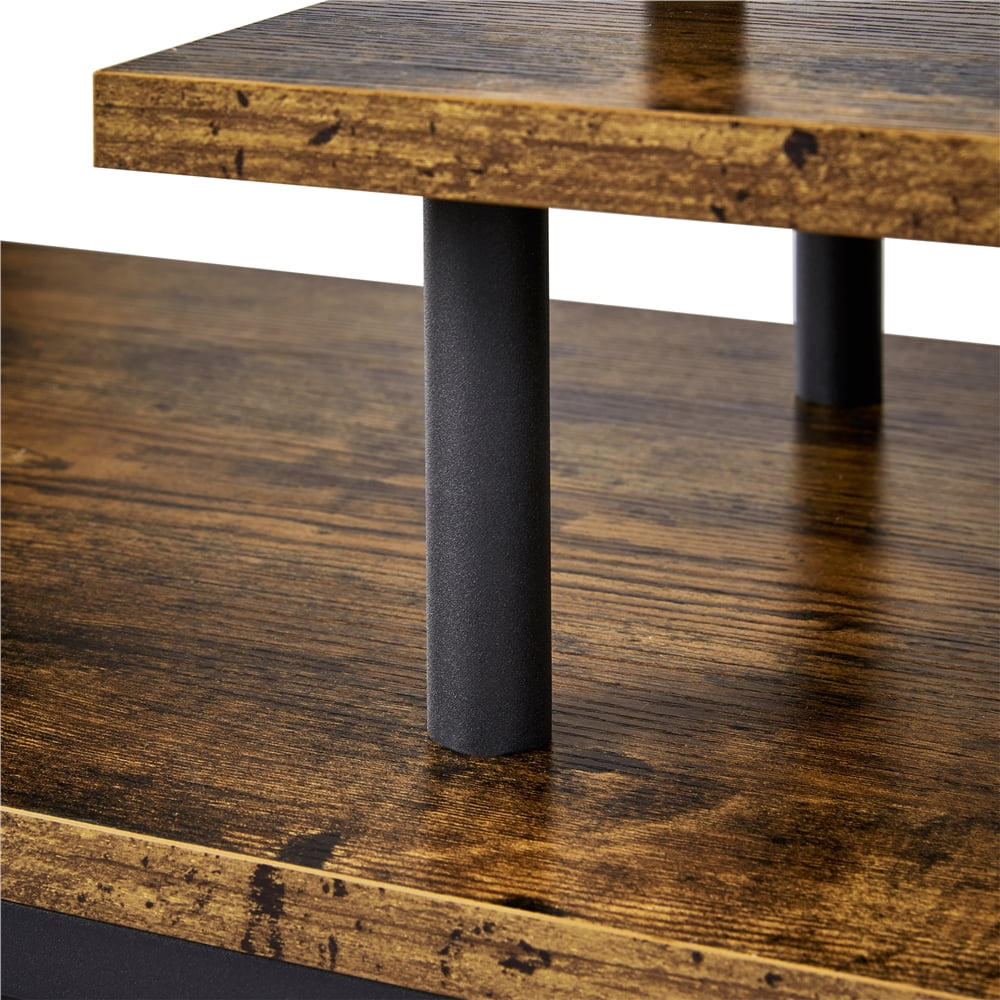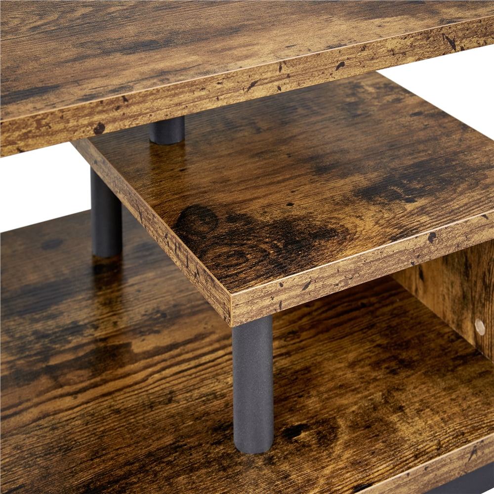 More than One Way Use: This wooden table is ideal for TV, plasma, DVDs, LCDs, video game players, etc. The lower open shelf can house the digital receivers, blue-rays, gaming consoles, and some other accessories for your convenience. Plus, you can use this rustic wooden table as a coffe table in the living room, one table for two good uses, very practical and versatile. Versatile: This rustic TV console table is versatile for many occasions, such as living room, reception room, etc. You can also put it in your study or for commercial use. Its lower open shelf and the small shelf allow you to store and display items like books, magazines, mugs, cups, electronic devices, and so on. Meet Your Storage Needs: This coffee table provides a spacious tabletop for living room supplies. It can store daily necessities, office supplies, books, magazines, mugs, cups, electronic devices, and other things. The lower open shelf and the small side shelf provide extra space for storing magazines and books. Easy to Clean: Our coffee table is covered by a layer of waterproof covering, which makes it waterproof and easy to clean. Just wipe it clean with a wet cloth. No too much maintenance required, very easy and convenient. Specifications: Color: Rustic Brown; Material: MDF, Iron; Overall Dimensions: 41.7″ L × 15.6″ W × 15.7″ H; Floor-to-bottom Height: 3.6″; Bottom Shelf to Top Table Height: 10″; Max. Weight Capacity: Top: 121 lb; Bottom Shelf: 121 lb; Small Shelf: 11 lb.