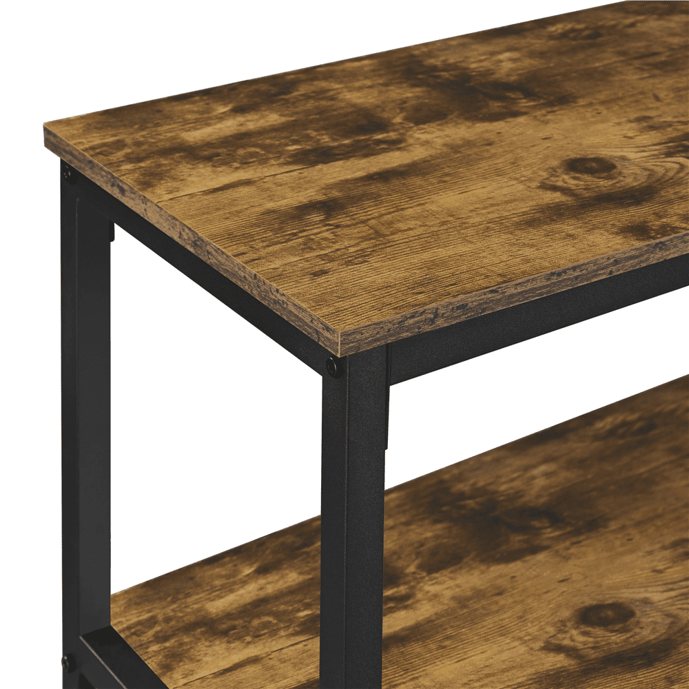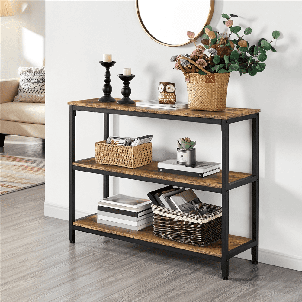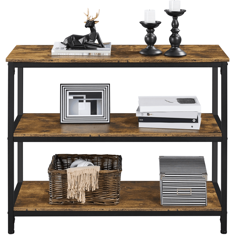 Selected Materials: Crafted into a stable structure with quality iron and CARB P2 Particle Board, this vintage console table combines safety with function. The veneered surface resists water and scratches, maintaining its refined look over time. Versatile: Simple and practical, this console table fits seamlessly in any space—use it as a side table in the living room, a kitchen storage unit, an entryway table for daily essentials, or a stylish accent at the top of the stairs. Compact Size: This rustic console table offers generous storage without taking up much space, ideal for narrow hallways, behind sofas, against walls, or in corners, providing a stylish and functional solution for organizing keys, décor, and essentials. Wall Anchor: A wall anchor is included to securely attach this compact three-layer console table to the wall. Be sure to follow this important step during installation to ensure stability and prevent tipping. Specifications: Color: Rustic Brown; Materials: Particle Board, Iron; Assembled Dimensions: 39.73″ L × 11.81″ W × 31.69″ H; Maximum Weight Capacity: 198 lb; Item Weight: 26.2 lb; Shipping Weight: 30.3 lb.
