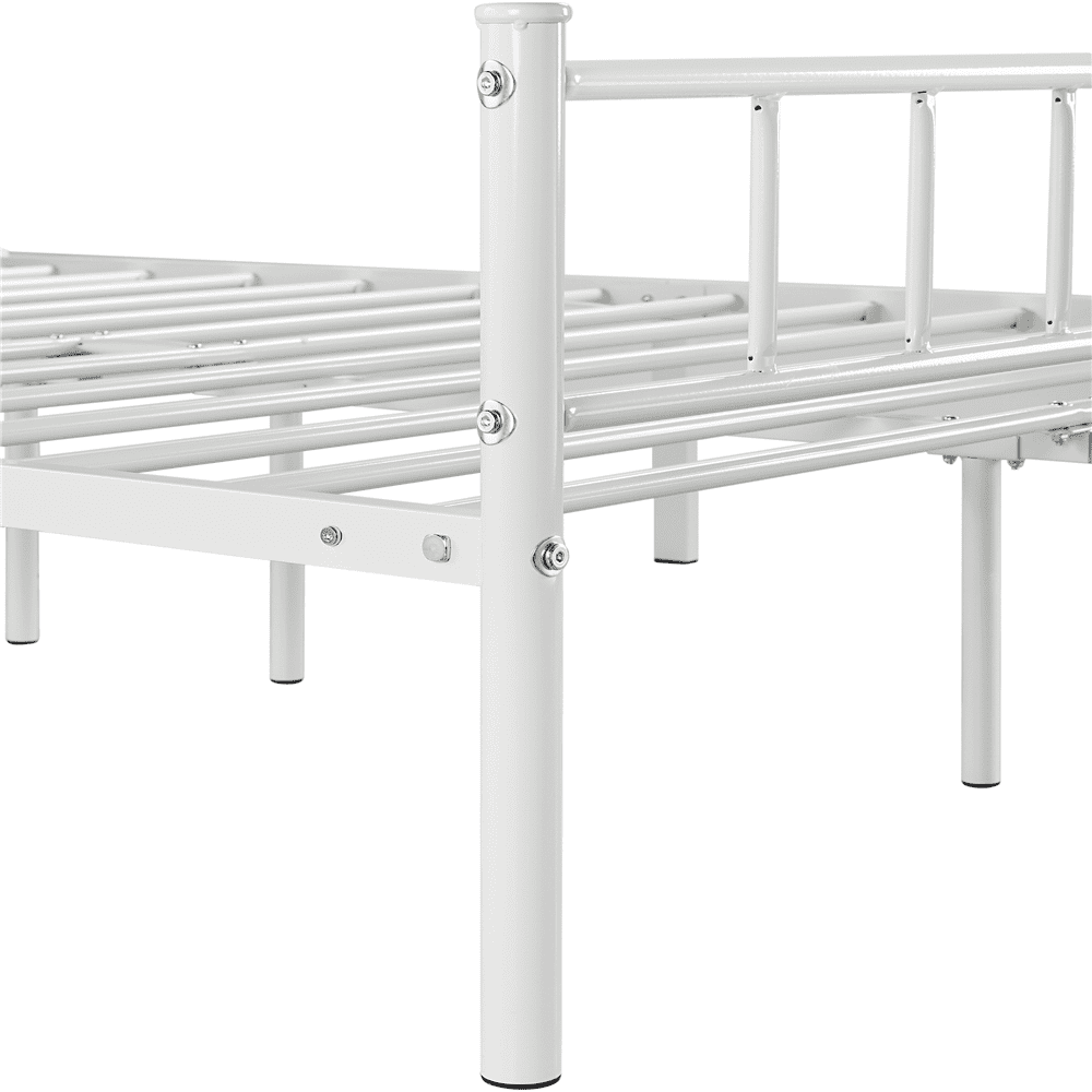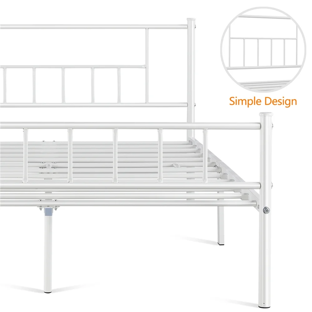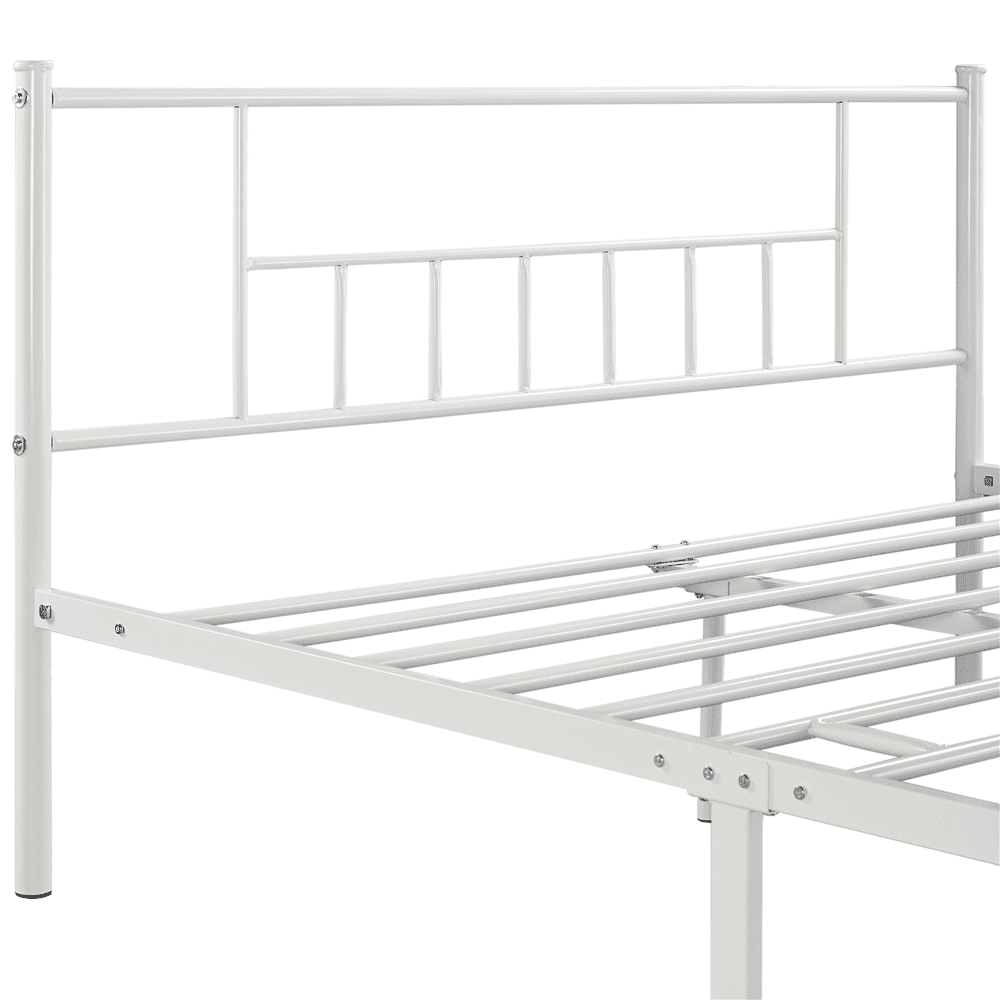 Renwick Jorge Queen Metal Platform Bed with Spindle Headboard and Footboard, White: Sturdy Foundation: This bed base is built of solid side rails, center rails and sturdy supporting legs for excellent load-bearing capacity. The reliable frame features 12 metal slats between two sides, providing you with strong support and a comfortable sleeping experience. Extra Storage: Under bed is a ground clearance of 13 inches. You can take advantage of this space to store book boxes, quilt containers, clothes organizers, shoes and more. Versatility: Minimalist design combined with practical use, this metal frame bed in black/white/silver/antique gold/pink finish will be great for bedrooms, guest rooms, dormitories, and apartments. Material: Iron Color: White Overall Dimensions: 82.5” L × 62.5” W × 35” H Applicable Mattress Size: 80” L × 60” W Maximum Weight Capacity: 750 lb Ground Clearance: 13” Slat Spacing: 5.3-5.5” Item Weight: 40.9 lb Shipping Weight: 46.4 lb
