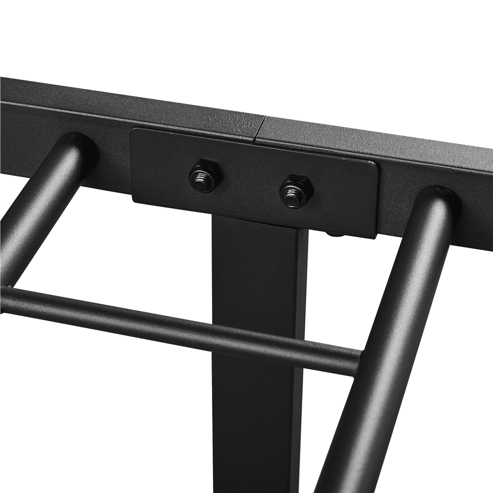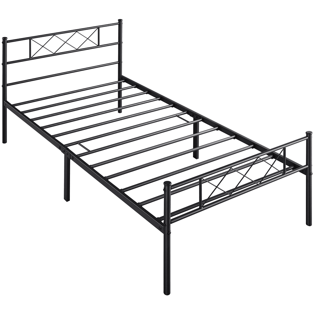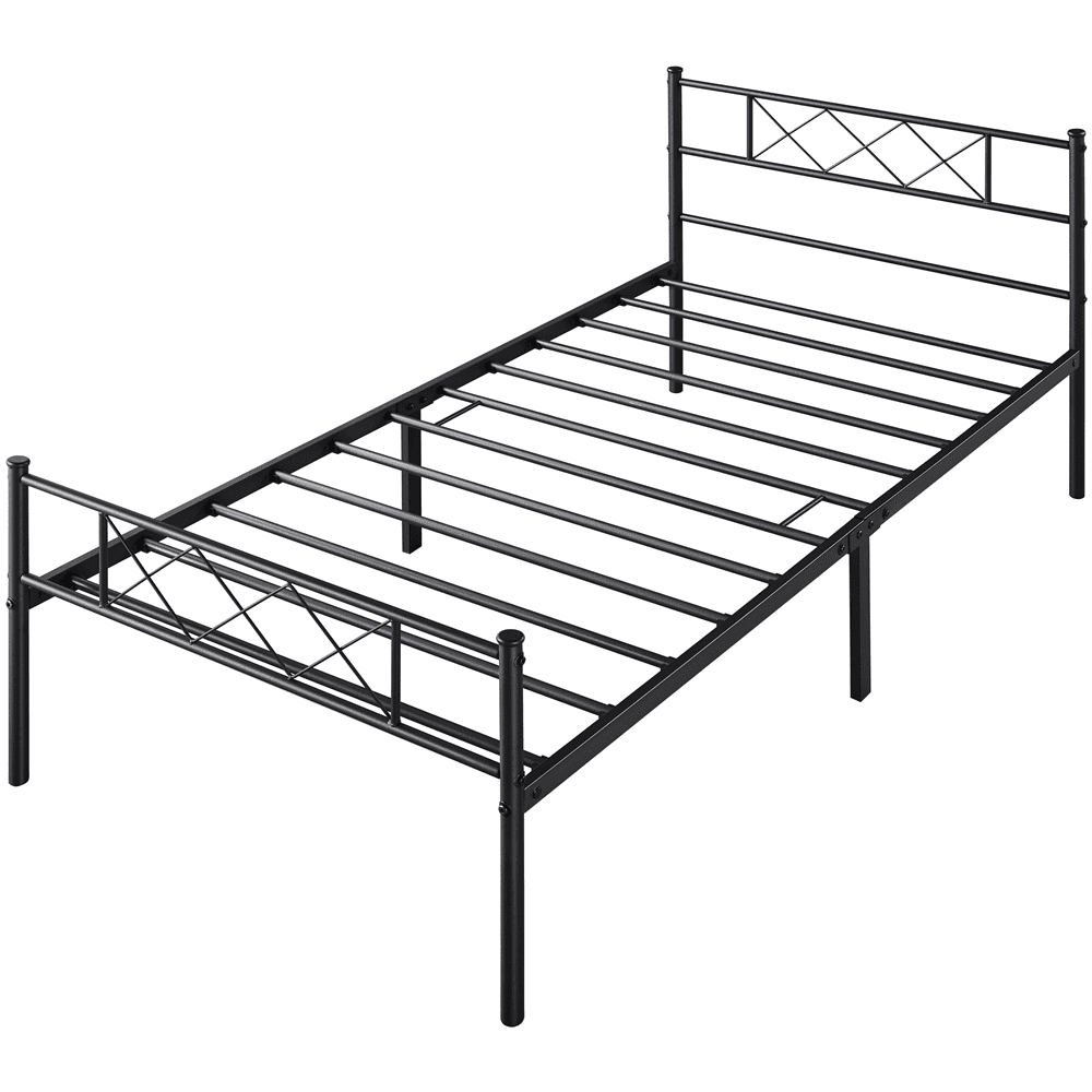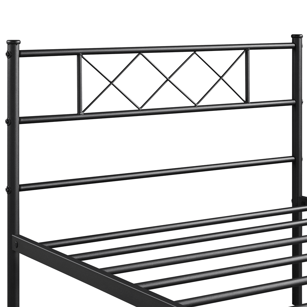 With its clean lines and open design, this metal bed frame with a cross-design headboard adds a modern touch to any room. Built from durable metal slats, side rails, and center rails with multiple support legs, it offers sturdy support for a restful night’s sleep—no box spring required. The scratch- and water-resistant surface is easy to maintain. Plus, the under-bed space provides convenient storage for boxes and baskets. The head and footboard offer added protection and keep your bedding in place. Ideal for bedrooms, guest rooms, dorms, apartments, and more.