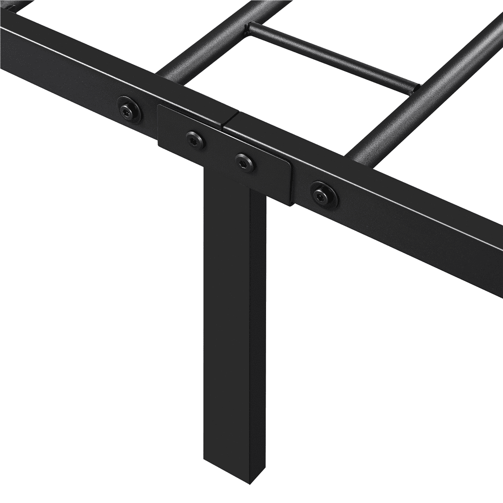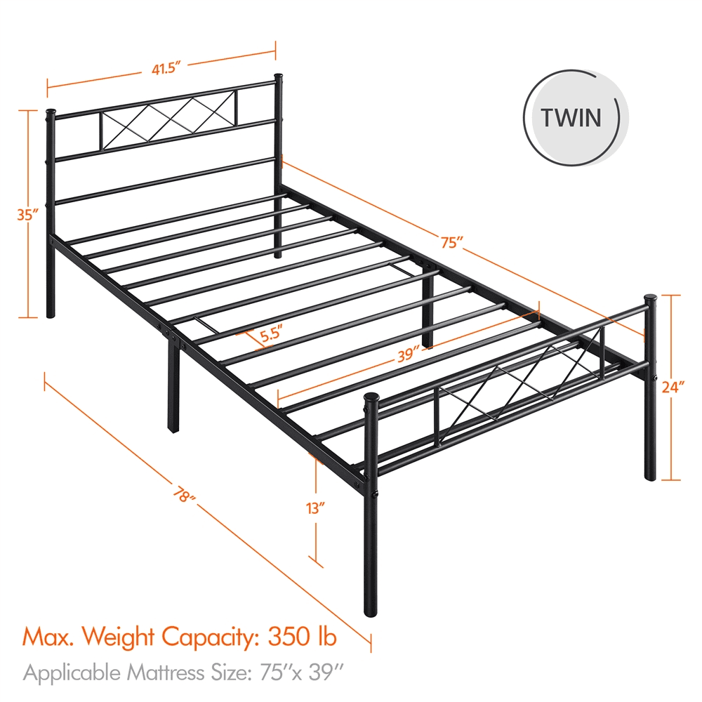 Sturdy and Durable: This robust twin size bed base is built of metal slats, side rails and 6 support legs for a 350 lbs load-bearing capacity, ensuring you a good night’s sleep free of squeaky noise. Includes Headboard & Footboard: The bed frame with headboard & footboard provides extra protection to your body and helps to hold the covers or blankets in place. Ample Under-bed Storage: This metal bed frame has a 12.6-inch under-bed space for hiding away storage boxes, baskets, luggage, shoes, etc. keeping your bedroom organized and tidy. Make Cleaning A Breeze: The platform bed frame features a powder-coated iron frame for scratch-resistant and easy cleaning features. Specifications: Material: Iron; Color: Black; Overall Dimensions: 77.36 x 41.14 x 34.84 inch; Applicable Mattress Size: 75″ L x 39″ W; Maximum Weight Capacity: 350 lb.