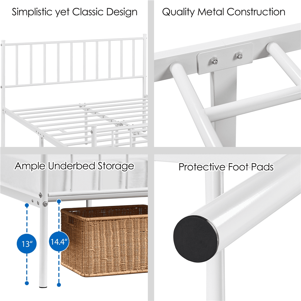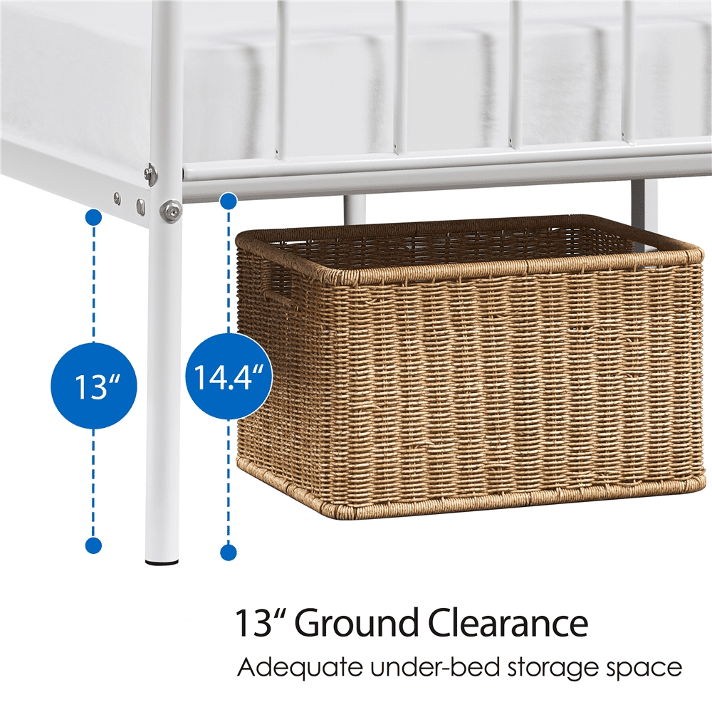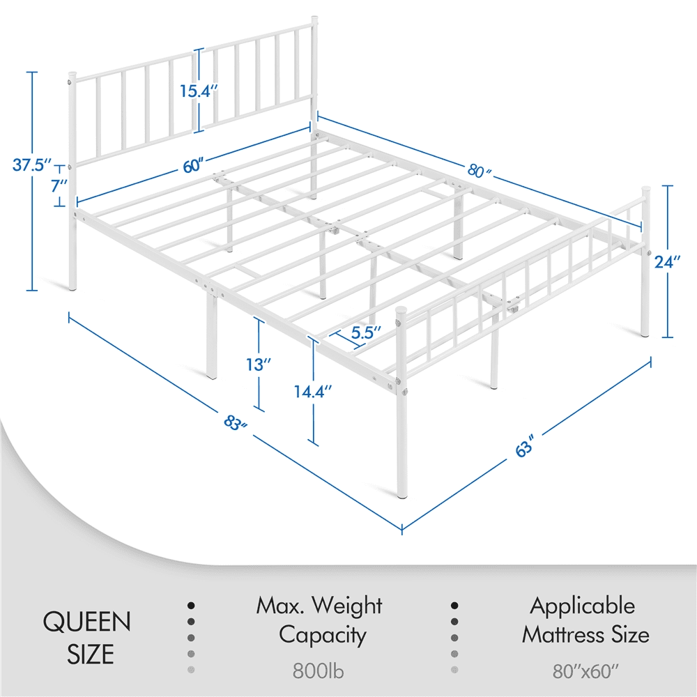 Renwick Metal Bed Frame with Spindle Headboard and Footboard, Queen Size, White: Material: Iron Color: White Overall Dimensions: 83”L × 63” W × 37.5”H Applicable Mattress Size: 80”L × 60”W Maximum Weight Capacity: 800 lb Ground Clearance: 13” Slat Spacing: 5.3-5.5” Net Weight (assembled product weight): 47 lb Gross Weight (product in the box): 52 lb Spindle Headboard and Footboard Ample Underbed Storage Residential Use Assembly required