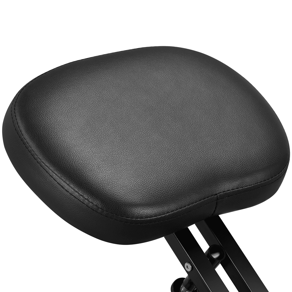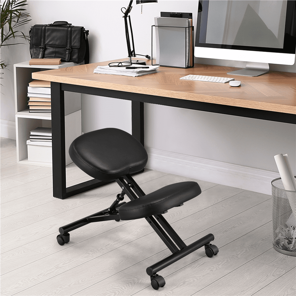 This posture corrective stool helps with better digestion and blood circulation. A three-level of adjustment is provided for adapting to an individual’s sitting habits. Premium faux leather and high-density foam make this ergonomic kneeling chair water-resistant, deformation-resistant, and long-wearing. A sturdy metal frame equipped with silent castors makes this adjustable stool durable and versatile. After assembly, the dimensions are 27’’ L × 18.5’’ W × 19’’ H.