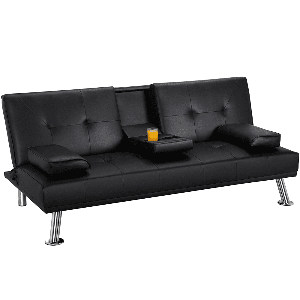 Renwick LuxuryGoods Modern Faux Leather Futon with Cupholders and Pillows, Black