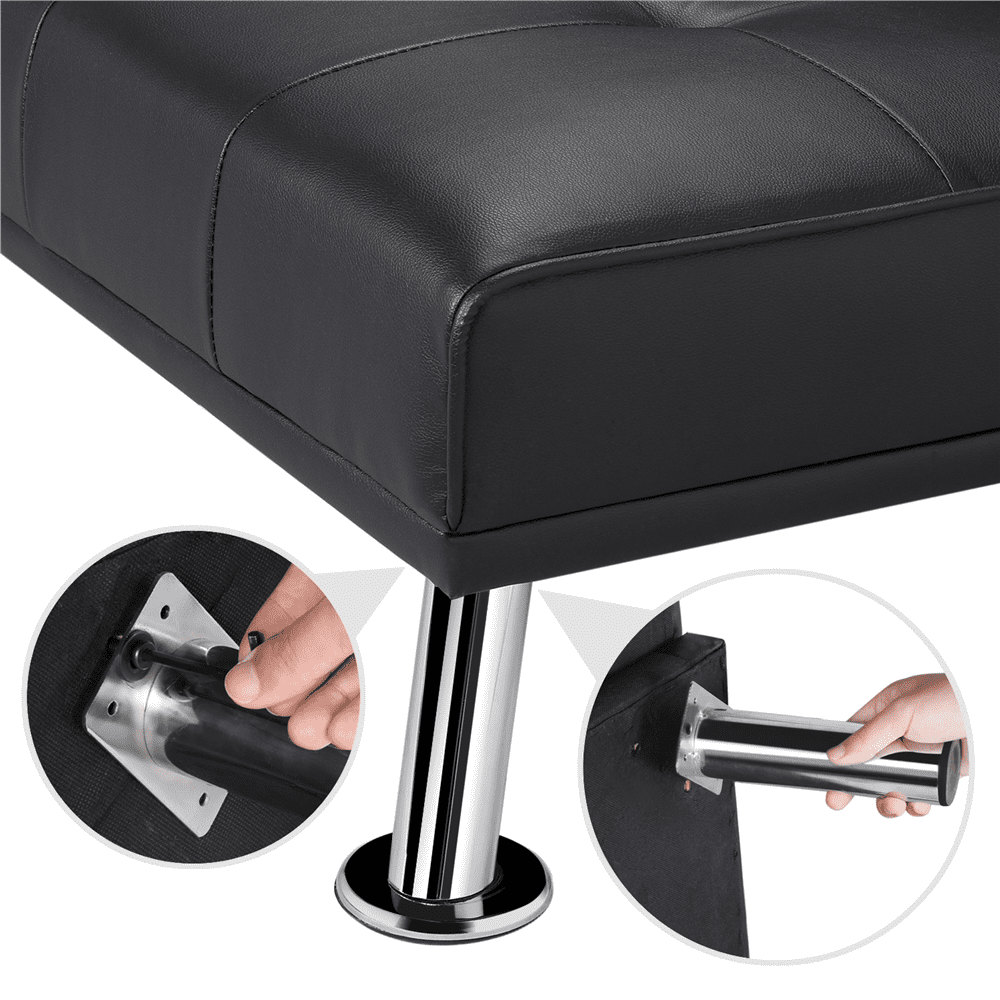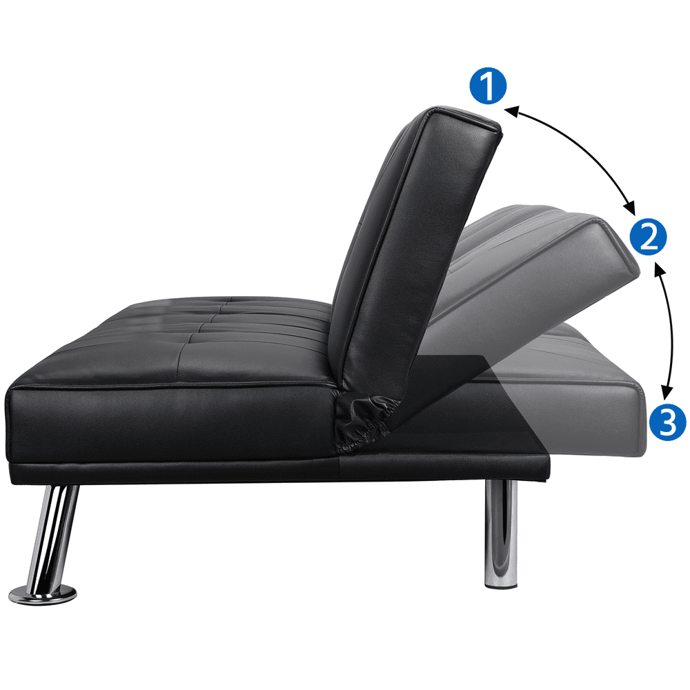This sofa bed is made of high quality artificial leather with a sturdy iron frame. The durable materials guarantee that this futon will last a long time. This home recliner couch can be transformed into a quick guest bed for visitors by removing the armrests and reclining the back rest. This futon is designed for comfort with ergonomic materials and a middle armrest that folds down with two cup holders. Find a friend to relax and enjoy a cold beverage with! This sofa bed is ideal for small spaces, and well-suited for an apartment, studio, dorm room, living room, bedroom, etc. The modern yet transitional design makes it blends perfectly with any home decor style. Simple assembly is required and detailed instructions are included.