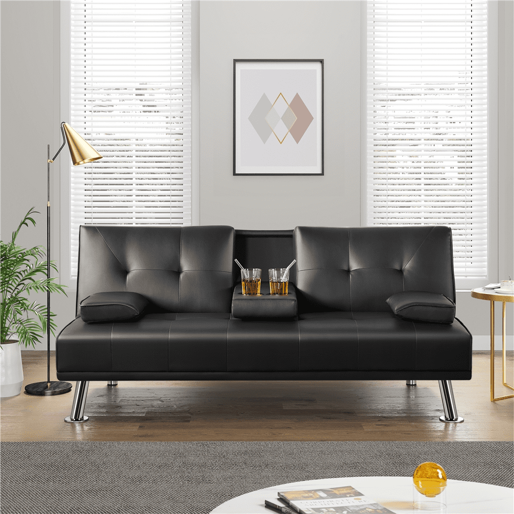 Renwick LuxuryGoods Modern Faux Leather Futon with Cupholders and Pillows, Black: 【Specifications】Color: Black; Materials: Faux Leather, Engineered Wood, Foam, Metal; Sofa Dimensions: 66″ W × 32″ D × 29.5″ H; Bed Dimensions: 66″ W × 37″ D × 16″ H; Seat Depth: 20″; Seat Height: 16″; Pillow: 16″ L × 9.4″ W; Maximum Weight Capacity: 772 lb; Item Weight: 58.9 lb; Shipping Weight: 67.5 lb. 【Sturdy Construction, Solid Materials】Founded atop metal legs in chrome finish, this convertible sofa bed features an engineered wood frame, foam fill, and soft faux leather upholstery that’s easy to clean. Maximum weight capacity up to 772 lb. 【Convertible With 3 Back Positions】This 2-seater sofa bed features a click-clack folding contraption to lock the sofa back at 105° for comfy sitting, or 140° for lounging, or even lay the back down flat to create a 66″ W × 37″ D platform bed for two adults. 【Foldable Centre Drink Holders】In the central part of the sofa back, a drop-down platform with two drink holders provides extra convenience. 【Small Space Friendly】This 3-in-1 folding sofa is ideal for the modern-day living room, ideal for small apartments, studios, offices, dorms, condos, cramped living rooms, and other limited spaces. 【Easy Assembly】Minor assembly required. Converts from sofa to bed in seconds. Instruction is included. Please check all packing materials carefully as some parts are sealed in the zip compartment underneath the sofa bed.