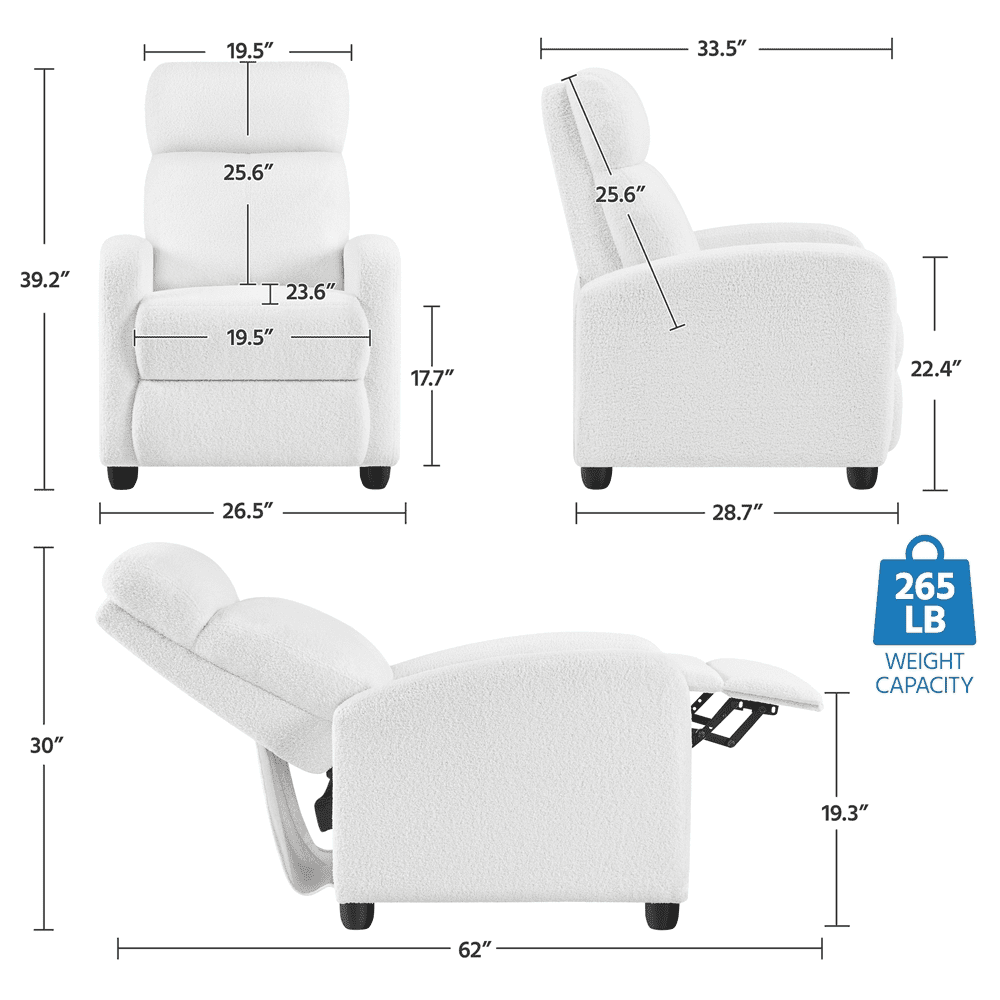 Color: Cream Materials: Polyester Boucle Fabric, Engineered Wood, Foam, Metal, Fiber Fill Assembled Dimensions: 26.5″W × 33.5″D × 39.5″H Fully Reclined Dimensions: 26.5″W × 62″D × 30″H Seat Depth: 23.6″ Seat Width: 19.5″ Seat Height: 17.7″ Armrest Width: 3.5″ Armrest Height: 22.4″ Backrest: 25.6″L × 19.5″W Footrest Adjustable Angle: 0-90° Maximum Weight Capacity: 265 lb Item Weight: 58.6 lb Shipping Weight: 66.3 lb Sturdy Wood Structure & Soft Upholstery Three Relaxation Options