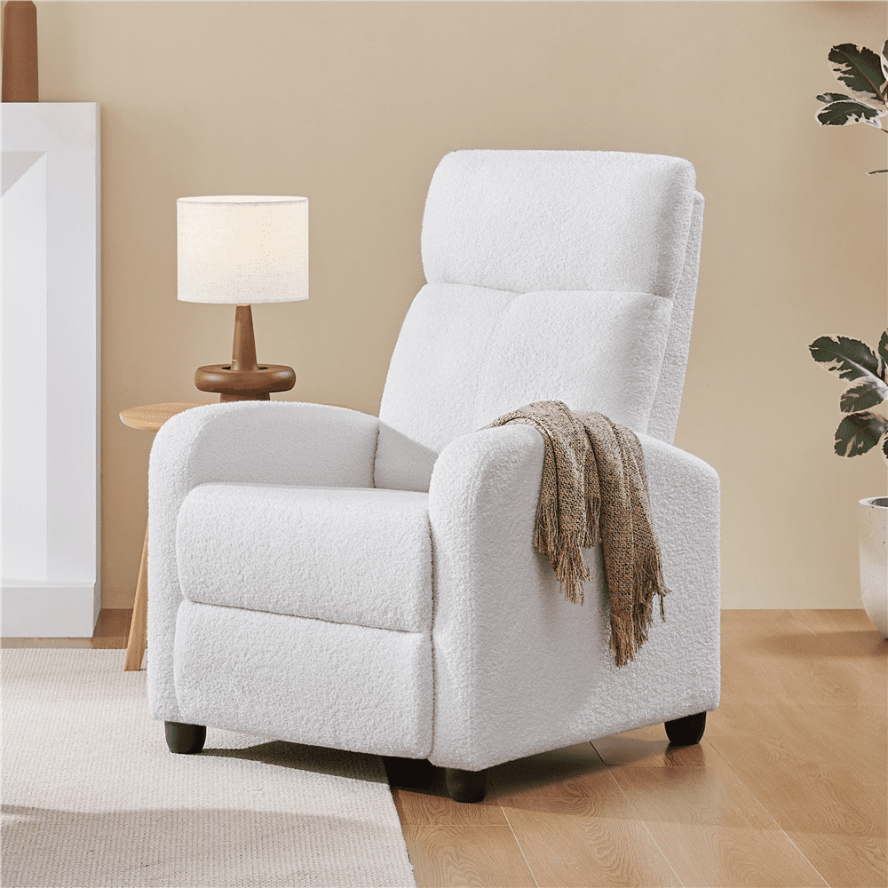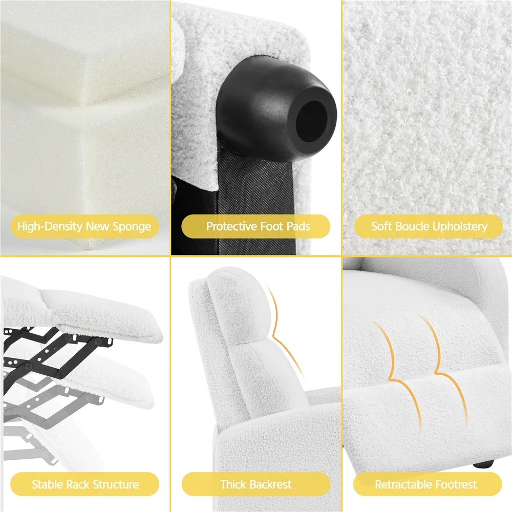 This Boucle Recliner is crafted with a sturdy engineered wood frame, soft and warm boucle upholstery, plush fiber fills, and resilient pocket springs, easily supporting up to 265 lb. Adjust the backrest and footrest to your preference – sit upright, elevate your legs, or lay flat. A gentle push on the backrest effortlessly lifts the footrest to any angle between 0 and 90 degrees. Sink into the marshmallow-like softness of the seat and backrest after a long day. This recliner is here to pamper you and provide the ultimate seating experience. Whether you place it in your living room, bedroom, home theater, office, or any other space, this reclining sofa is a fantastic addition that will elevate your space to new levels of comfort and sophistication.