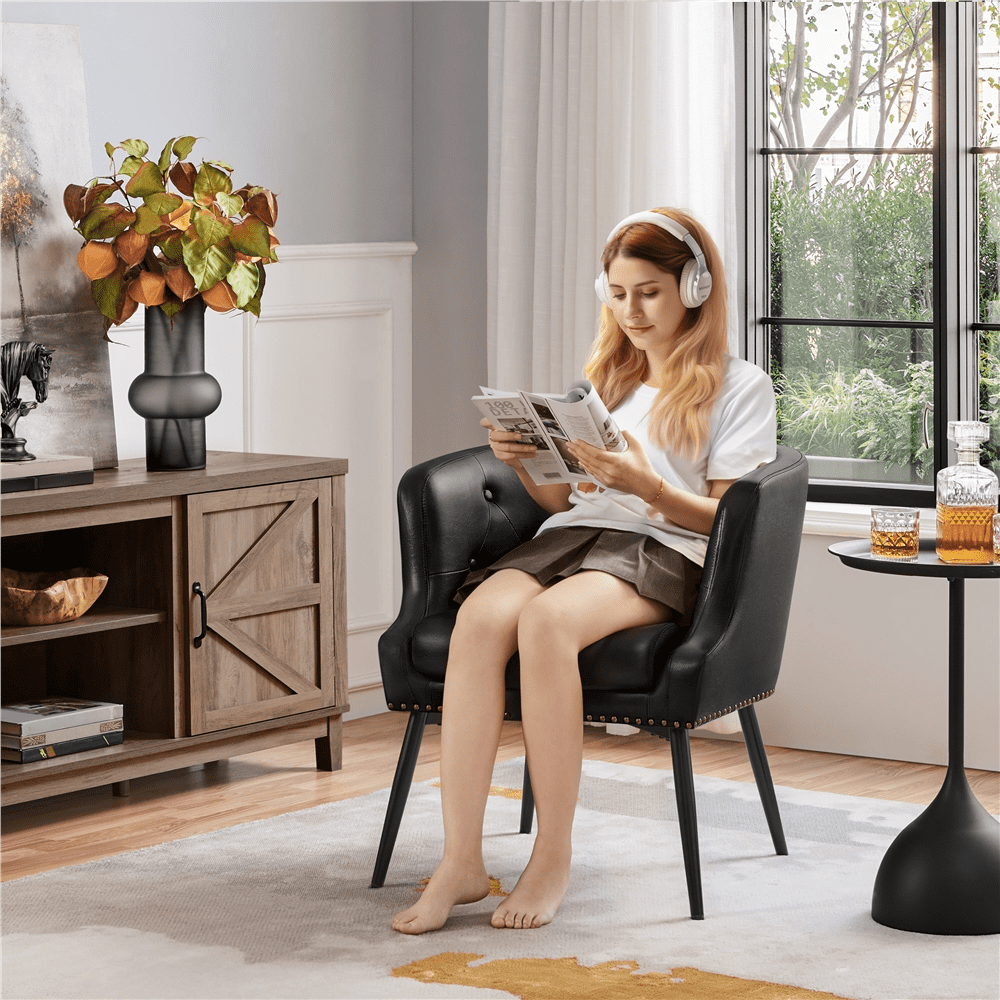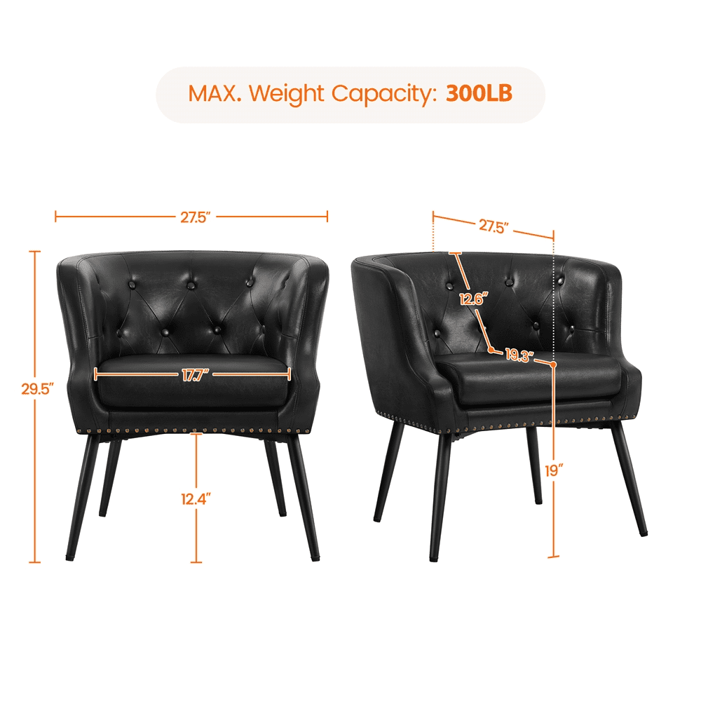 Renwick Modern Button Tufted Faux Leather Barrel Accent Chair,Black: Materials: PU leather, Foam, Metal, Composite board, Solid Wood Color: Black Assembled Dimensions: 27.5” L × 27.5”W × 29.5”H Seat Width: 17.7” Seat Depth: 19.3” Seat Height:19” Maximum Weight Capacity:300 lb Item Weight:22.8 lb Shipping Weight:29.8 lb X-shaped Support & Adjustable Feet Scoop Arms Residential Use Assembly Required