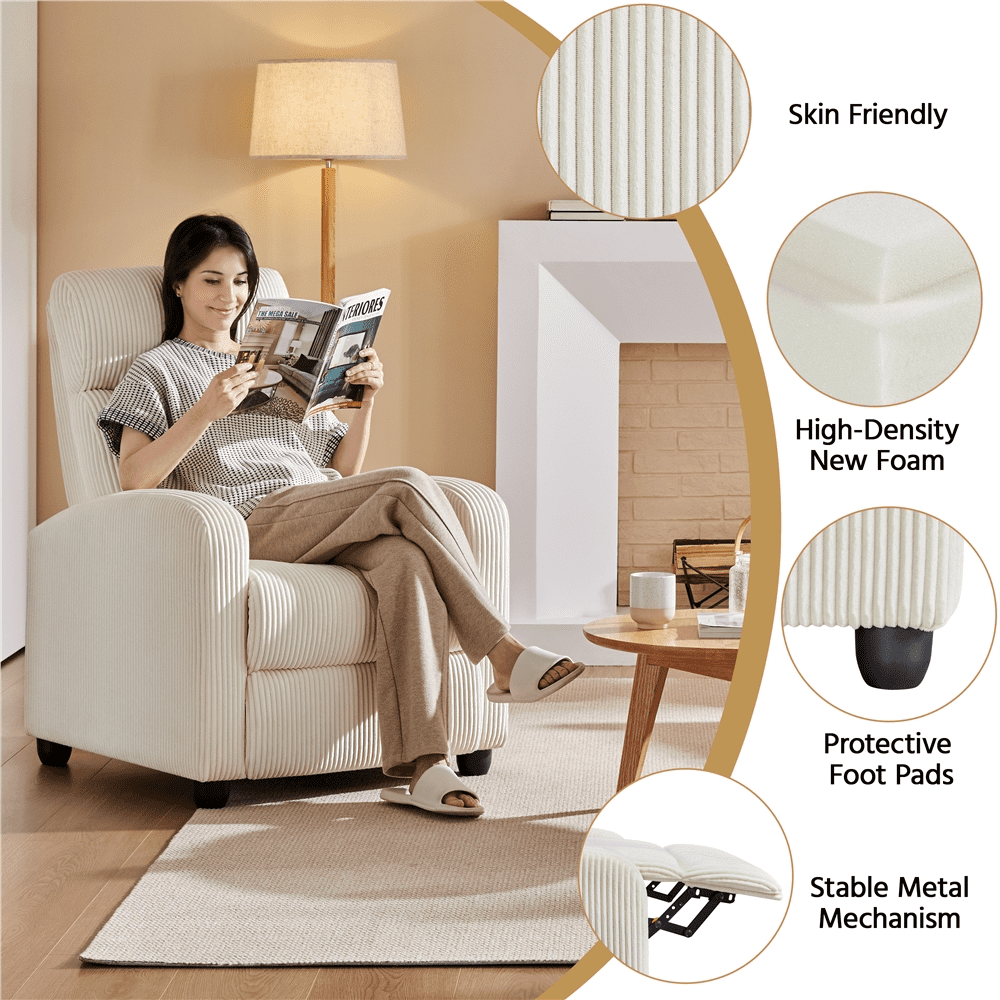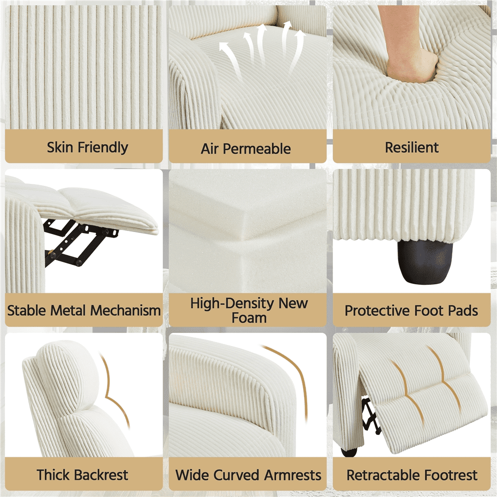 Renwick Modern Corduroy Indoor Recliner Chair with Pocket Springs, Beige: Color: Beige Materials: Polyester Corduroy Fabric, Engineered Wood, Foam, Metal, Fiber Fill Assembled Dimensions: 26.5″W × 33.5″D × 39.2″H Fully Reclined Dimensions: 26.5″W × 62″D × 30″H Seat Depth: 23.6″ Seat Width: 19.5″ Seat Height: 17.7″ Armrest Width: 3.5″ Armrest Height: 22.4″ Backrest: 25.6″L × 19.5″W Footrest Adjustable Angle: 0-90° Maximum Weight Capacity: 265 lb Item Weight: 58.9 lb Shipping Weight: 66.1 lb Strong Build & Soft Fabric Long-lasting Frame & Plush Comfort