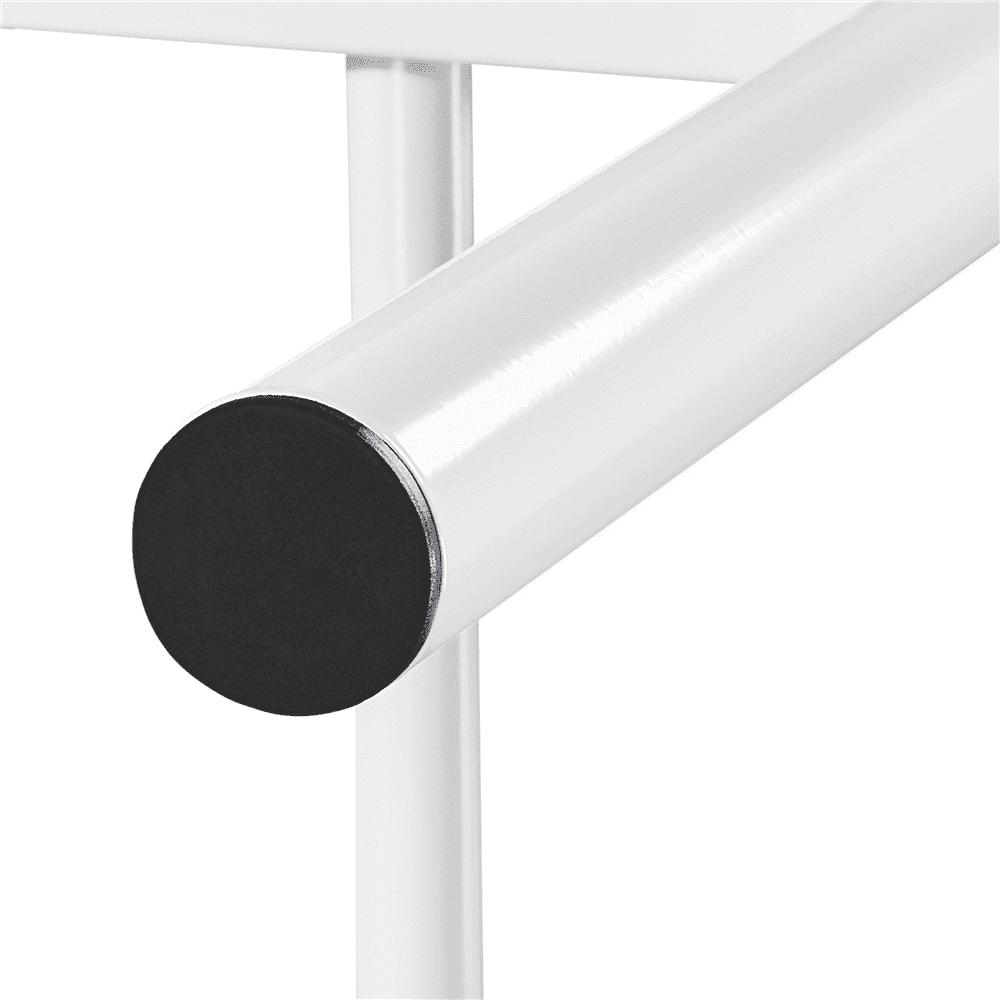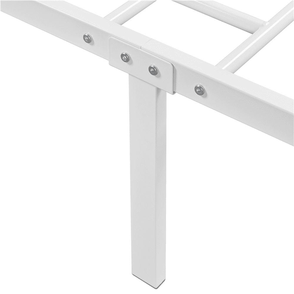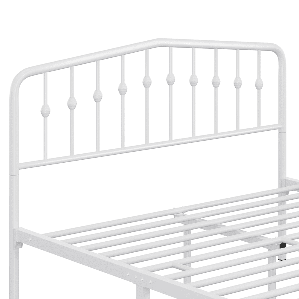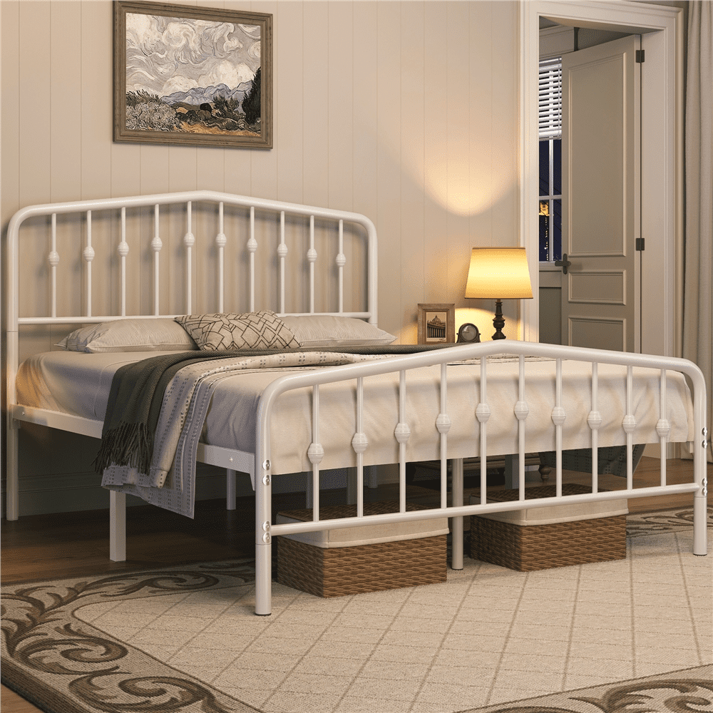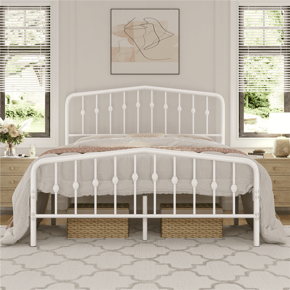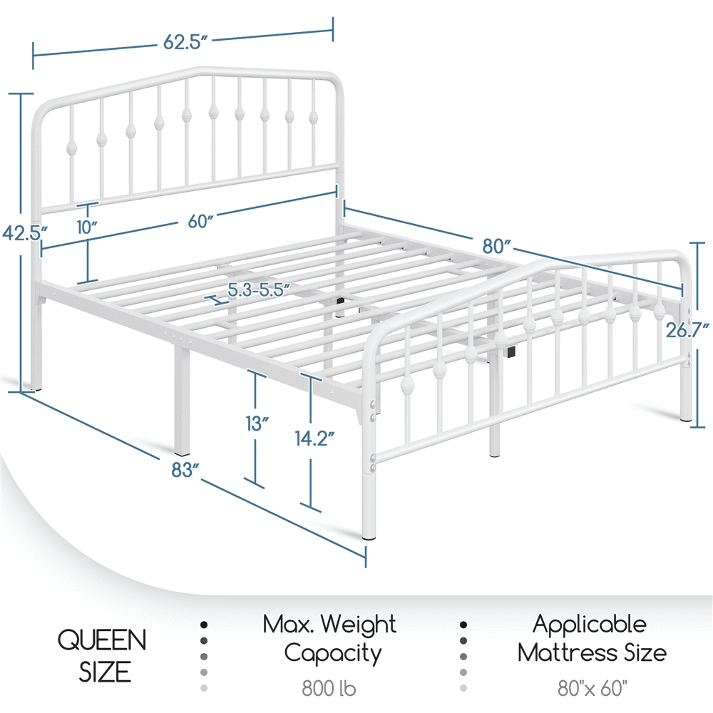 Renwick Modern Queen Size Metal Platform Bed with Arched Headboard and Footboar, White, Adult: Dependable Foundation: This white queen bed frame includes side rails, 12 metal slats and 10 support legs, with a high weight capacity of 800lb. Comfortable Off-ground Height: The platform bed frame with headboard has 13 inches of clearance room underneath, which allows easy access to the boxes and baskets underneath while also making it easier to get into and out of the bed, making it suitable for sleepers of all ages. No Box Spring Needed: The 12-slat support system of this bed frame eliminates the need for a clumpy box spring, so once you’ve tracked down a suitable mattress, you’re good to go. The slats are properly spaced 5.5-5.5″ apart. Material: Iron Color: White Assembled Dimensions: 83″ L × 61″ W × 42″ H Applicable Mattress Size: 80″ L × 60″ W Maximum Weight Capacity: 800 lb Slat Spacing: 5.3-6″ Distance between Headboard and Bedstead: 9.6″ Item Weight: 47.1 lb Shipping Weight: 53.6 lb