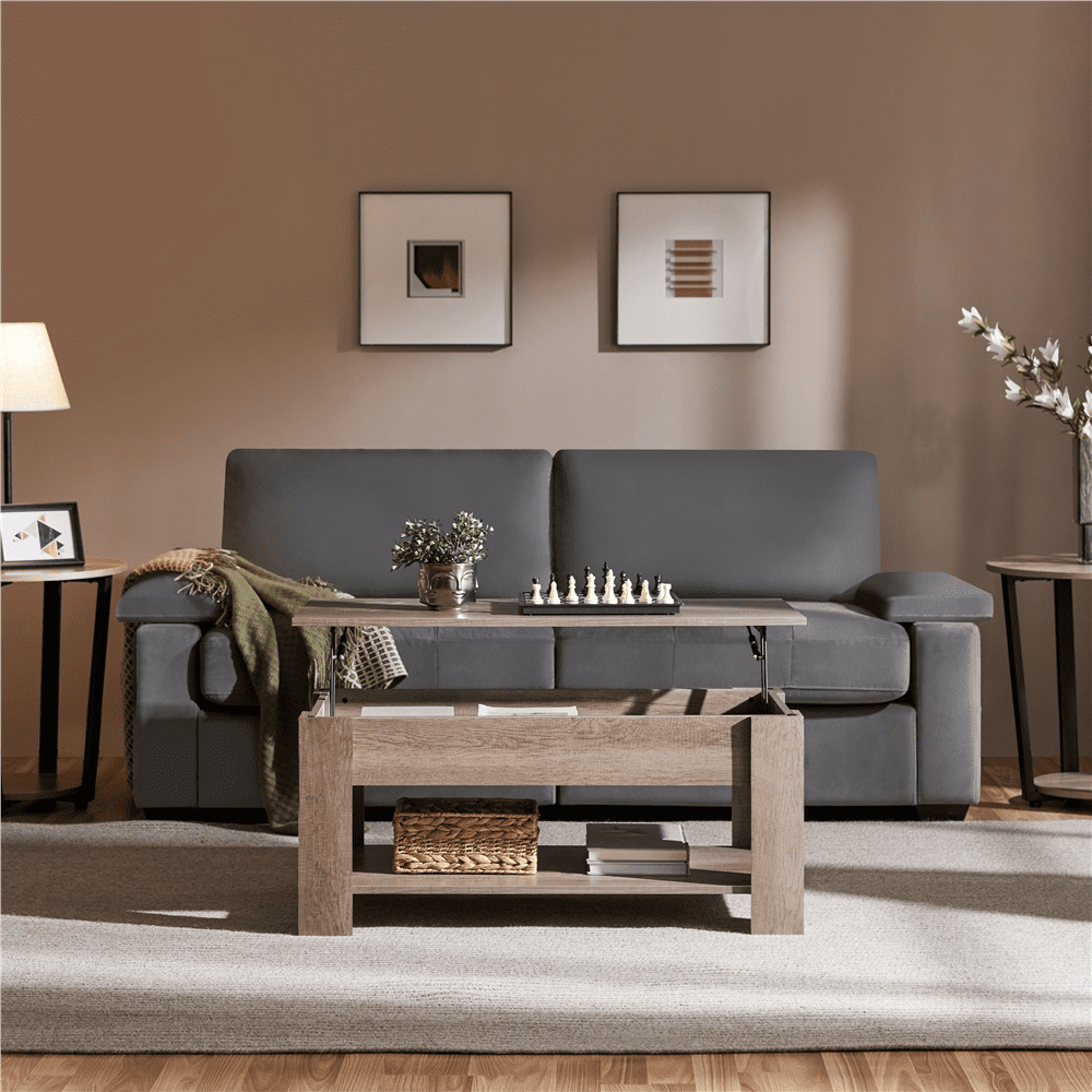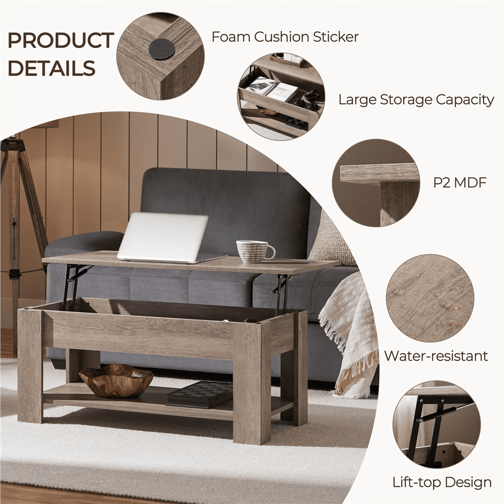 Renwick Modern Rectangle Wood Coffee Table with Storage, Gray Color: gray Material: MDF, metal Overall dimensions: 98 x 50 x (41.8-55) cm / 38.6 x 19.7 x (16.5-21.7)” (LxWxH) Storage inner size: 86 x 39 x 10.6 cm/ 34 x 15.4 x 4.2″ (LxWxD) Distance between storage and shelf: 18.5 cm / 7.3″ G.W.: 21.1 kg / 46.4 lb N.W.: 17.9 kg/ 39.4 lb Max. load capacity: total: 35kg/77lb; tabletop (when extended): 10kg/22lb; storage compartment: 15kg/33lb; bottom shelf: 18kg/40lb For your safety, please do not stand on the tabletop. Please be careful with your fingers when lifting/lowering the tabletop. Please allow ±1cm/0.5” errors due to manual measurements. Functional accent table Protective pads Worry-free assembly Easy-to-maintain melamine surface Residential Use Assembly Required