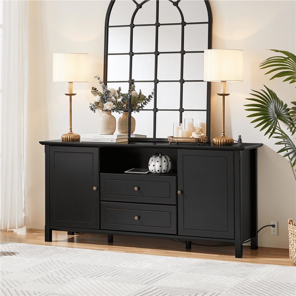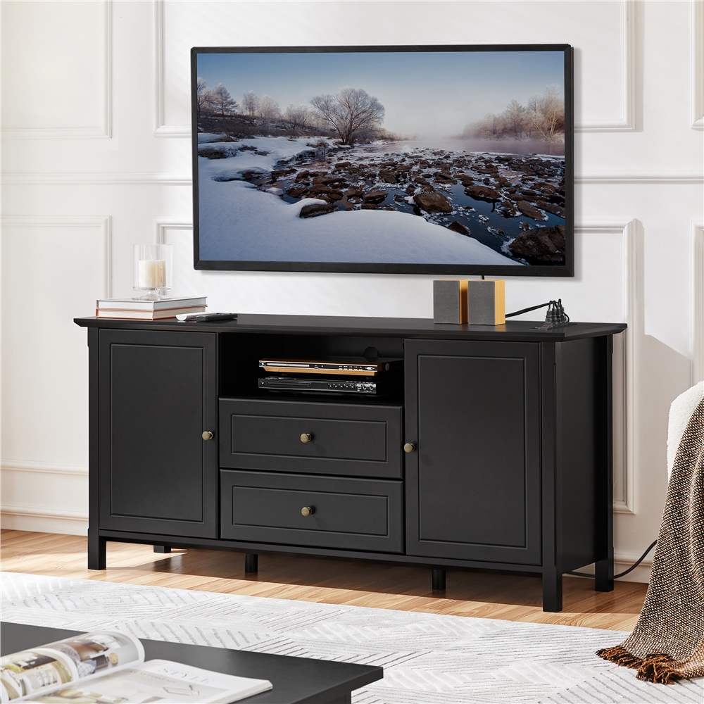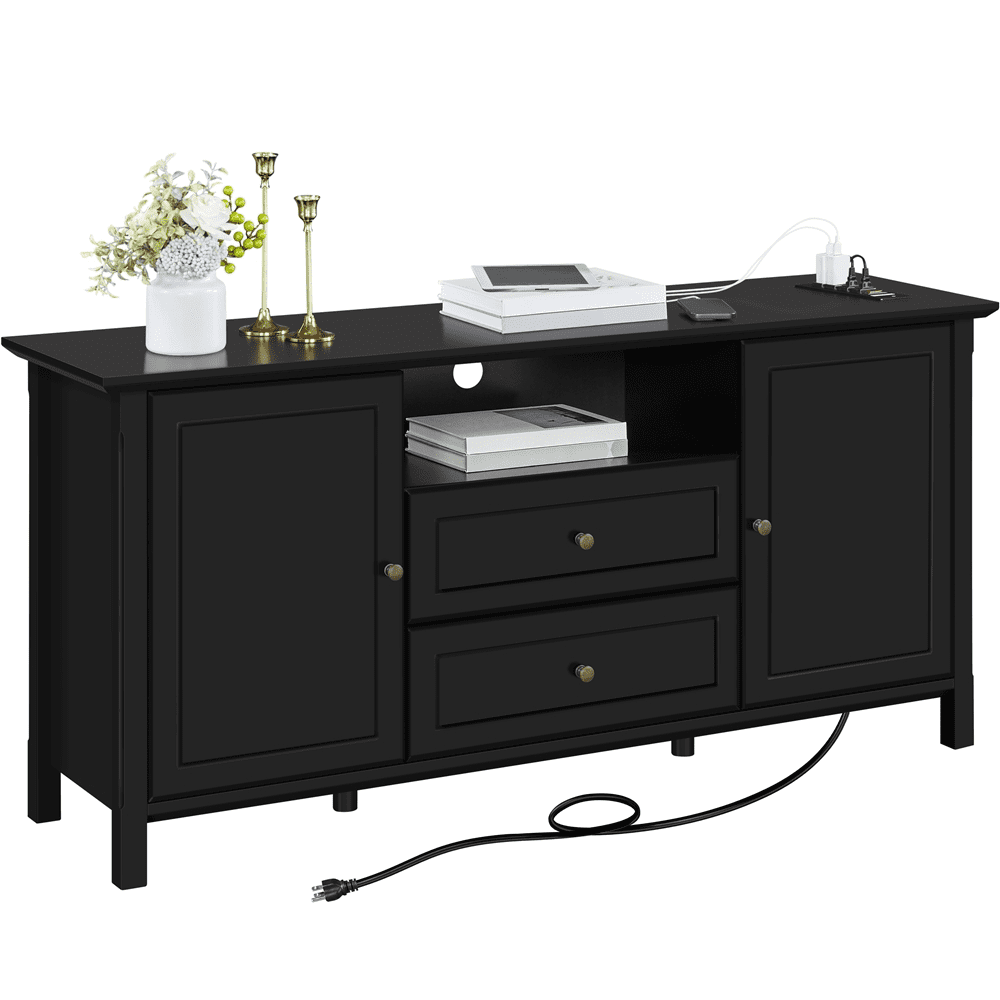Renwick Modern TV Console Table with Power Outlet for TVs up to 65”, Black : Colour: Black Materials: MDF Board Overall Dimensions: 58” L × 16” W × 27.5” H Open Department: 7” H × 22” W × 13” D Drawer Inner Size: 20.2” L × 11.2” D × 4.9”H Ground Clearance: 3” Max Weight Capacity: Top: 176 lb Fixed Panel: 44 lb Movable Panel: 22 lb Drawer: 11 lb Item Weight: 91.5 lb Shipping Weight: 102 lb Power Outlet: Cord Length:6.5ft Rated Power: 1500 W Ports: 4 AC Comprising: Switch & Hook & Loop Plugs: 3-plug Cable: Double-insulated Round Wire Assembly Required Residential Use