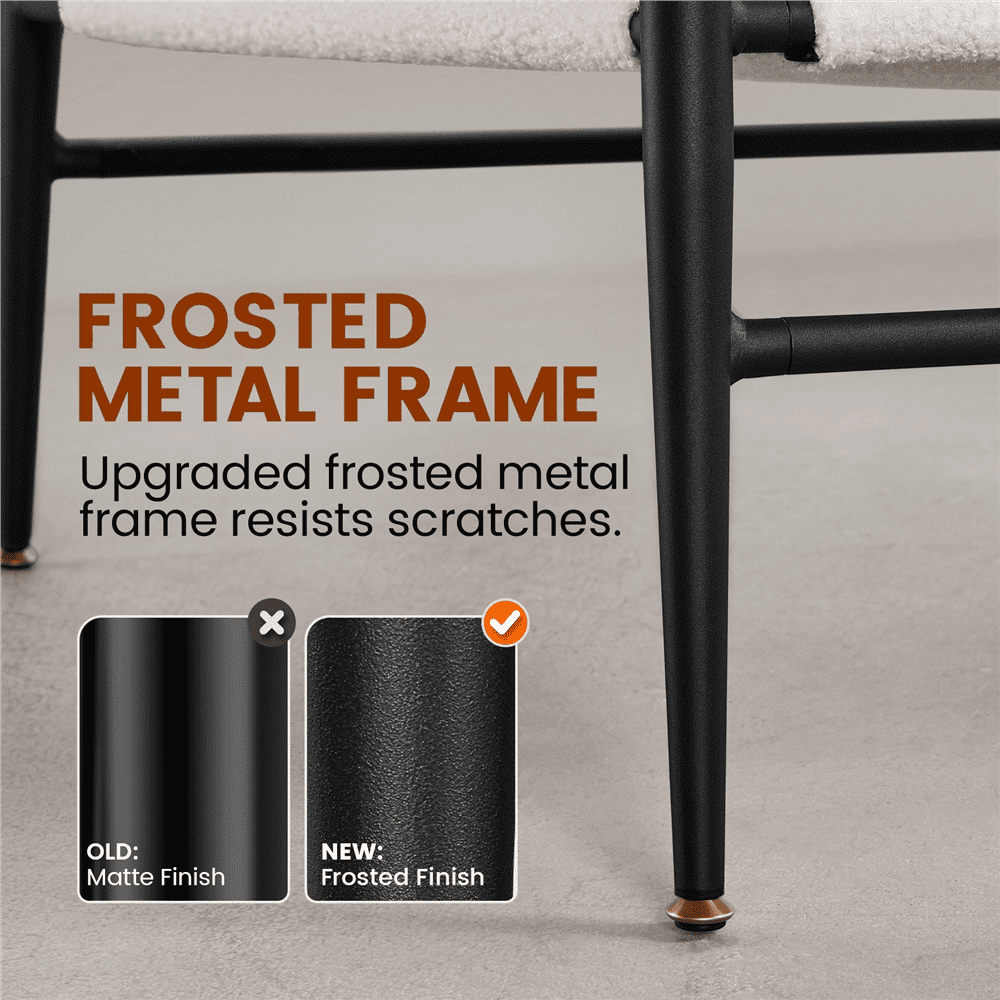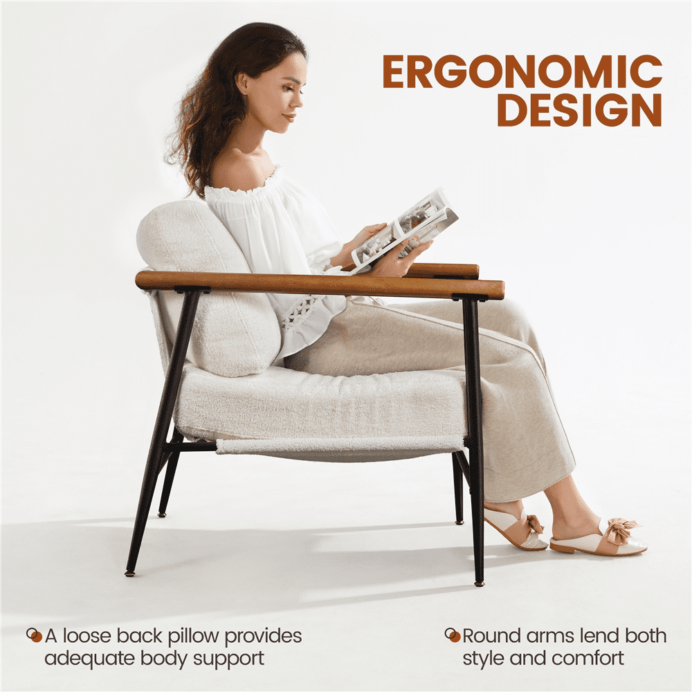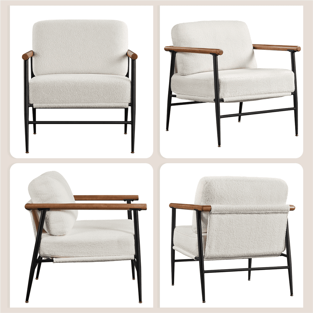 If you’re looking for an eye-catching accent chair ideal for relaxing, reading and movie nights, this boucle accent armchair is worth a look. This faux fur accent chair combines a streamlined metal frame with cozy teddy boucle upholstery, which will go well with most modern home decor. Brown wood arms add warmth and retro elegance to your space. A slanted backrest, extra-wide cushioned seat, and ultra-long armrests offer optimal comfort and support in any seating position. The pocket coil seat is made of ultra-durable steel materials that quickly bounce back to its original shape when you rise, providing the support you need. This stylish side chair will be a focal point wherever it’s used, including but not limited to the living room, lounge, bedroom, apartment, office, and more.