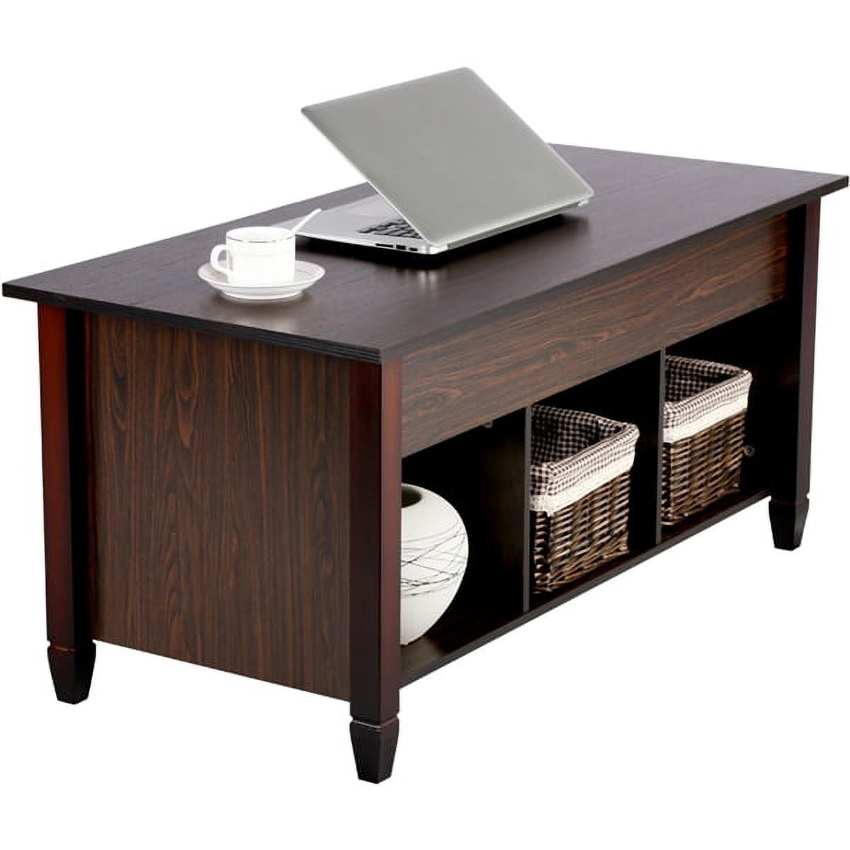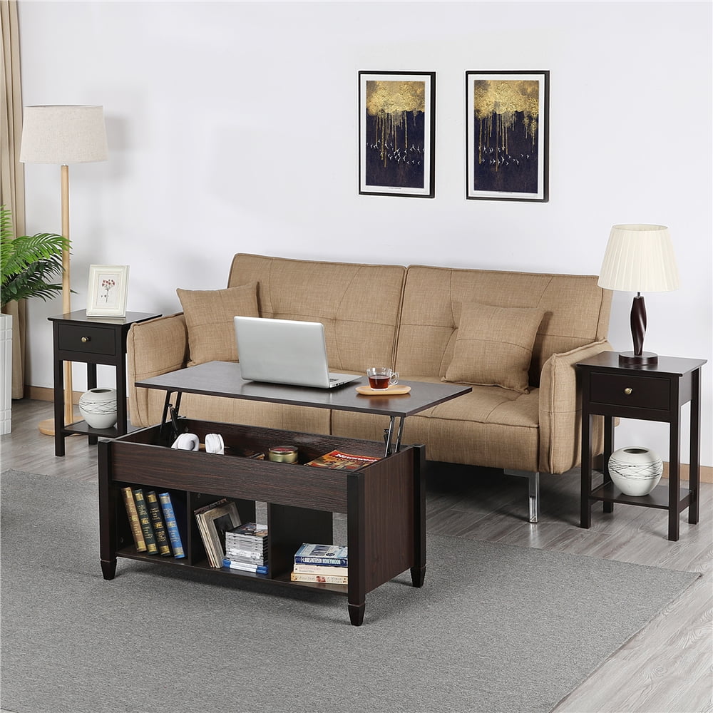 Lift Top Coffee Table Compartment & Shelf for Living Room Coffee Color: dark walnut Material: MDF, solid wood, metal Overall Dimensions (closed top): 104.5 x 49.5 x 48.8 cm / 41.1 x 19.5 x 19.2″(LxWxH) Overall Dimensions (extended top): 104.5 x 49.5 x 62.5 cm / 41.1 x 19.5 x 24.6″ (LxWxH) Compartment Inner Size: 90.6 x 37.4 x 12 cm/ 35.7 x 14.7 x 4.7″(LxWxD) Open Cubby (ea.): 29.3 x 39.5 x 25 cm/ 11.5 x 15.6 x 9.8″(WxDxH) G.W.: 24.1 kg / 53.1 lb N.W.: 21.3 kg/ 46.8 lb Max. load capacity: total: 55 kg / 121 lb tabletop (when extended): 10 kg / 22 lb top compartment: 20 kg / 44 lb bottom shelves: 16 kg / 35 lb 1. For your safety, please do not stand/sit on the tabletop. 2. Please be careful with your fingers while lifting/lowering the tabletop.