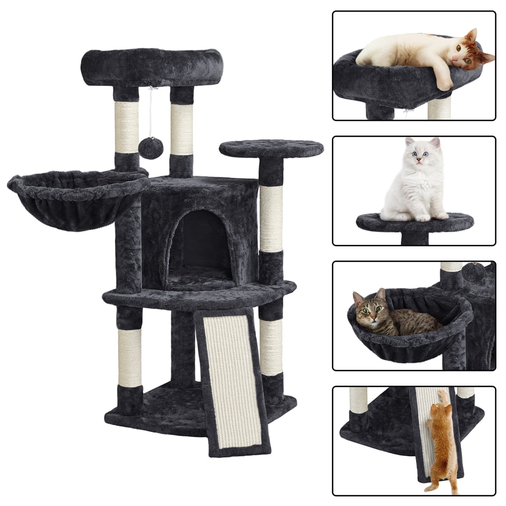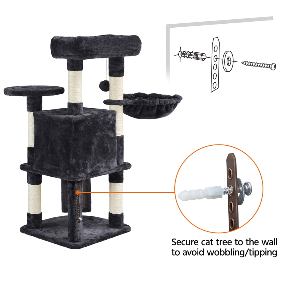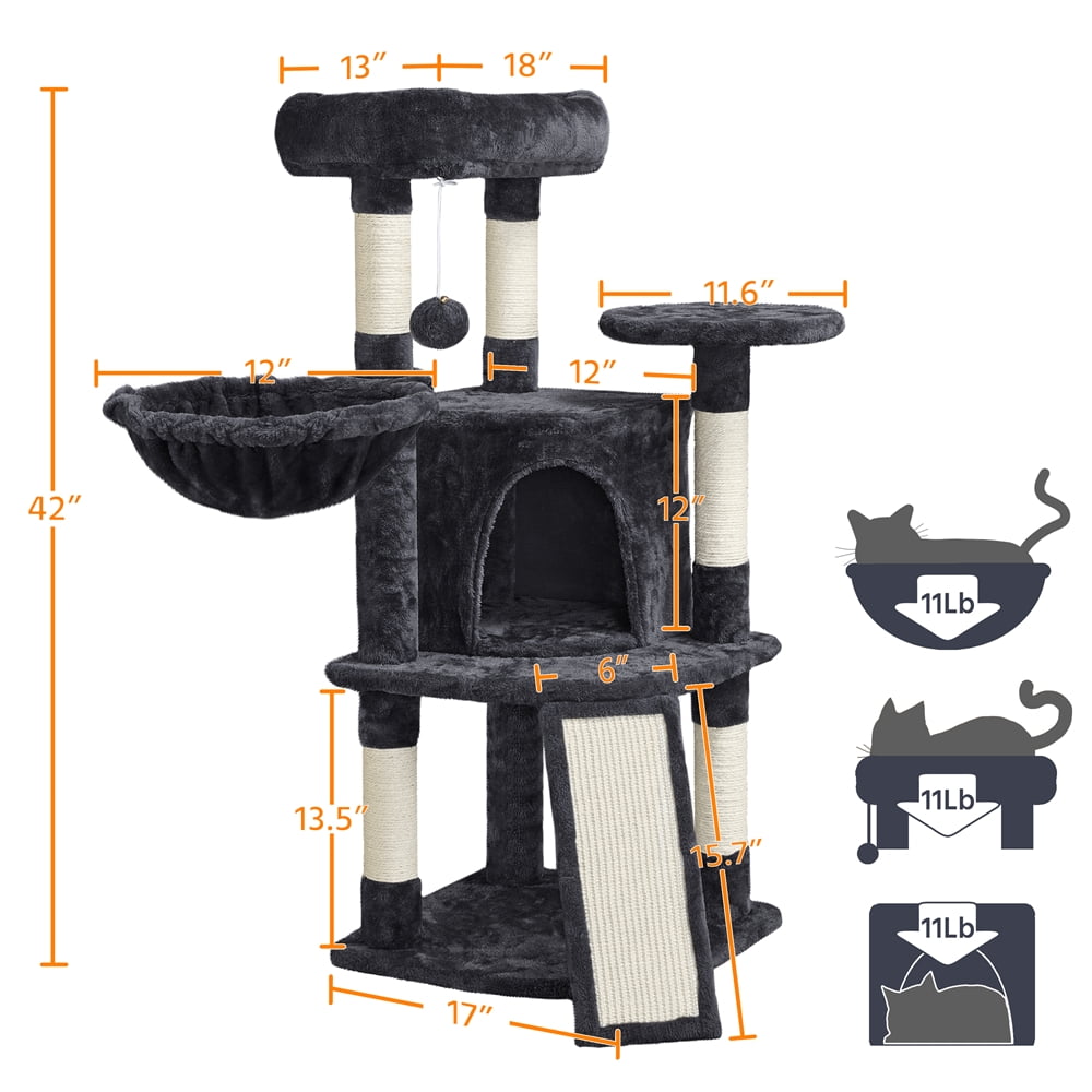 Renwick Professional Cat Tree Plush Cat Tower with Basket for Indoor Small Kittens, Black: Material: Particleboard, plush, sisal rope, metal, paper tube, and plastic Color: Black Overall size: 17 x 17 x 42inch (L x W x H) Condos size: 12 x 12 x 12inch (L x W x H) Scratching board size: 15.7 x 6inch (L x W) G.W.: 22.5lb N.W.: 20.7lb Note:Please allow ±0.5inch error due to manual measurement. Residential Use Assembly required
