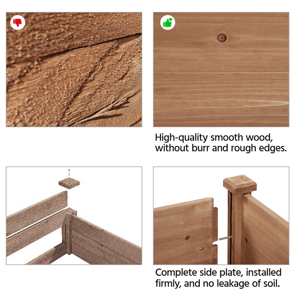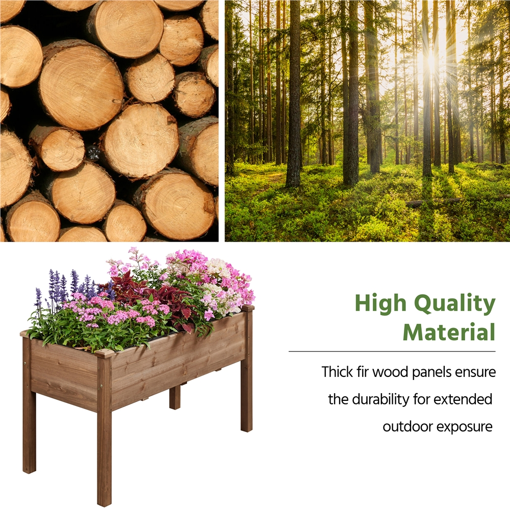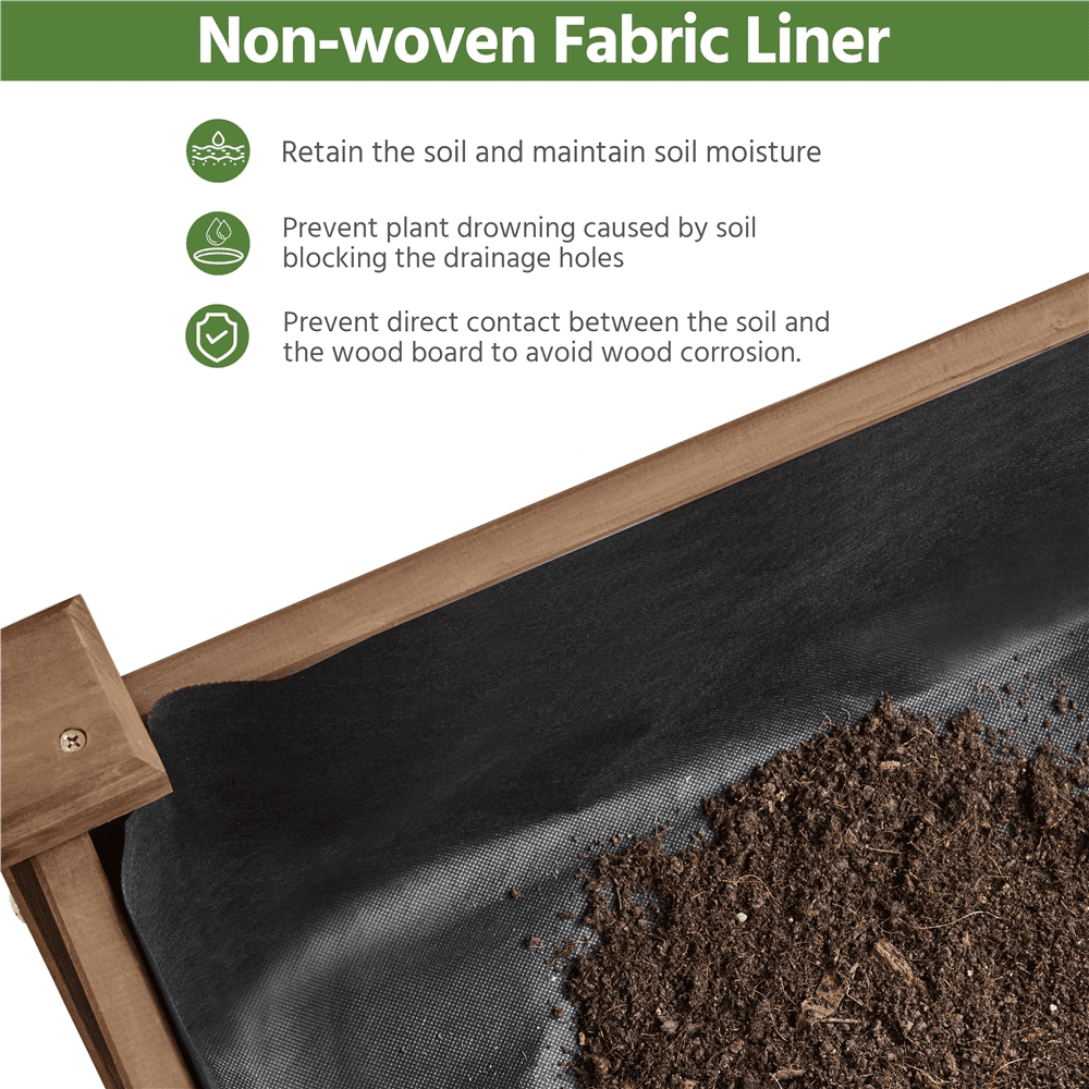 Color: Dark Brown Material: Fir wood, Non-woven Fabric Assembled Dimensions: 47.5″ L × 23.5″ W × 30″ H Inner: 44.5″ L × 20″ W × 8″ H Maximum Weight Capacity: 221 lb Assembled Weight: 23.5 lb Shipping Weight: 26.3lb Stable Rectangle Structure Fabric Liner & Drainage Holes Residential Use Location: Outdoor Assembly Required
