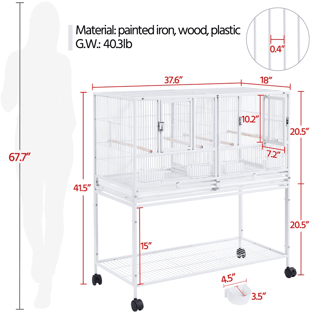 *Renwick Rolling Wide Bird Cage Stackable Divided Breeder Cage for Small Birds Lovebird, White : Color: hammered white Material: painted iron, wood, plastic Overall dimension: 37.6x18x41.5″ (LxWxH) Cage size: 37.6x18x20.5″ (LxWxH) Stand size: 37.6x18x20.5″ (LxWxH) Bar spacing: 0.4″ Door size: 7.2×10.2″ (WxH) Ground clearance: 4.5″ G.W.: 40.3lb Note: Please allow ±0.2″ errors due to manual measurements. Assembly Required Color: White