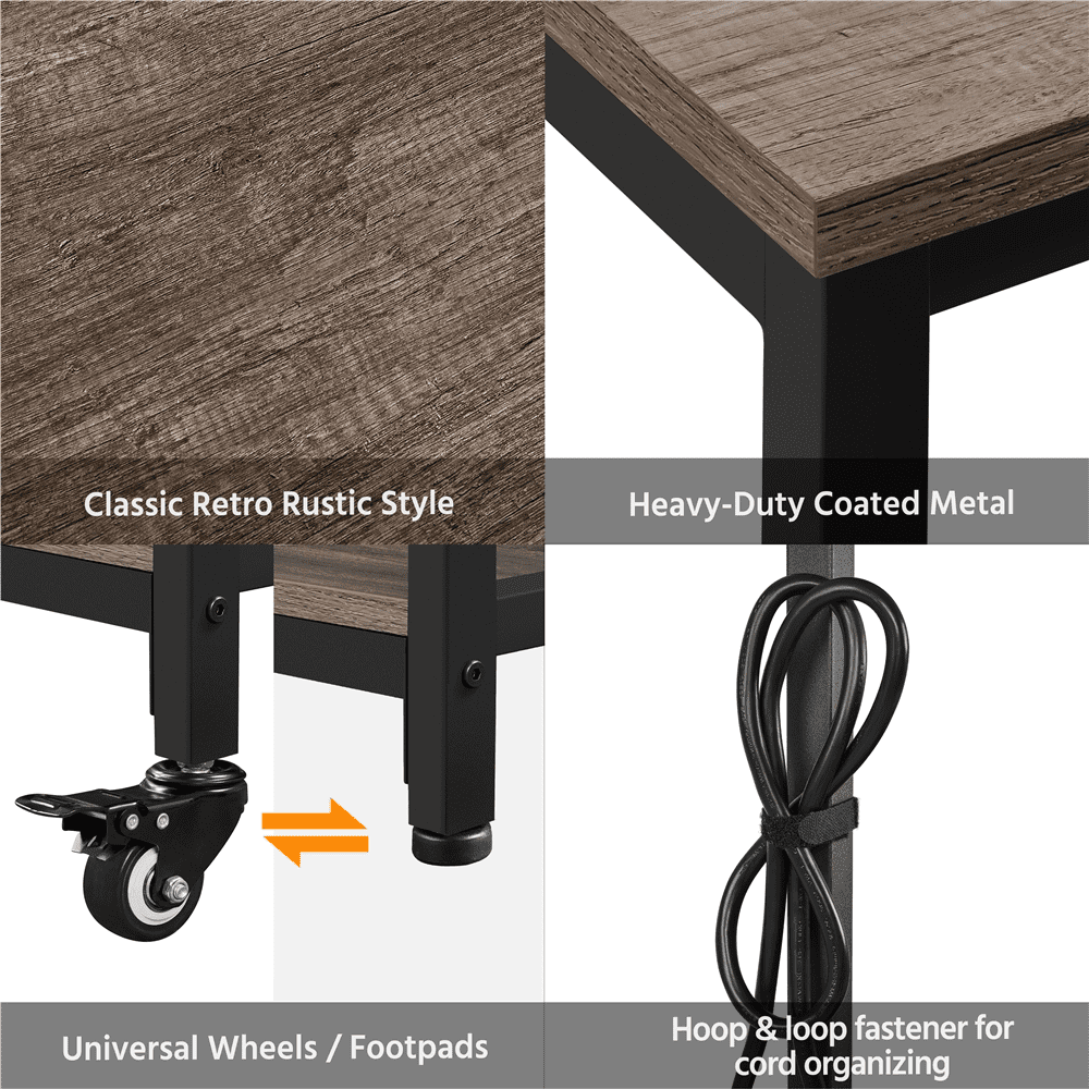This kitchen cart is constructed of durable CARB P2-compliant MDF and powder-coated metal, ensuring its sturdiness, durability, and an excellent overall weight capacity of up to 352 lb. Plus, the countertop and shelves have a water-resistant surface, making cleaning a breeze. For more convenience, our portable kitchen island comes with two built-in AC power outlets and an OCP (Over Current Protection) switch for small kitchen appliances. And don’t worry about safety – just flick the switch off when you’re done using them. What’s better is that our movable kitchen cart sits on four wheels, two of which have brakes, ensuring smooth and effortless rolling. Need to keep it stationary? No problem! Just remove the casters and replace them with adjustable footpads. Other cool features like 3 mug holders, 3 wine glasses holders, and 8 S-shaped hooks allow for flexibility and convenience in your kitchen arrangement. Moreover, its rustic industrial design is totally on-trend and versatile. You can use it as a small coffee bar in your dining or living room, or office. Simple assembly is required.