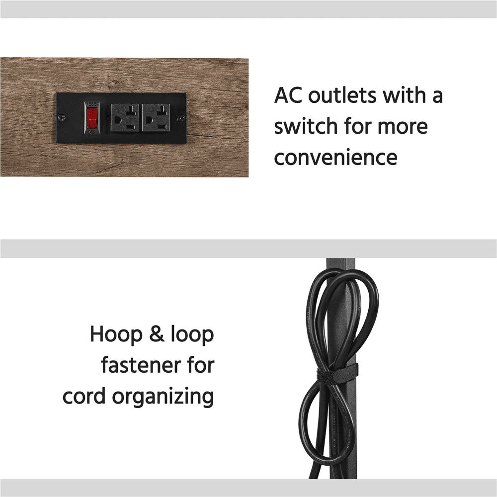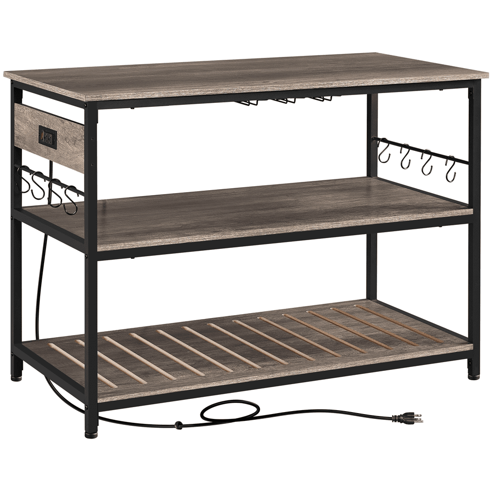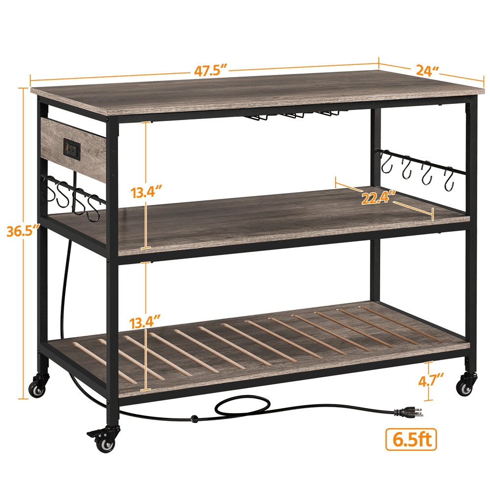 Renwick Rolling Kitchen Island Cart with Charge Station, Taupe Wood: Color: Taupe Wood Countertop, Black Stand Materials: MDF, Metal Assembled Dimensions (on wheels): 47.5″ L × 24″ W × 36.5″ H Assembled Dimensions (on footpads): 47.5″ L × 24″ W × 34″ H Countertop: 47.5″ L × 24″ W Shelf: 44″ L × 22.4″ W Distance Between Shelves: 13.4″ Ground Clearance: 4.7″ Maximum Weight Capacity: countertop: 88 lb, shelf (ea.): 88 lb, hook (ea.): 11 lb Item Weight:68 lb Shipping Weight:76 lb 2-Socket Power Outlet: Port: 2 AC Outlets Power Cord Length: 6.5′ Cable Type: Double-insulated Round Wire