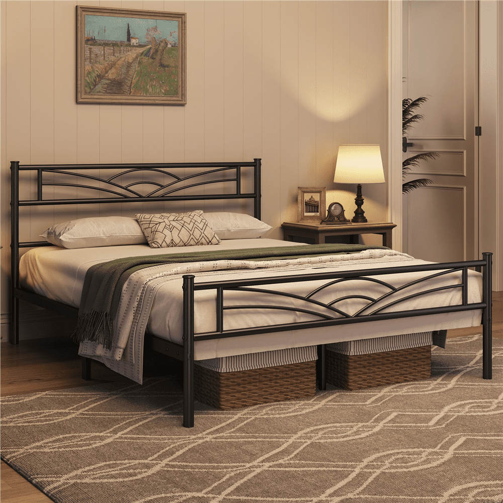 Renwick Skylar Cloud-Inspired Design Metal Platform Bed, Queen, Black, Adult: Sturdy Foundation: This queen size bed base is built with solid side rails, an extra center rail, sturdy support legs, and 12 metal slats to provide support and comfort to your body and mattress. It can support 800 lbs. Integrated Headboard & Footboard: The metal bed frame with headboard & footboard provides extra protection to your body and helps to hold the covers or blankets in place. Hide Clutter for a Tidier Home: Under the metal bed frame is a ground clearance of 11.2 inches. You can take advantage of this space to store book boxes, quilt containers, clothes organizers, shoes, and other belongings, which is desirable for small bedrooms or bedrooms with limited storage options. No Box Spring Required: The 12-slat support system eliminates the need for a clumpy box spring, so once you’ve tracked down a suitable mattress, you’re good to go. The slats are spaced 5.3-5.5″ apart. Material: Iron Color: Black Overall Dimensions: 83″ L × 63″ W × 35″ H Applicable Mattress Size: 80″ L × 60″ W Maximum Weight Capacity: 800 lb Ground Clearance: 11.2″ Slat Spacing: 5.3-5.5″ N.W.: 45.6 lb G.W.: 50.7 lb