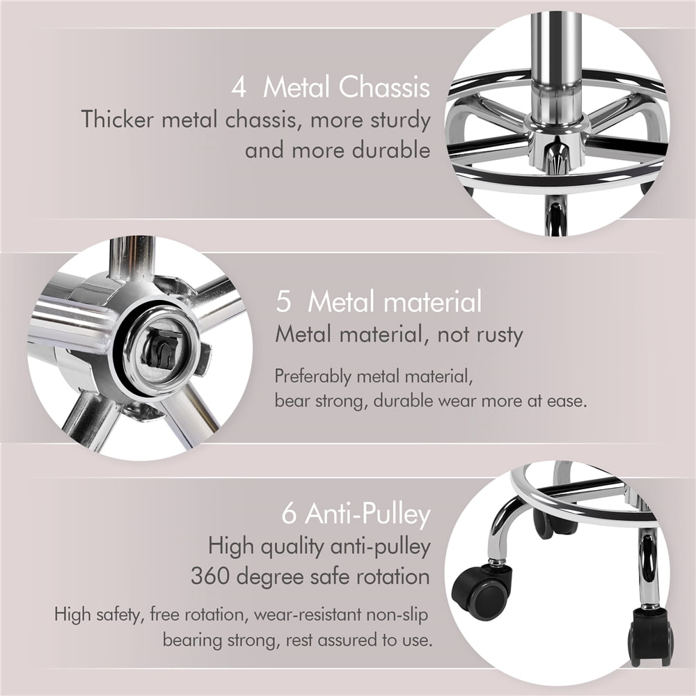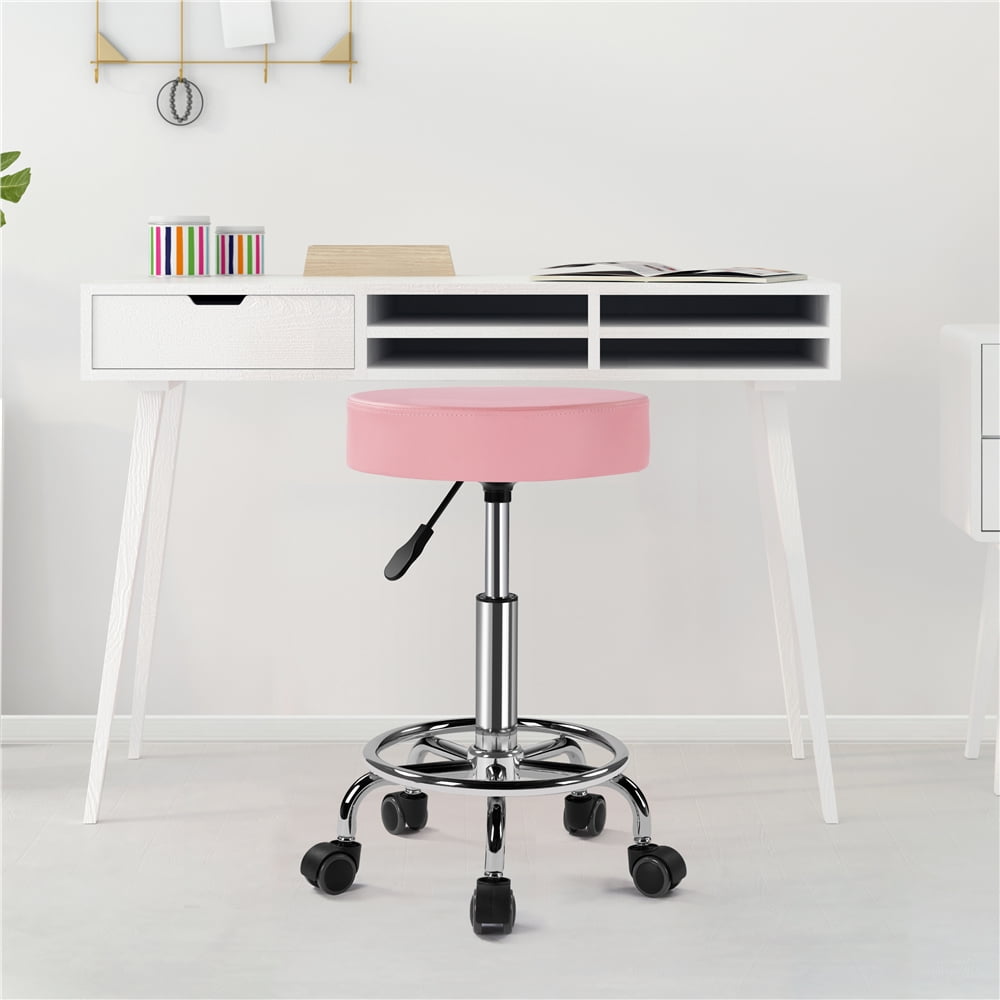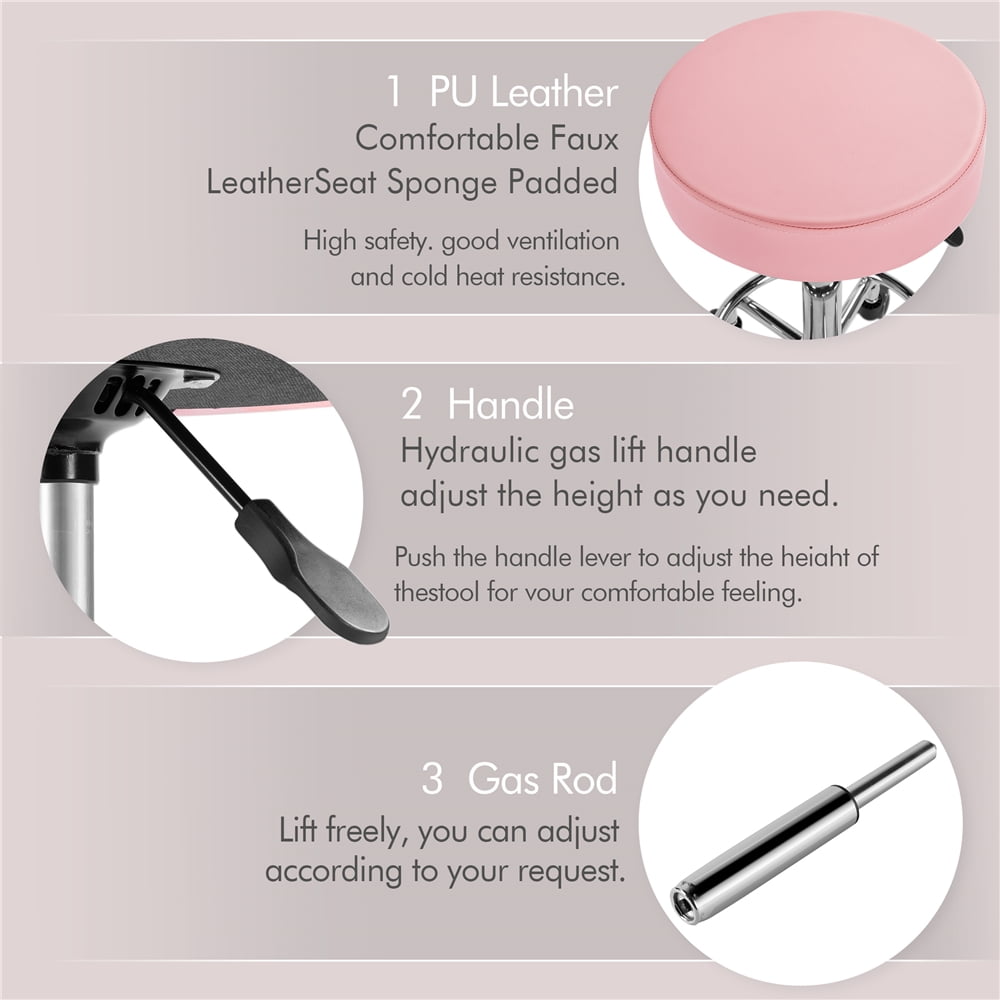 Renwick Adjustable Rolling Salon Stool Swivel Spa Massage Manicure Stool, Pink: Material: PU Leather & Sponge & Chromed Iron Overall Size (Approx.): 15″ x 20″ – 25.6″ H) The thickness of seat: 3.3″ Color: White G.W.: 9 lb Features: The thick sponge seat with a footrest gives you a comfortable experience. You can put your feet on the solid metal footrest. The rolling stool made of durable materials can hold up to 264.5 lb. This black rolling chair is designed with 5 smooth castors. The stool can move smoothly without causing damages to the ground. The massage stool is perfect for the situation where requires repeatedly swift movements or changes in orientation. Hydraulic gas lift makes it easier to adjust the height of salon stool from 20″ to 25.6″. You just need to push the handle lever to adjust the height of the stool for your comfortable feeling. This salon & spa stool is designed with a waterproof PU leather surface, and the legs and bottom part are made of chrome metal to ensure that the stool will not get rusted. Assembly Required Residential Use
