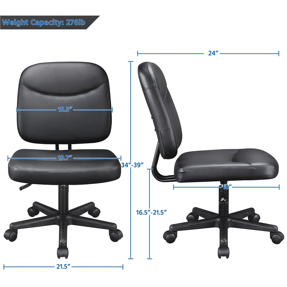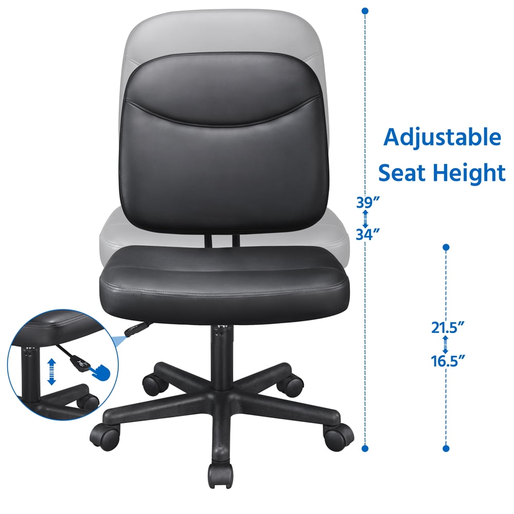 [Selected Materials] Our armless office chair boasts a robust five-star base and five nylon casters, promoting stability and effortless movement. It includes a high-density foam-padded seat with a waterproof faux leather covering. The SGS-certified gas lift ensures safe, smooth height adjustments [Spacious Seat]Experience comfort with our smart office chair featuring an extra-large seat measuring 20″ W × 18″ D. Padded with high-density foam, it offers a soft and comfortable feel, ideal for extended working sessions [360° Swivel & Adjustable Seat Height] The 360-degree swivel feature enhances mobility, facilitating seamless collaboration with colleagues and convenient access to file cabinets. Adjust the seat height from 17″ to 21.7″ for customized comfort, ensuring alignment with various desk heights [Ergonomic Backrest] The mid-back backrest provides enough lumbar support to an individual’s back. Releasing the pressure on your lower back to ease your office hours [Simple & Versatile Look]Classic color and design make the armless office chair suitable for home offices, work offices, conference rooms, meeting areas and training rooms. The traditional look delivers a sense of simplicity and delicacy Age Group: Adult