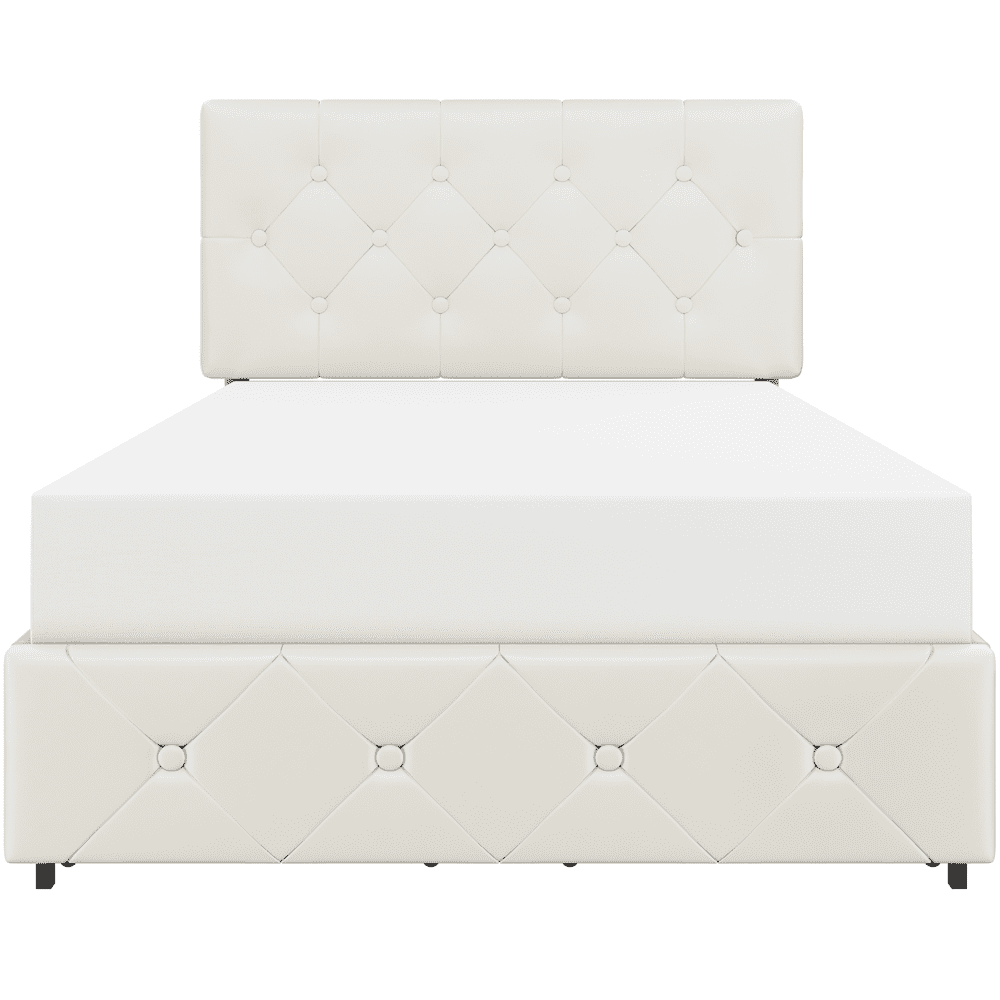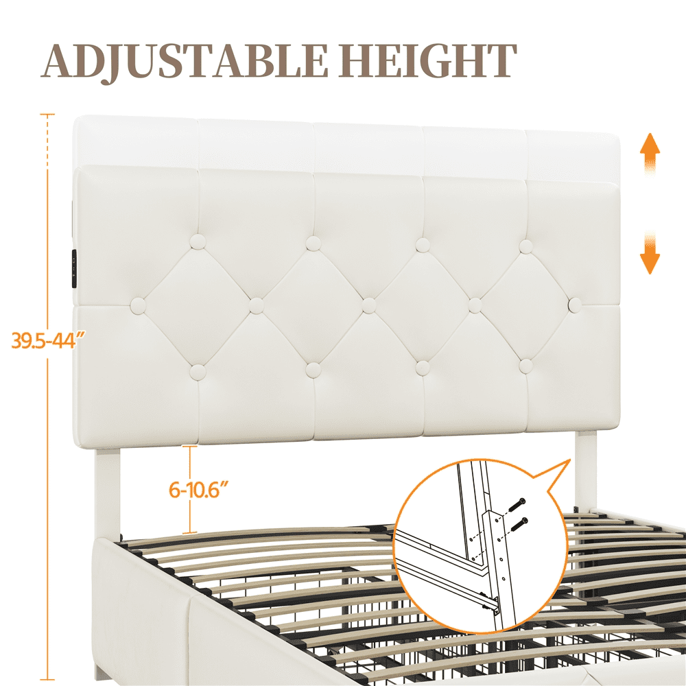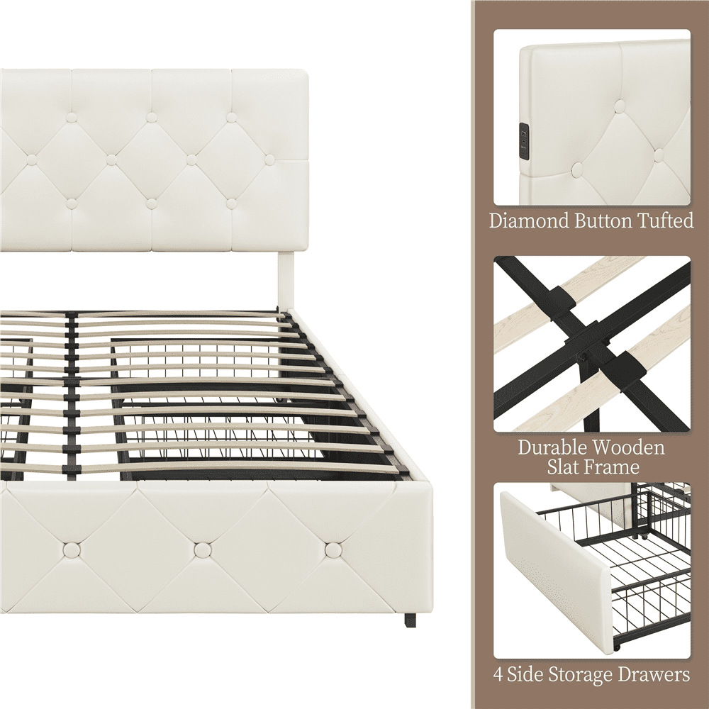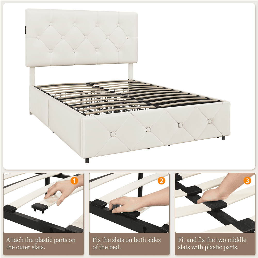Renwick Faux Leather Upholstered Bed with 4 Storage Drawers and USB Ports,Full,Beige: Color: Beige Slat Quantity: 24 Materials: MDF, Metal, PU leather, Foam Assembled Dimensions:78” L × 59” W × (39.5-44)” H Applicable Mattress Size: 75”L × 54” W Drawer Rack (each): 31.5” L × 19.7” W × 6”H Adjustable Headboard Height:39.4-44” Bedstead Height:11.4” Headboard Width:23” Slat Spacing: 4” Distance between Headboard and Bedstead: 6-10.6” Maximum Weight Capacity: 705 lb Item Weight: box #1:57.3lb; box #2: 40.2 lb Shipping Weight: box #1: 64.6 lb; box #2: 45.4 lb Stable Leg Support Faux Leather Upholstery Residential Use Assembly required