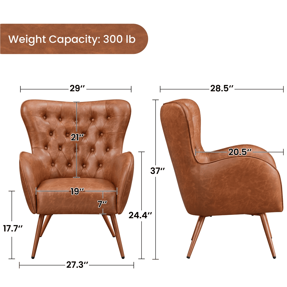 Renwick Vintage Faux Leather Accent Chair with Diamond Button for Living Room, Brown: Materials: PU Leather, Metal, Foam, Plywood, Pocket Springs Color: Brown Overall Dimensions: 29” L × 28.5” W × 37” H Seat Width: 19” Seat Depth: 20.5” Seat Height: 17.7” Arm Height: 24.4” Maximum Weight Capacity: 300 lb Net Weight (assembled product weight): 26.5 lb Gross Weight (product in the box): 33 lb Mid-century Modern Vibe Sofa-level Seat Cushion Residential Use Assembly Required