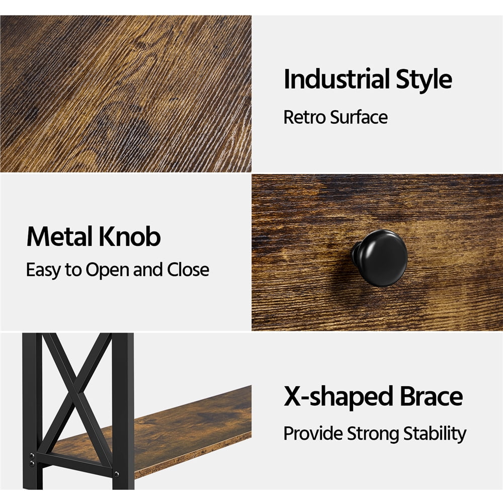 Renwick Wooden Console Table with 1 Drawer and 2 Open Shelves for Livingroom, Rustic Brown: Color: Rustic Brown Materials: MDF & Iron Overall Dimensions: 39.5″ L × 12″ W × 32″H Inner Drawer:33.5″ L × 9″ Depth × 3.5″ H Max Weight Capacity: Top: 198 lb Middle: 55 lb Drawer: 22 lb Item Weight: 44.5 lb Shipping Weight: 48.3 lb