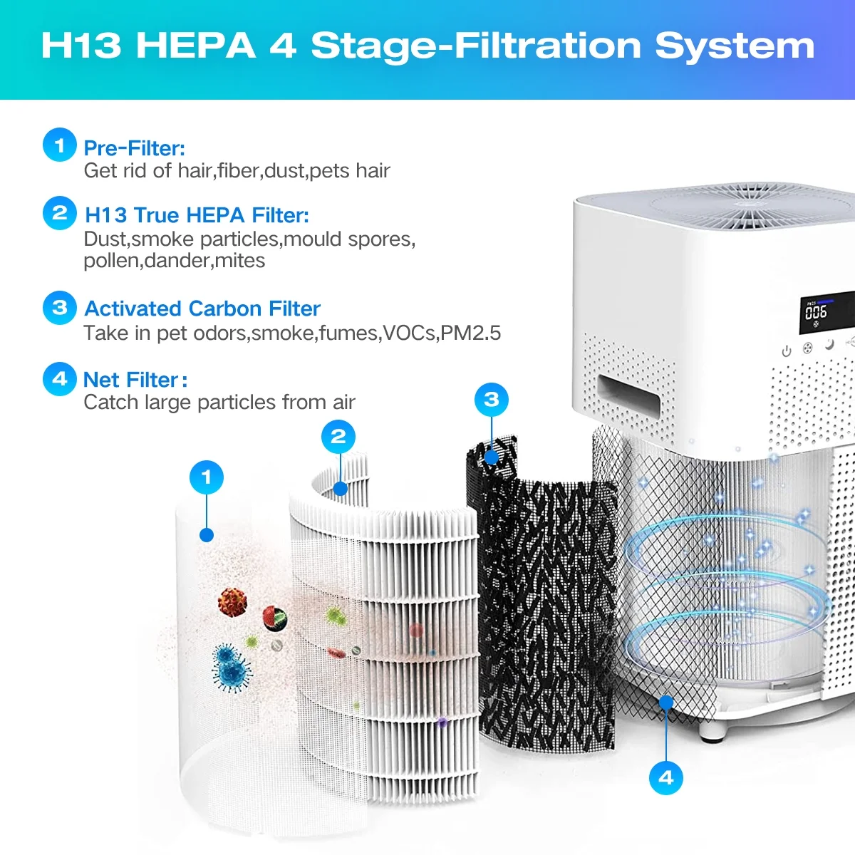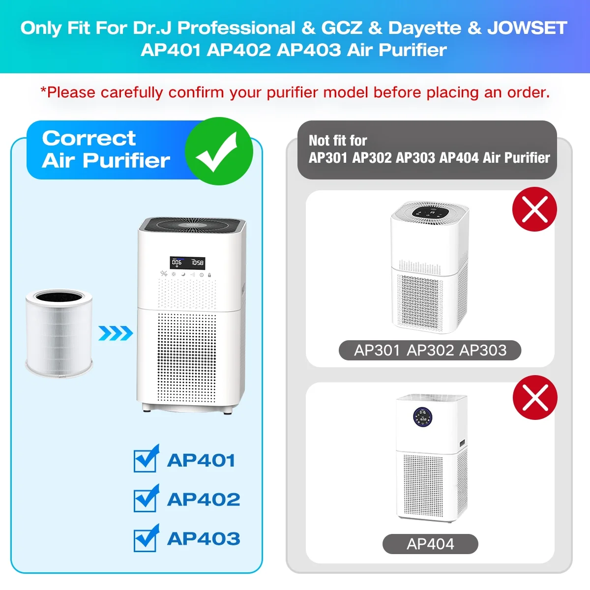 Compatible with Dr.J Professional AP401 AP402, GCZ AP402, Dayette AP401 AP402 and JOWSET AP402 AP403 Air Purifier 4-Stage Filtration System: Pre-Filter + H13 True HEPA Filter + Activated Carbon Filter + Net Filter AP401 AP402 filters have multi-layer protection of your air quality to keep your space stay fresh and create a quiet space for you to sleep more soundly!