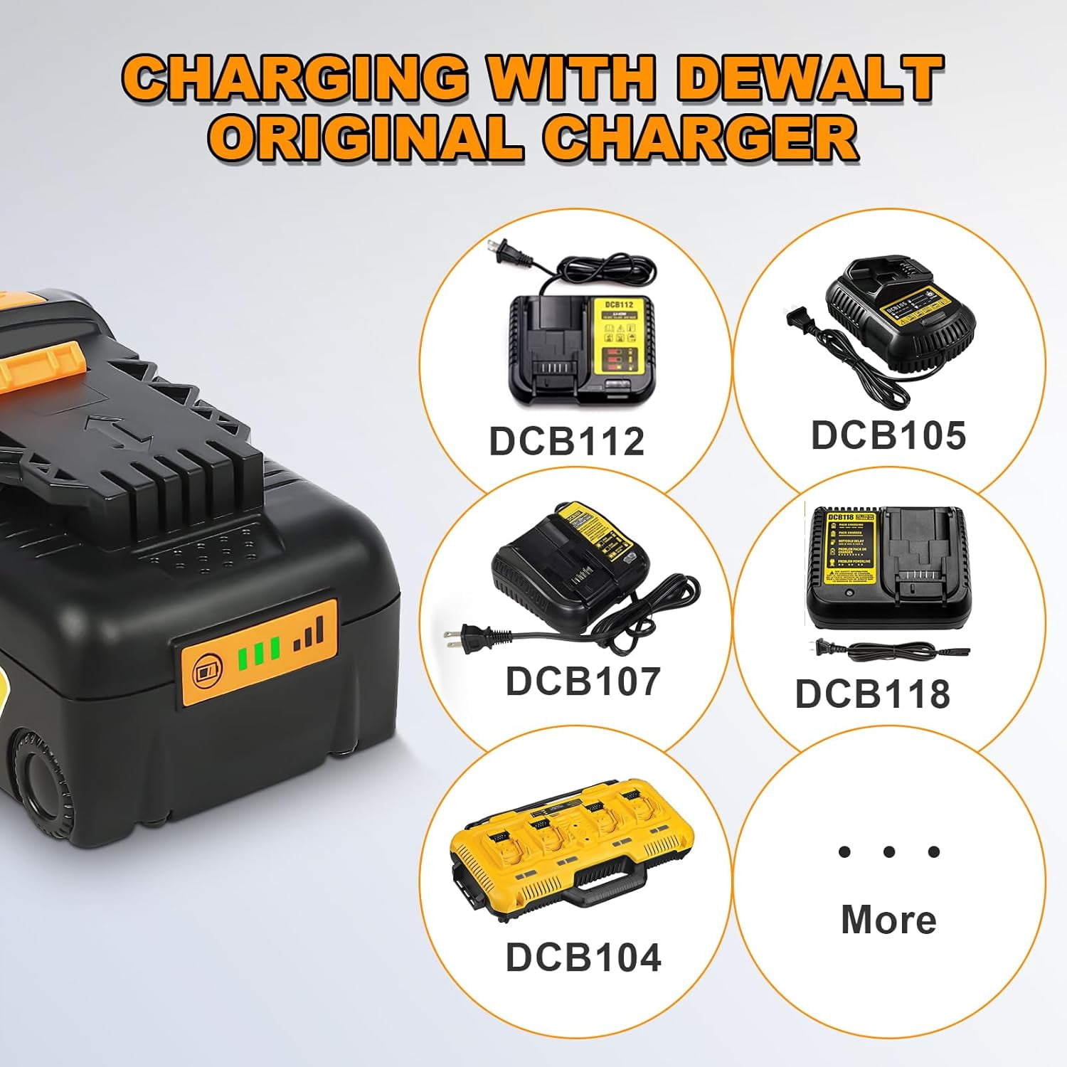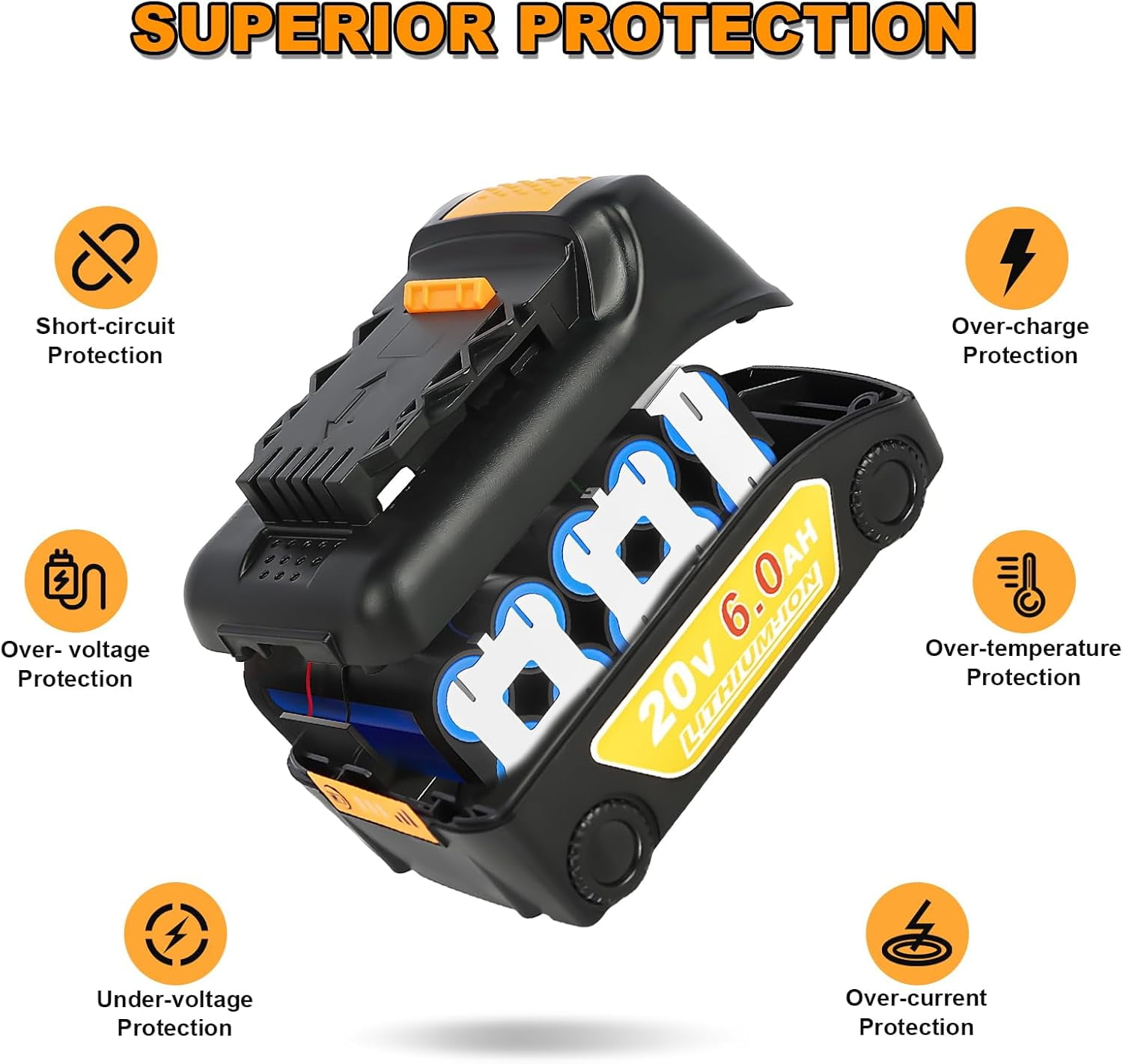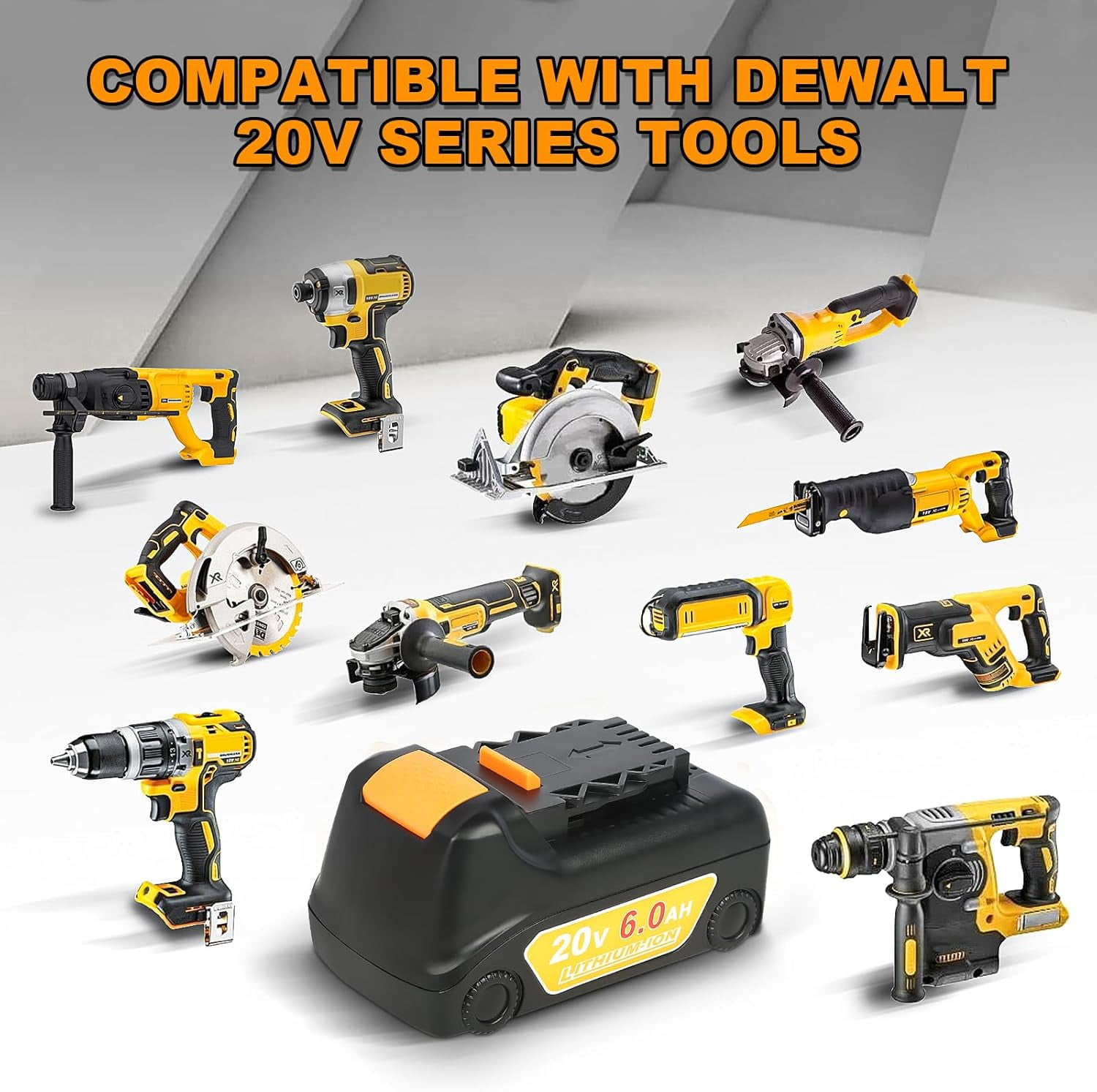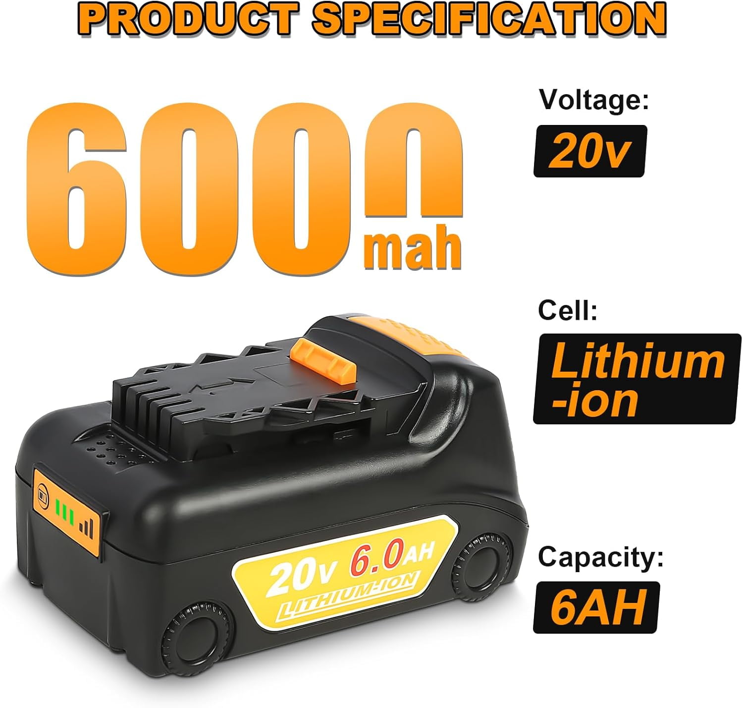 Brand New| Battery Type:Li-ion| Capacity:6.0Ah| Voltage:20V| Watts:120wh| 2 Pack 】:Replacement for Dewalt 20v batteries such as DCB204 DCB206 DCB200 DCB201 DCB203 DCB205 DCB207 DCB230-20V max cordless power tools, also Compatible with all original or third party 20v lithium battery chargers. Built with 3-LED Fuel Gauge System allows immediate feedback on state of charge. Over-charging, over-discharging, over-current and over-heating protections are programed in the battery, Battery case is made of ABS+PC materials, it’s sturdy and fire resistant with good heat dissipation.All this to promise safety use. : Safe guard features against incorrect voltage, battery overload, short circuit, internal overheating. Easy to install and remove. No memory effect, charging at any time will have no effect on the battery. : All of the products are certified by CE FCC, ROHS , tested by manufacturer to match Tools and exported all over the world. : No reason for a free return within , Product quality defects for free return within , Warranty within , any question, please feel free to contact us, customer service for your interest protection!!!