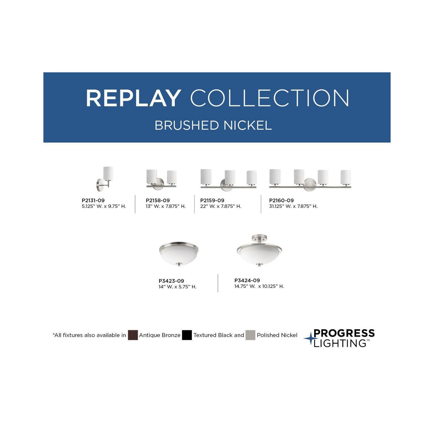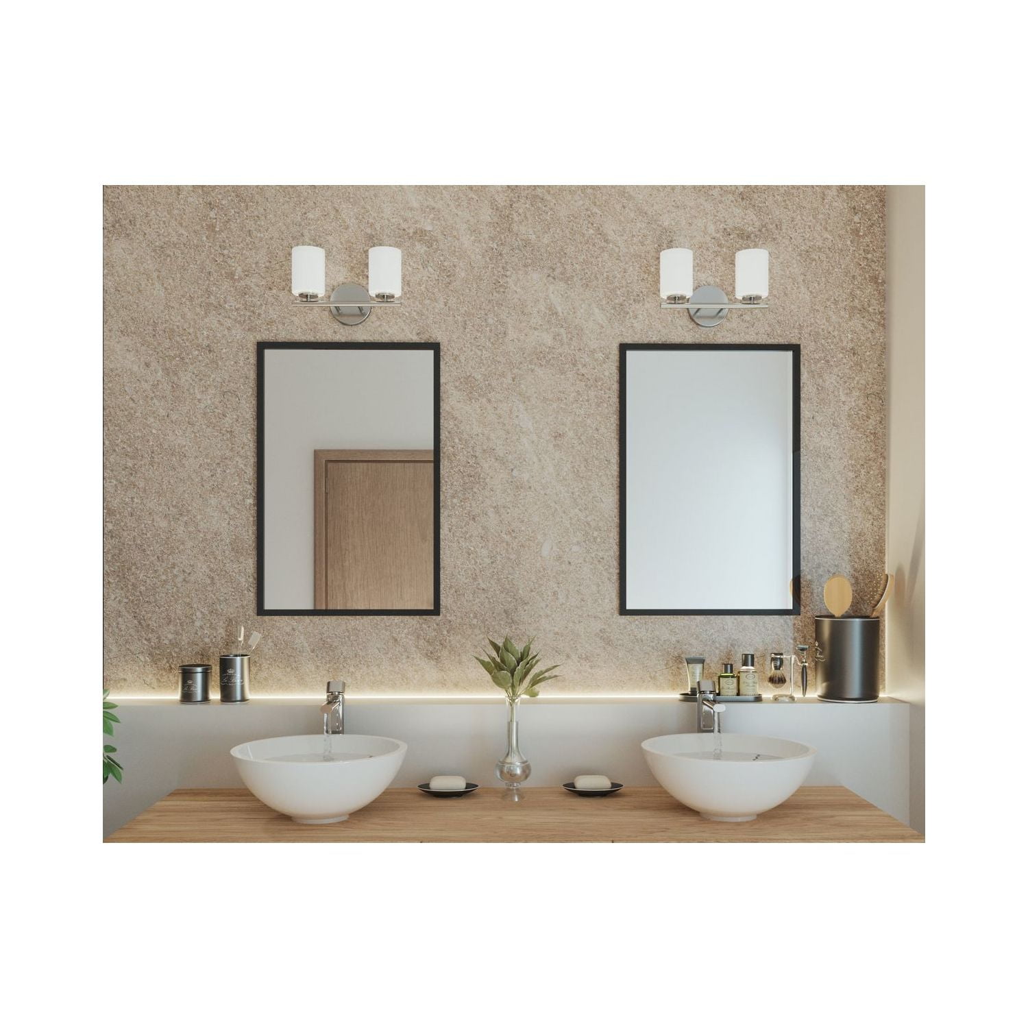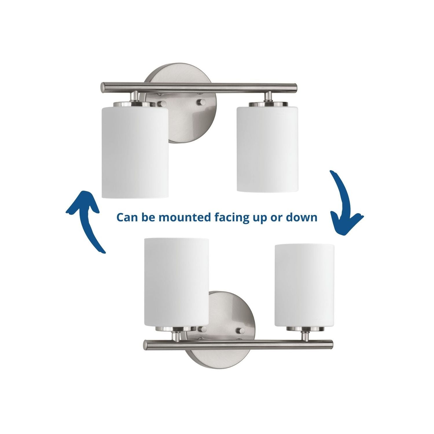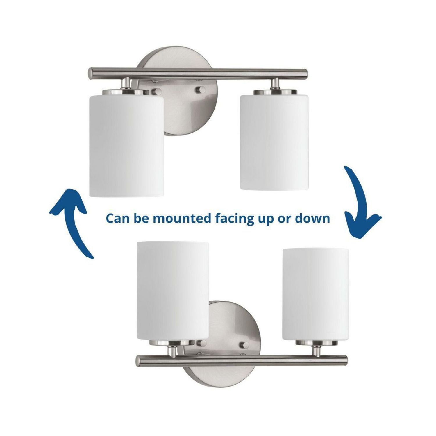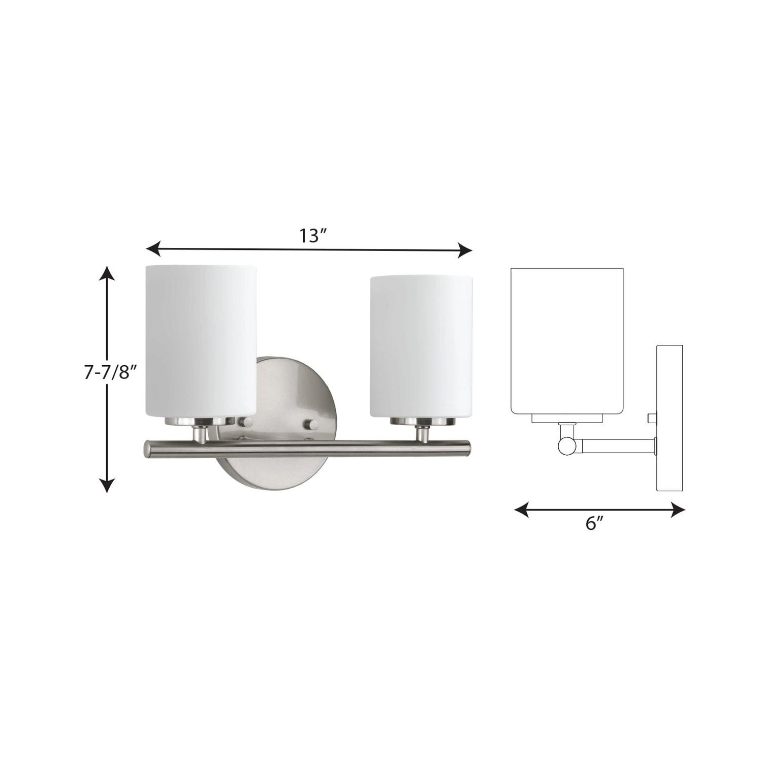 MODERN ELEGANT DESIGN: Fall in love with a lighting experience that epitomizes relaxed elegance by mingling functional design with subtle, sophisticated forms with the Replay collection’s modern two-light bath bracket ideal for any bath and vanity setting in coastal, luxury, modern, and transitional interiors CRISP ETCHED GLASS SHADES: Crisp, cylindrical etched glass shades elegantly rest on the metal light bases as they exude a quiet confidence ready to illuminate any tired mind or body in need of a restorative glow UNDERSTATED BRUSHED NICKEL FINISH: A smooth, circular backplate coated in an understated brushed nickel finish sets a tone of refined aesthetic taste as smooth bars conjoin at crisp right angles to hold small, circular light bases SIZE: 13-inch width, 7-7/8-inch height, extends 6-inch BULB TYPE: For optimal illumination, use two medium base bulbs that are sold separately (100w max – LED, CFL, halogen, or incandescent) fully dimmable with dimmable bulbs