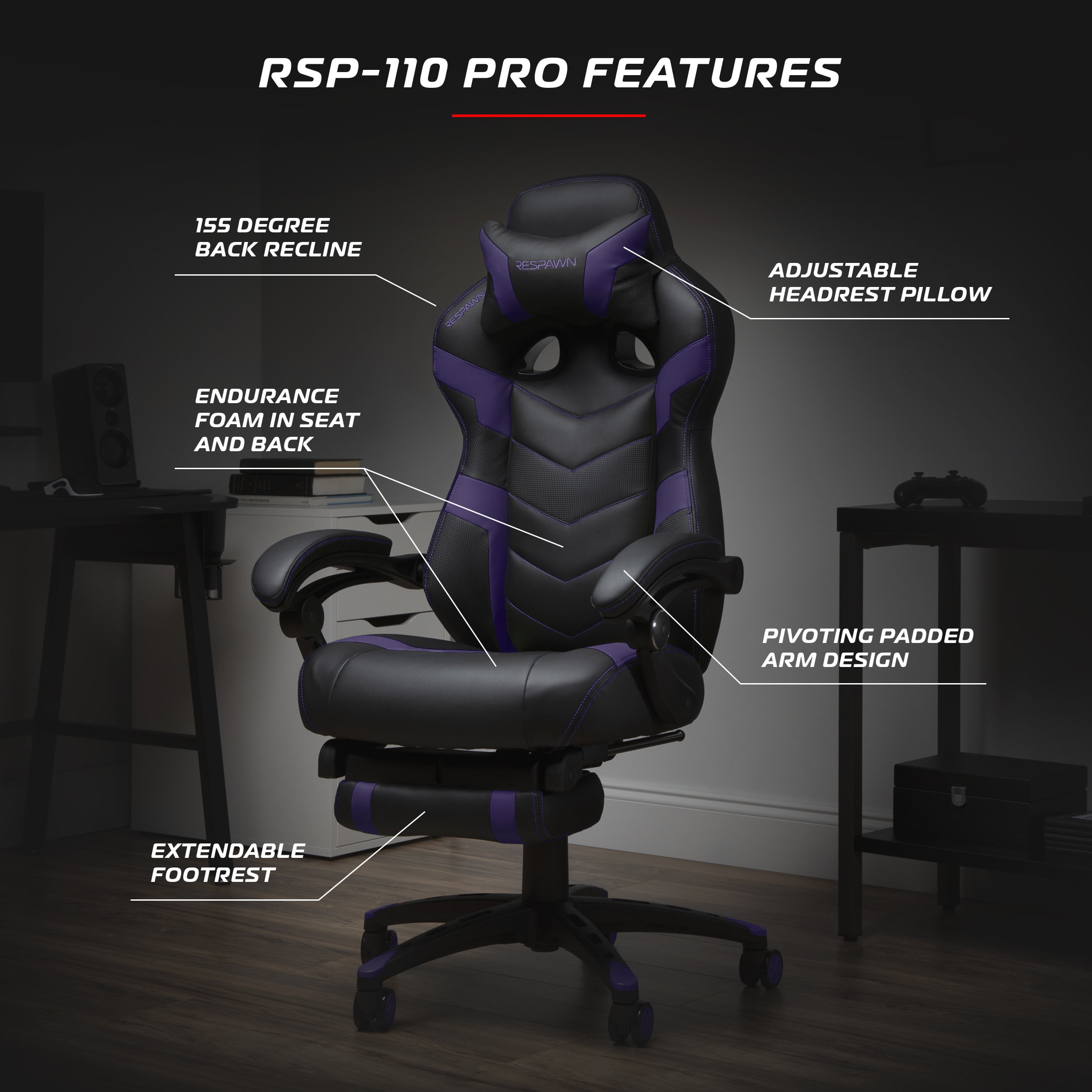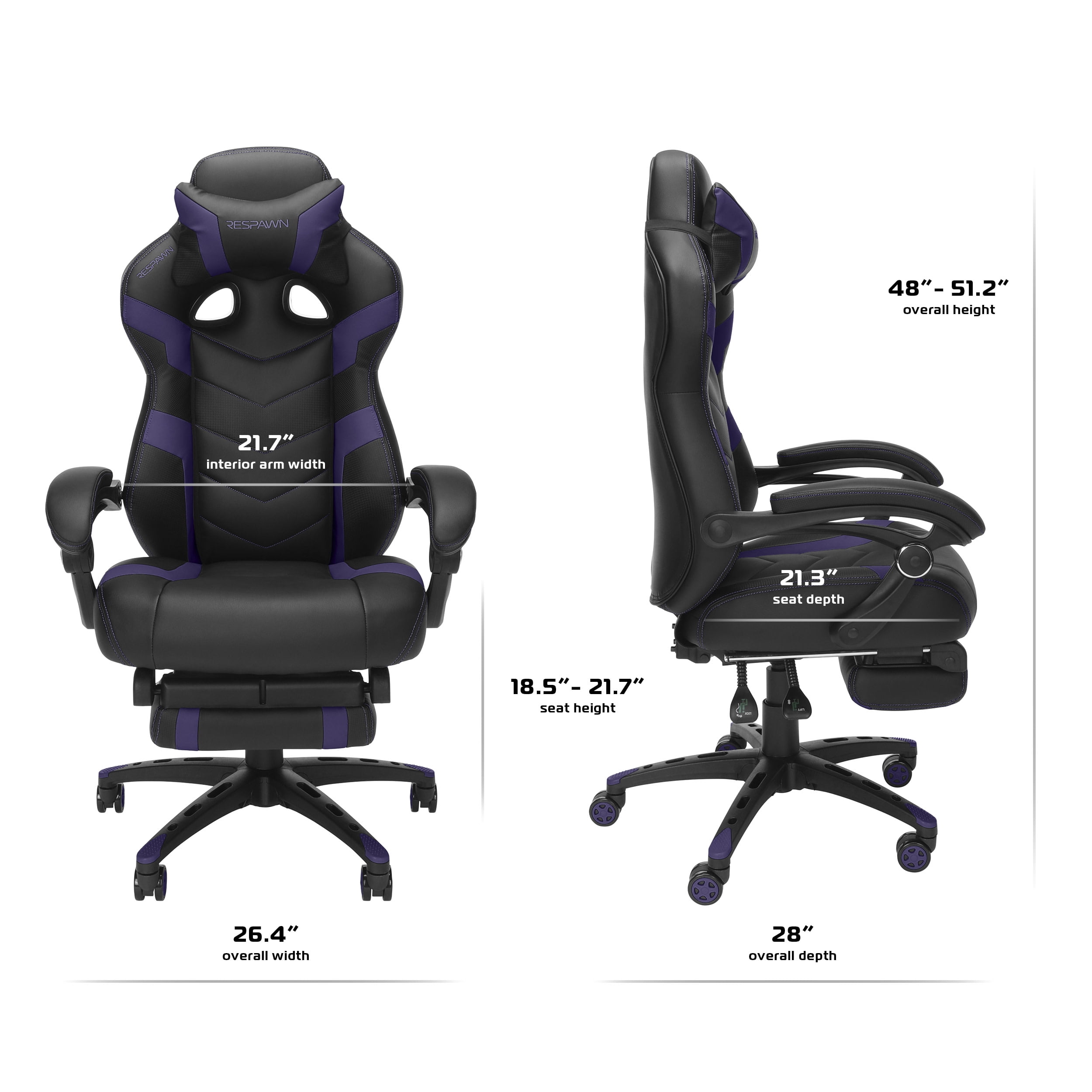 Gaming Chair with Footrest, Ergonomic Computer Desk Chair – Purple Elevating the gaming experience with a RESPAWN 110 PRO. It boasts an unmatched level of comfort with its luxuriously thick padding, wrapped in durable materials and highlighted by premium, eye-catching stitching. The design is not just about aesthetics; it embodies a commitment to gamers’ well-being and performance. Featuring a 155-degree tilt mechanism with an infinite angle lock, it empowers gamers to find their perfect position, enhancing focus and endurance during intense gaming battles.The chair doesn’t stop at ergonomic advancements; it introduces a built-in, extendable footrest, transforming any gaming setup into a haven of relaxation reminiscent of a high-end recliner. Lumbar support is taken to the next level with 2.75 inches of thick, dense foam, ensuring comfort through even the most grueling all-nighters. The seating experience is further enriched by a dual-layered foam construction, with a plush top for immediate comfort and a resilient bottom layer for enduring support. Adjustability is key in a premium gaming chair, and this model excels with a larger, adjustable headrest pillow and a pneumatic seat height adjustment, catering to a wide range of user heights and preferences. This chair is built to accommodate up to 275 lb, ensuring a robust option for gamers of all sizes. With over two decades of ergonomic workplace furniture expertise, the brand stands behind its gaming furniture’s durability and comfort. It’s not just about building a chair but about crafting a gaming companion that supports every victory. Backed by the RESPAWN 5-Year Limited Warranty and an award-nominated brand’s promise, this chair is not just built for gaming. It’s built for winners, ready to take on any challenge, providing an unmatched seating experience that’s as relentless in its pursuit of comfort as gamers are in their quest for victory. This gaming chair for adults is bigger and better with more durable, thicker segmented padding with 2 layers of higher density foam support for a long term, upgraded seating experience. CUSTOMIZE YOUR COMFORT: Full control is in your hands with our adjustable 155 degree reclining backrest, height and tilt mechanism, and linked armrest to provide full support when reclining MASTER YOUR GAMING SESSIONS: Dive deep into gaming marathons with unmatched comfort using our video gaming chair with footrest that contains a built-in extendible footrest beneath the seat for when you need it and neatly folds back up when you don’t FROM WORK TO PLAY, we’ve got you covered DURABLE GAMING CHAIRS: This heavy duty chair has a 275 lb weight capacity for long-lasting use WARRANTY & SUPPORT: Jump right into the action with our easy-to-follow assembly guide as smooth as your gameplay. Relax knowing this racing desk chair is backed by the RESPAWN 5-Year Limited Warranty. Game on with peace of mind