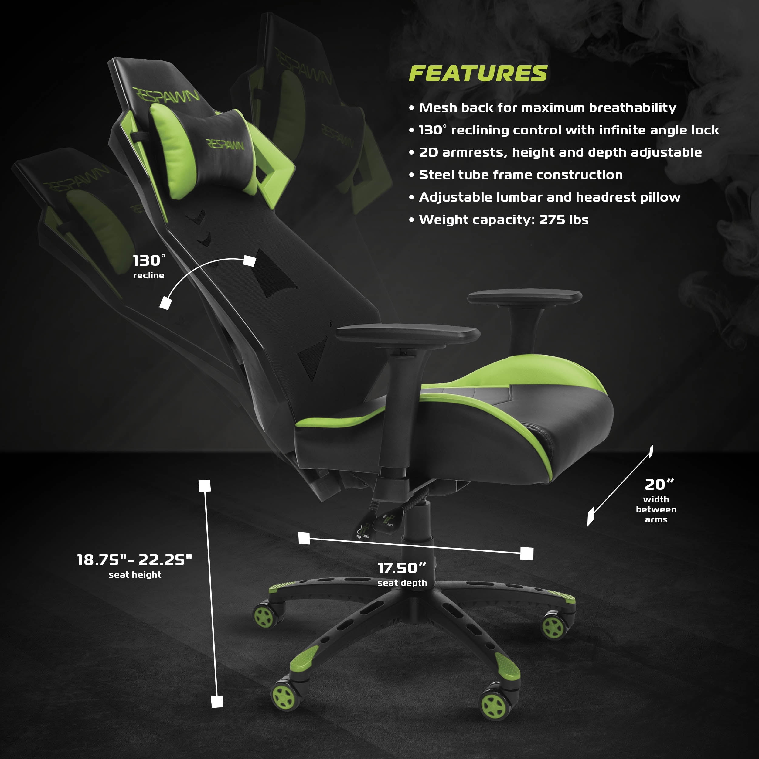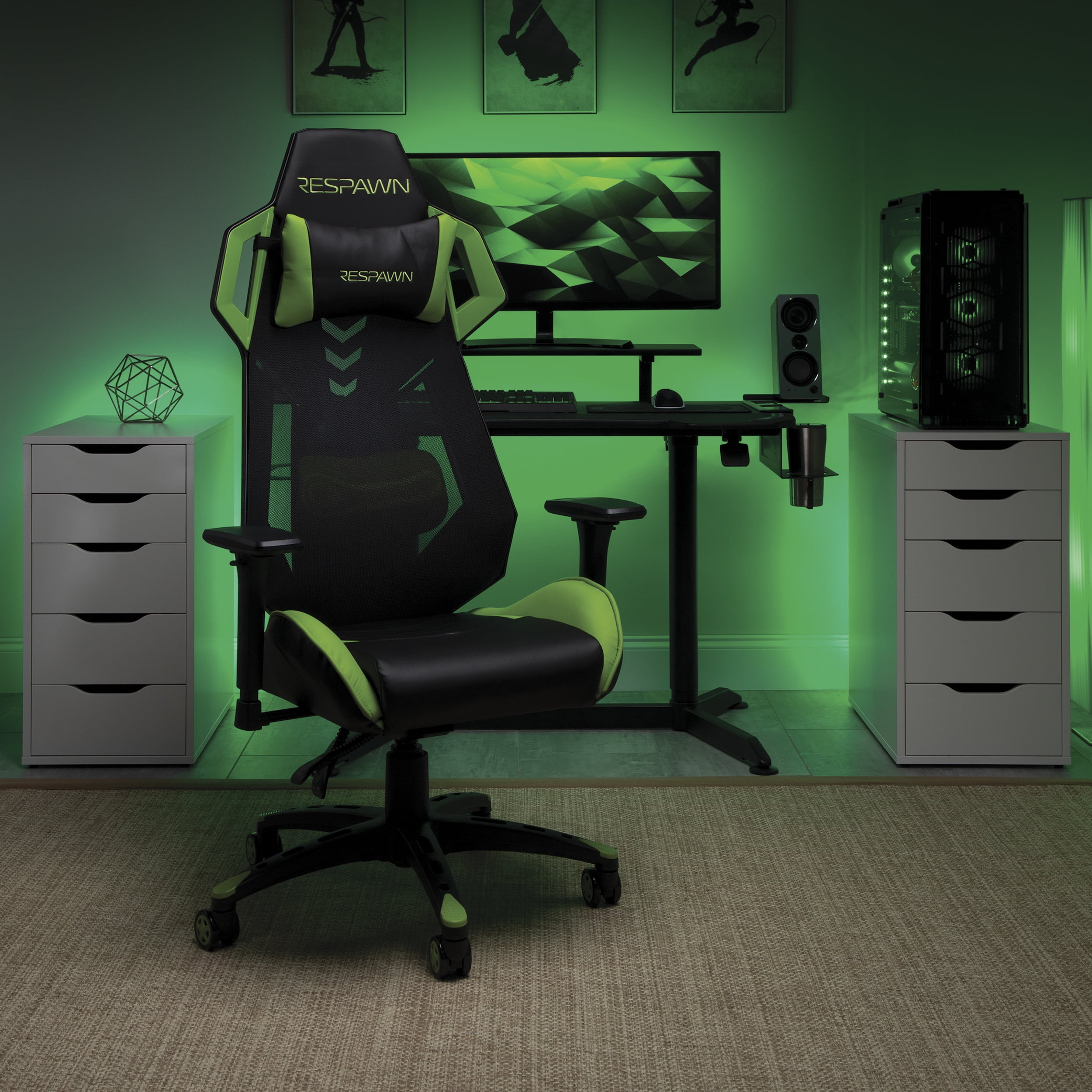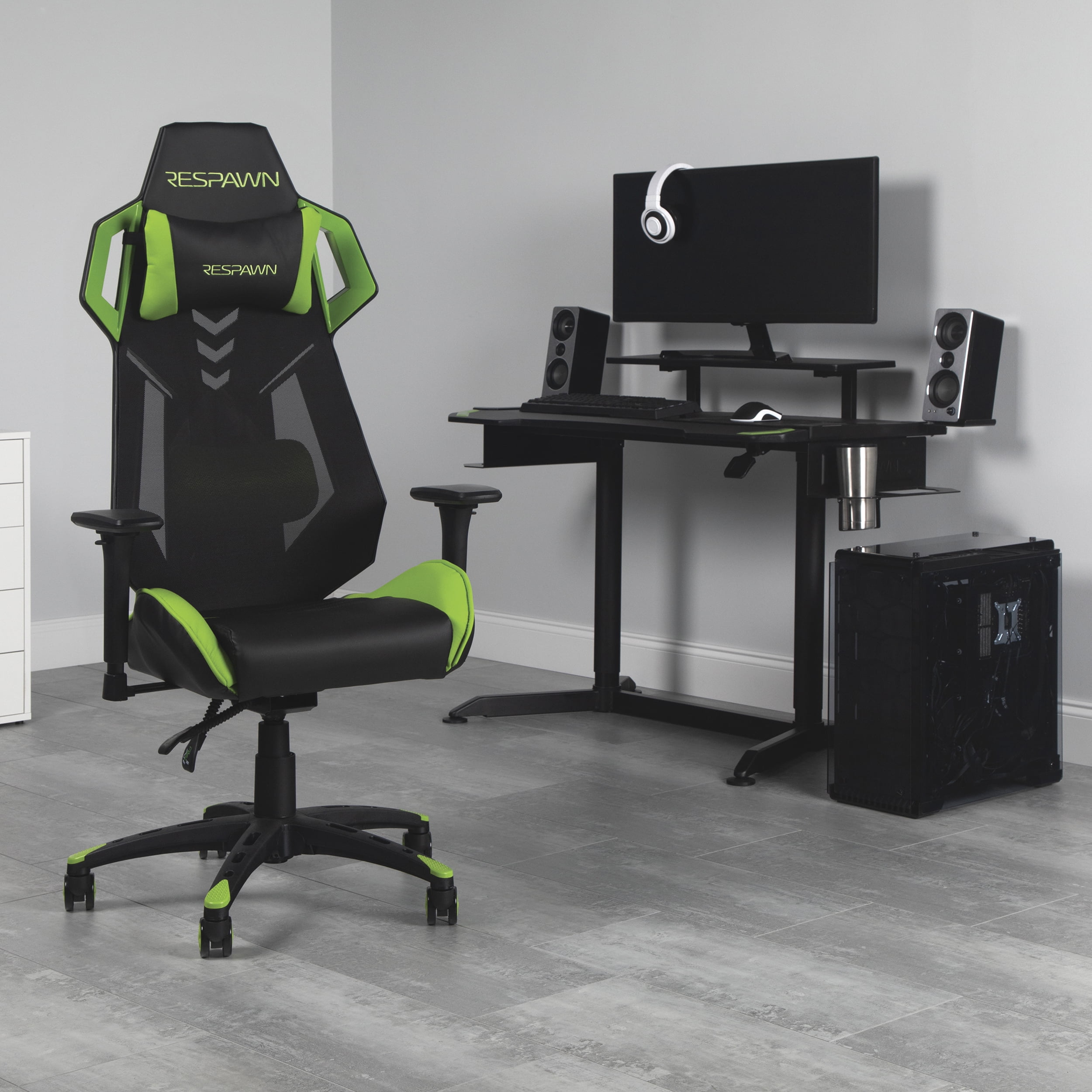When the game heats up, stay calm and cool with the RESPAWN 200 mesh back gaming chair, in green. Featuring an innovative mesh backing, with a bonded leather seat, the RSP-200 helps keep you cool with maximum breathability. The tilt and lift controls are located to the right, beneath the seat base, and the gaming chair features a tilt tension adjustment to control the speed of the 130-degree recline. The lumbar support is behind the mesh seat back and adjusts up and down, as well as pivots, allowing you to position it for the most comfort. The armrests are height adjustable and the seat can hold up to 275 lb. With 25 years of ergonomic workplace furniture experience, RESPAWN builds gaming furniture that is both durable and comfortable. If you’re looking to stay cool, even during a heated match, the RSP-200 is your chair to pull off the win.